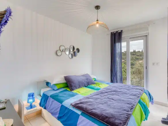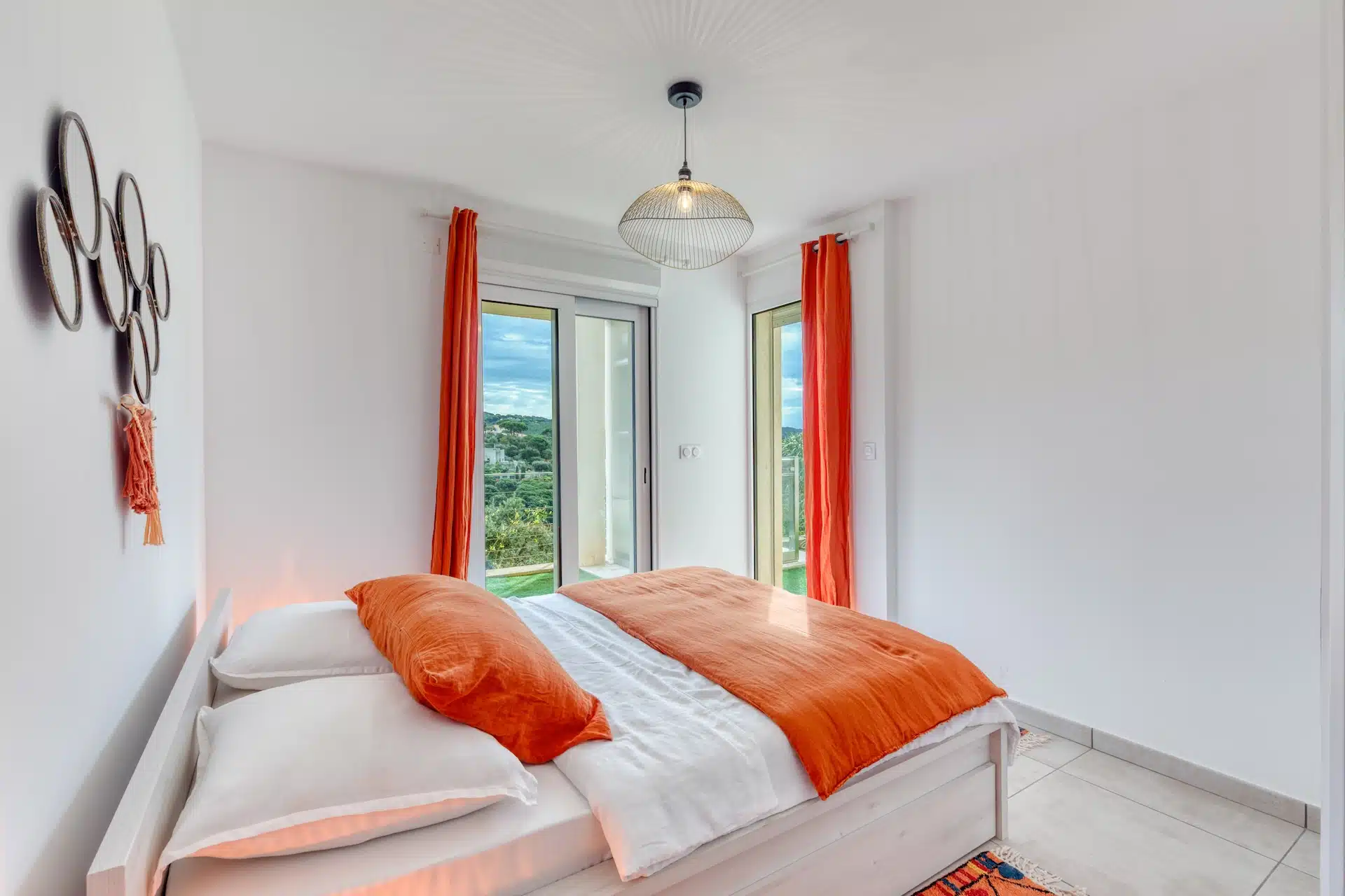 Bedroom 2: Queen bed (160×200 cm), en-suite bath, air conditioning, private terrace.