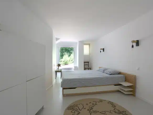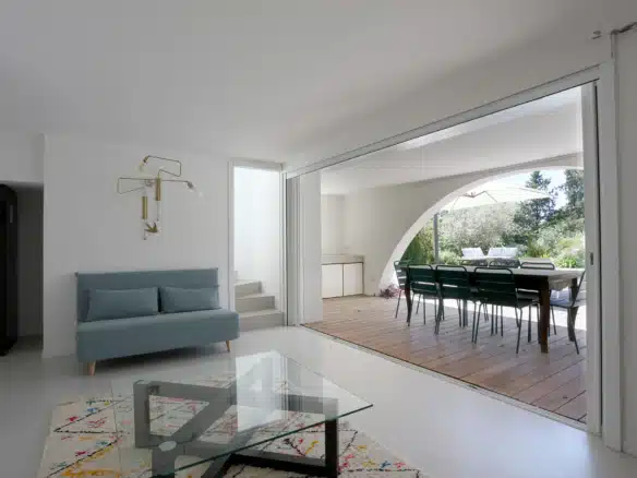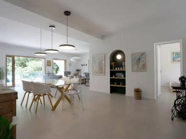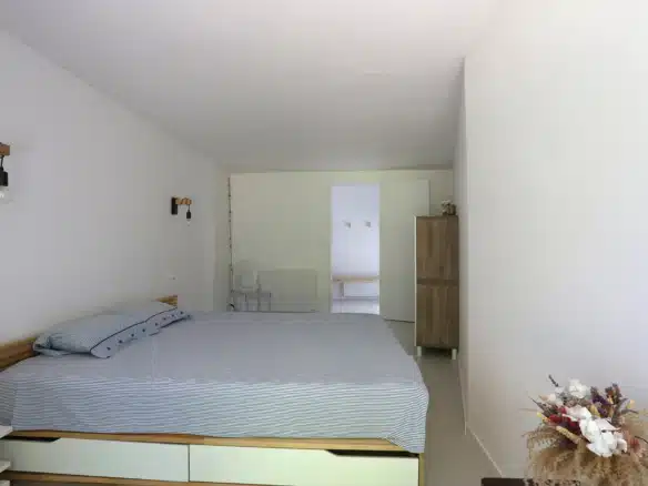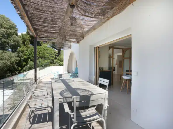 The lower level of the villa offers another double bedroom with a spacious private shower room and a cozy seating room that opens onto a covered terrace. Here, you will find another dining table, ideal for enjoying meals in the shade.