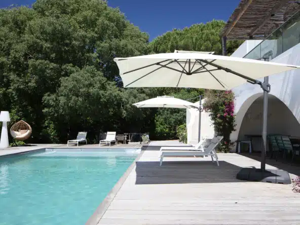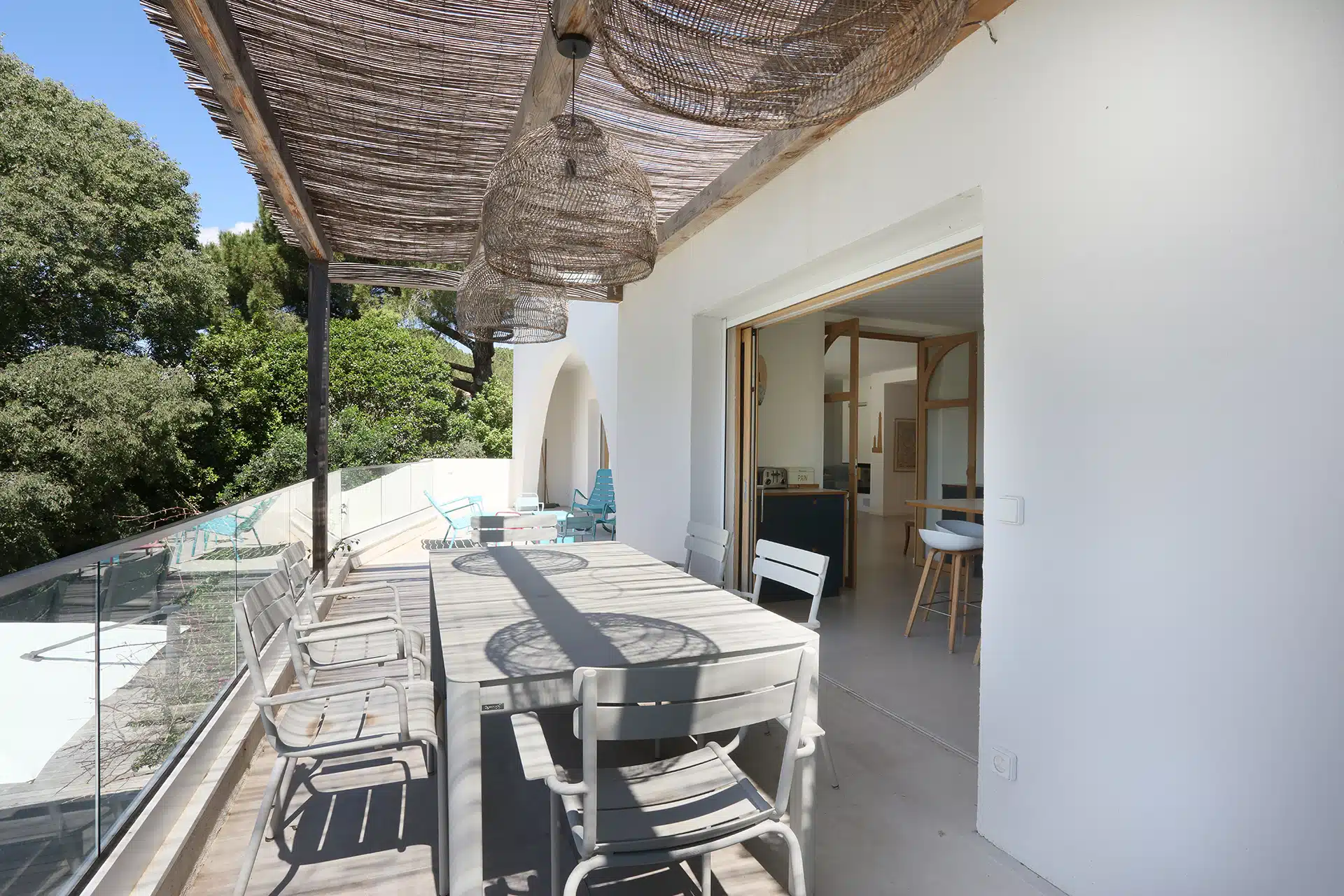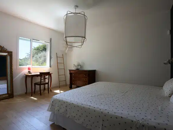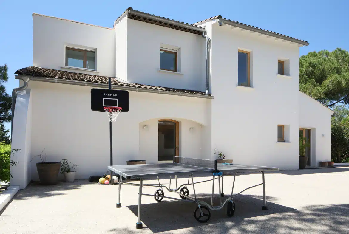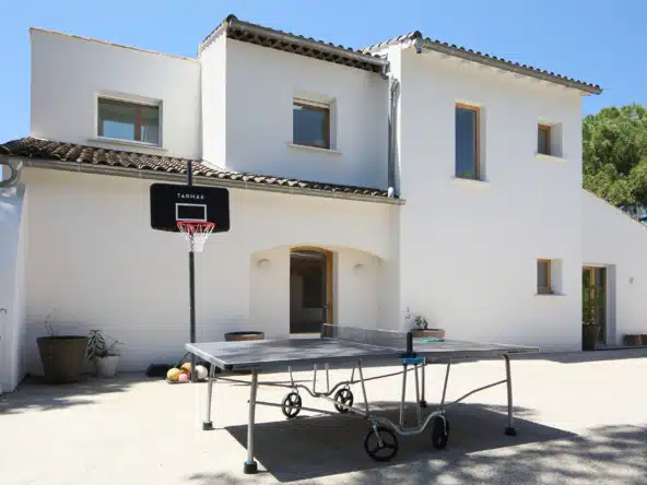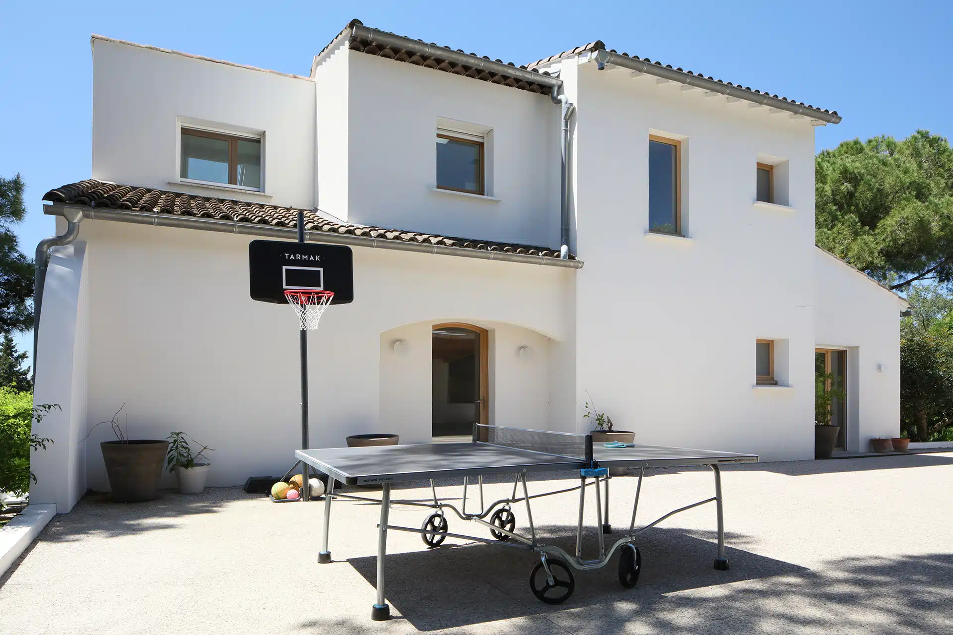 The expansive garden is a haven for those seeking peace and relaxation. Under the shade of a majestic oak tree, a barbecue corner with a dining table provides the perfect spot for memorable alfresco dinners. For entertainment, Villa Ibiza features a brand-new pétanque court, a basketball net, and a ping-pong table, ensuring fun for all ages.