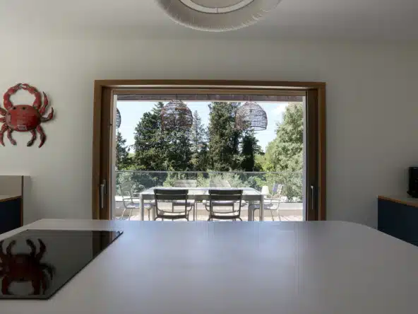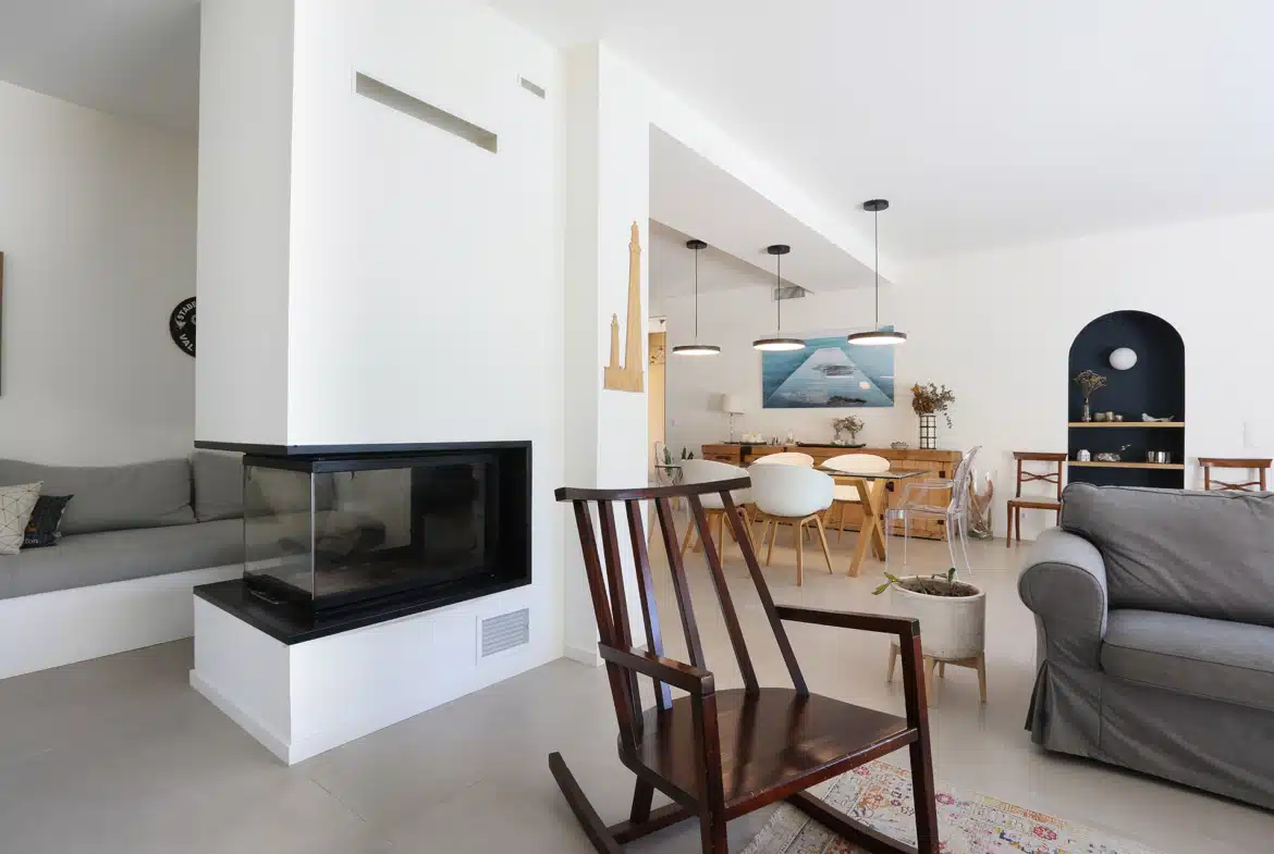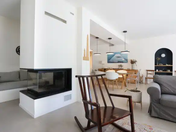 The entrance level greets you with a stylish hallway leading to the main living area, complete with a dining area, cozy seating around a fireplace, and a TV corner. Expansive bay windows flood the space with natural light and provide seamless access to the terrace, where a dining table awaits for alfresco meals with a view. Adjacent to the living room, the fully equipped kitchen features a central island and also opens onto the terrace through wide sliding windows, ensuring that cooking and socializing are a breeze.