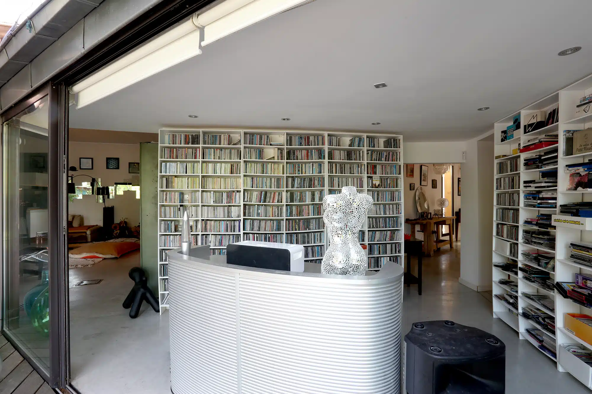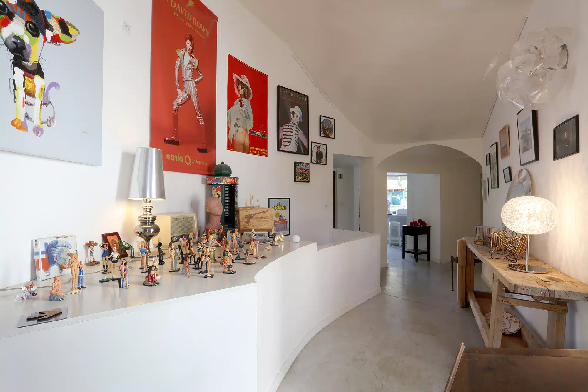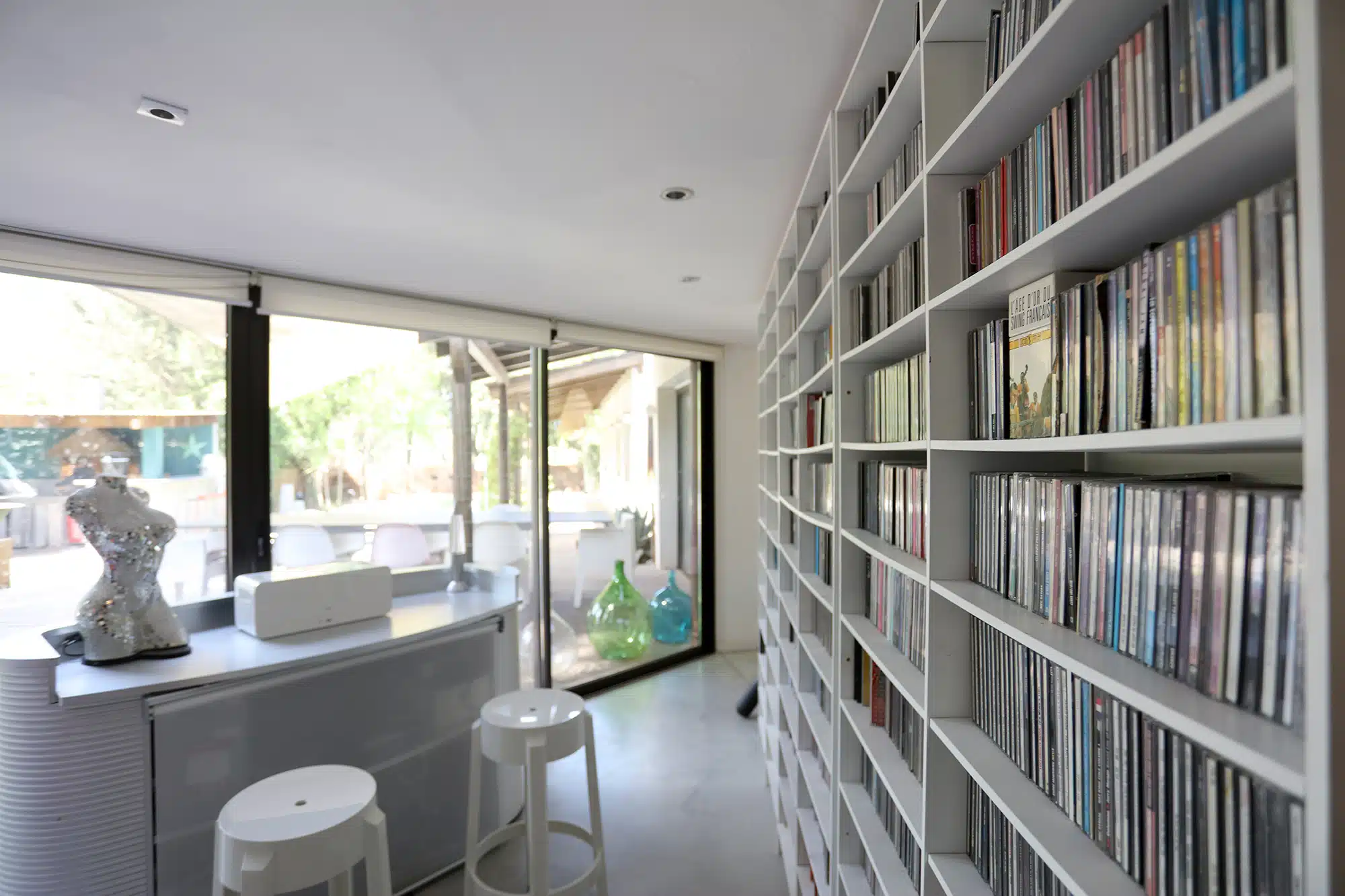 A staircase from this wing descends to a lower level, unveiling a spacious playroom which opens onto the garden through large sliding windows. Stocked with a variety of board games, as well as a foodball table, pool table, ping-pong table, and an air-hockey table, this room offers endless hours of entertainment for guests.