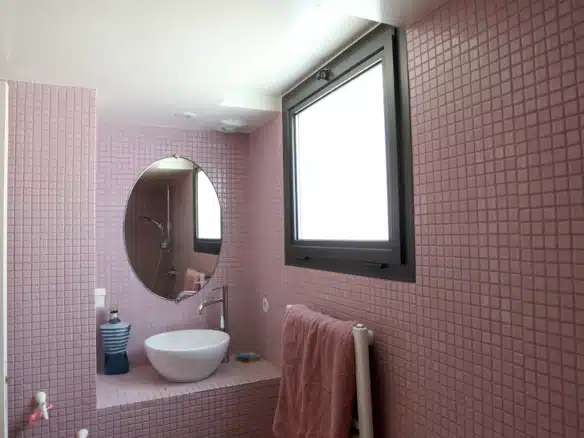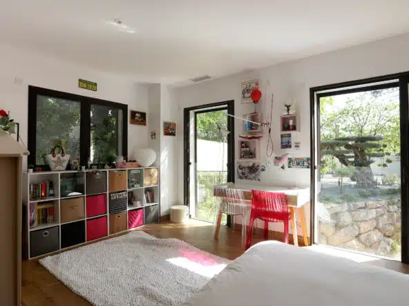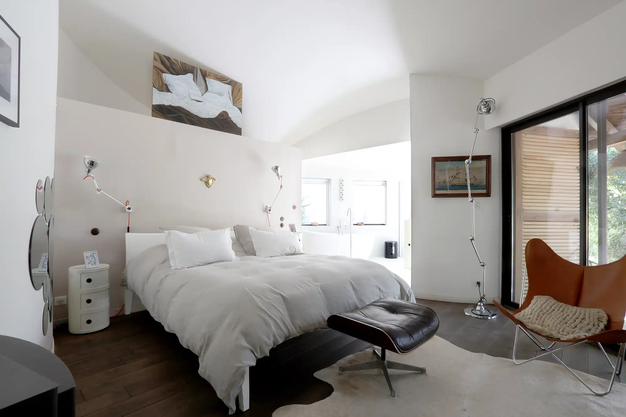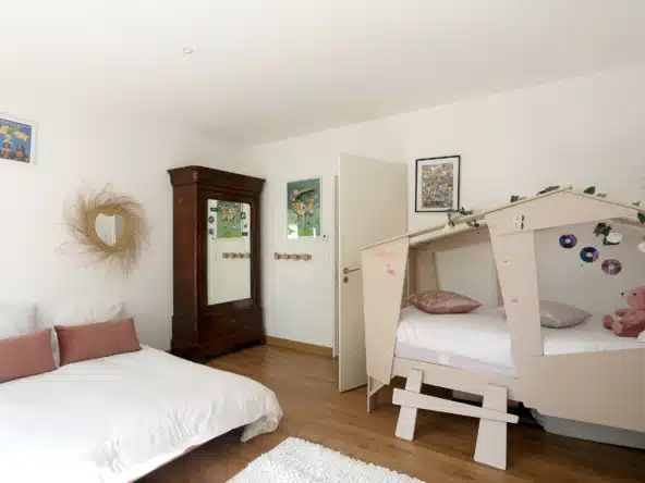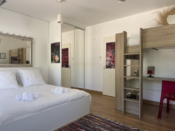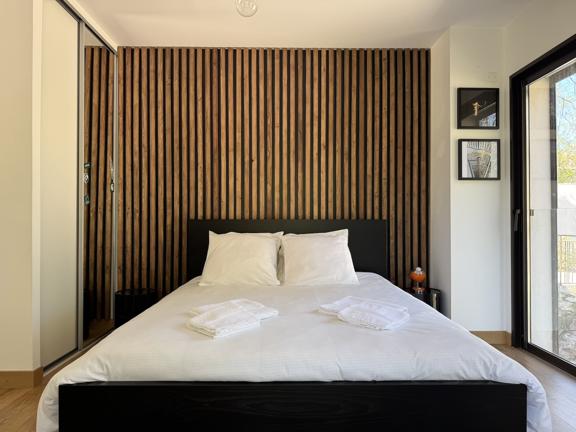The first bedroom, accessible from the dining area, boasts a king-size bed and benefit from a refreshing radiant cooling floor. It also features a private en-suite bathroom with shower room with toilet, along with a wooden terrace overlooking the sports grounds.