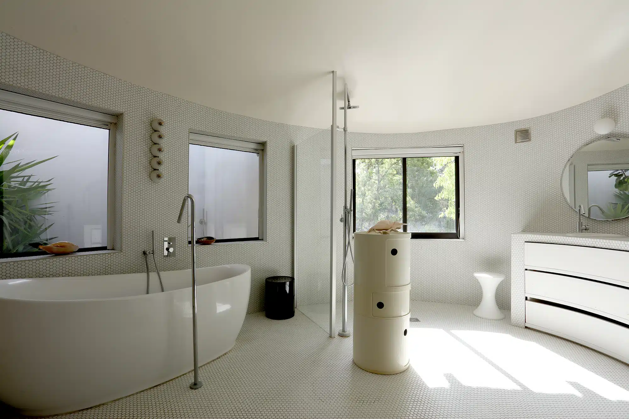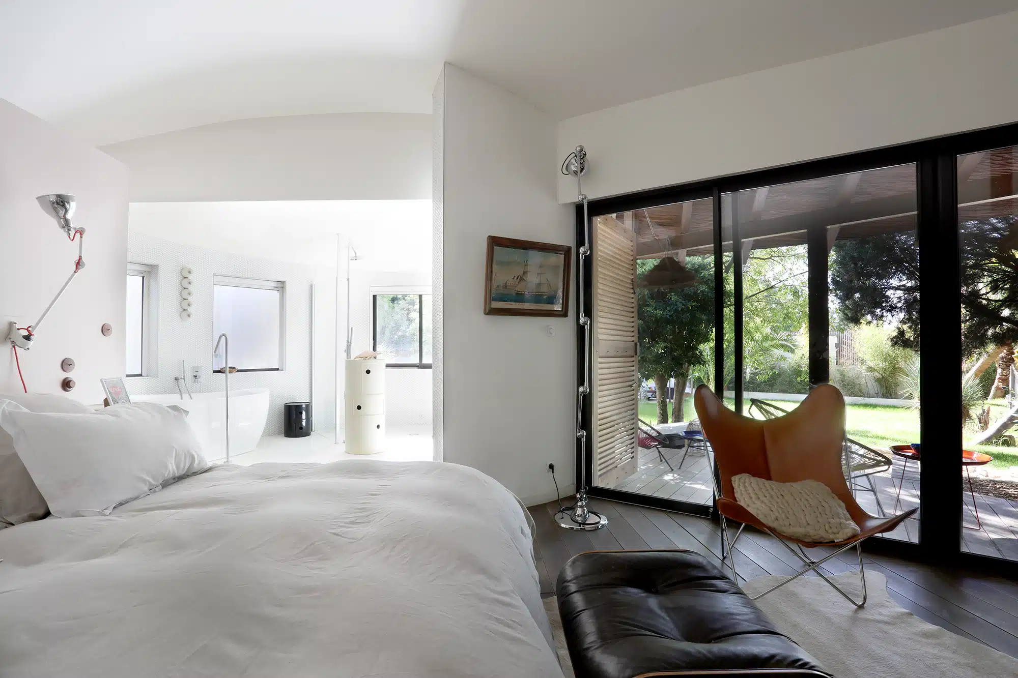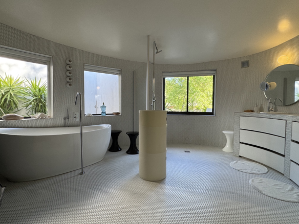On the other side of the living room, a corridor leads to the master suite, equipped with radiant floor cooling system, a wall-mounted TV, and a king-size bed. It opens onto a wooden terrace with a jacuzzi overlooking the verdant garden, as well as a spacious bathrooom with both an island bathtub and a walk-in shower.
