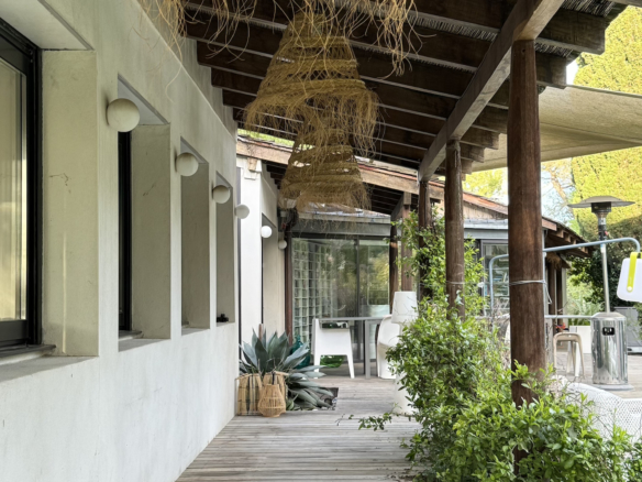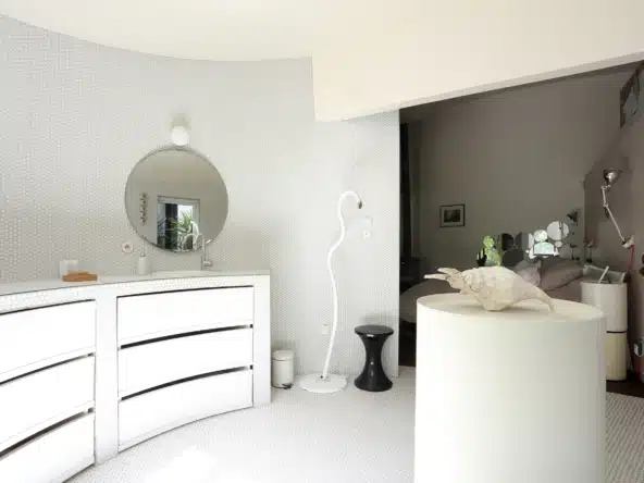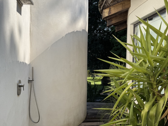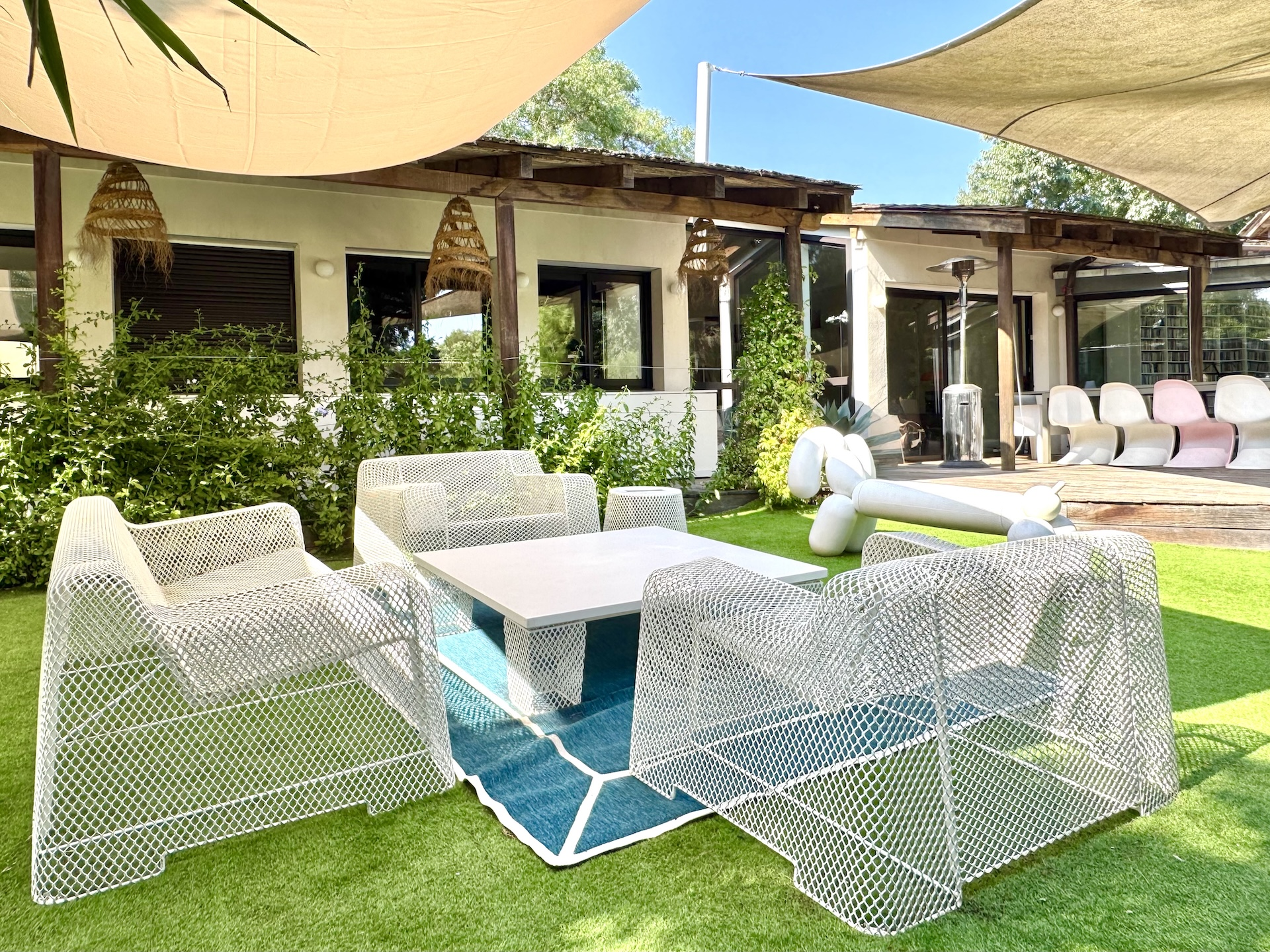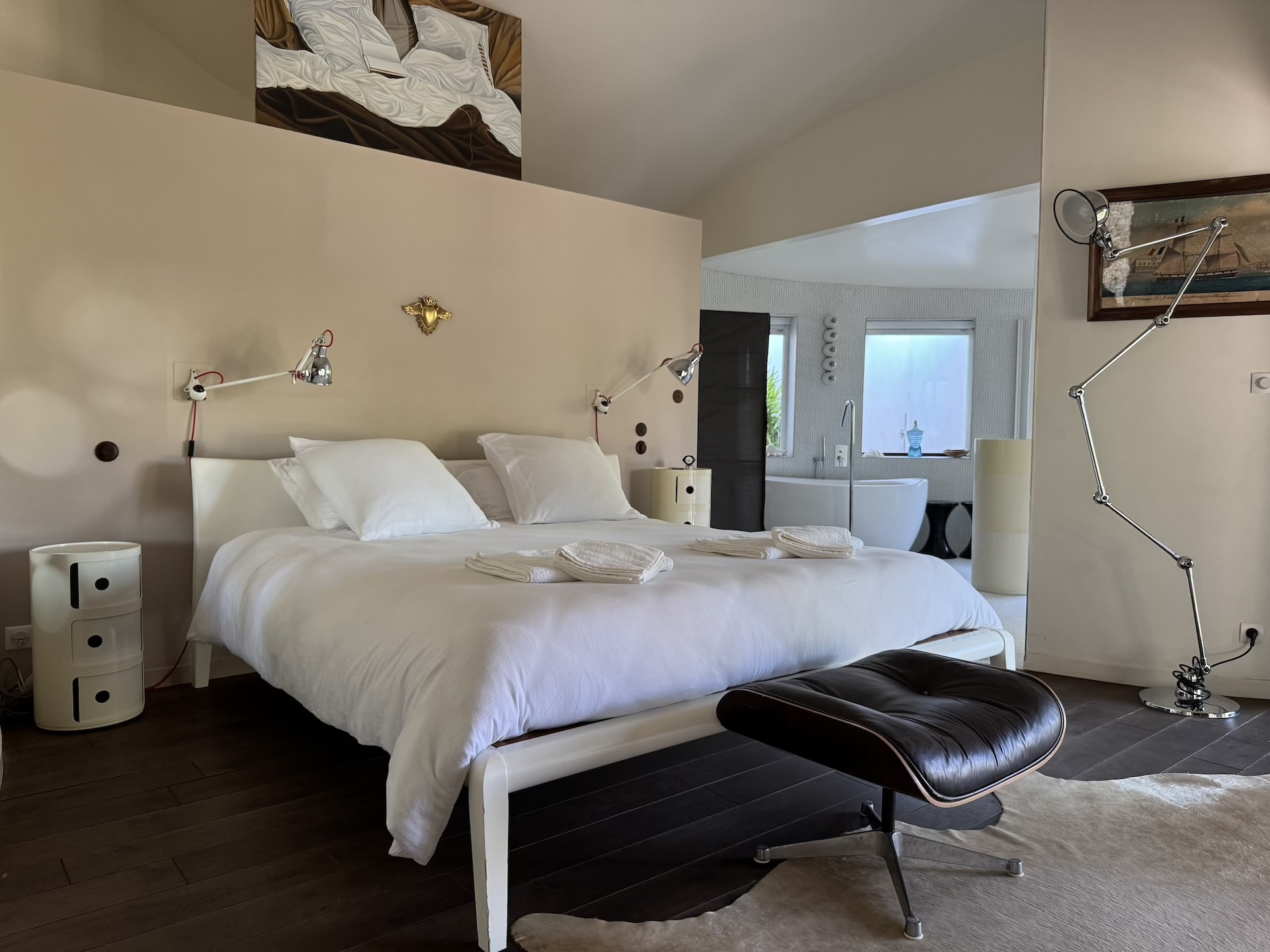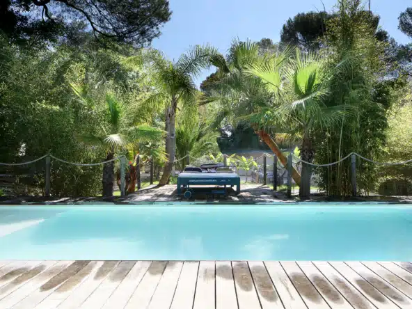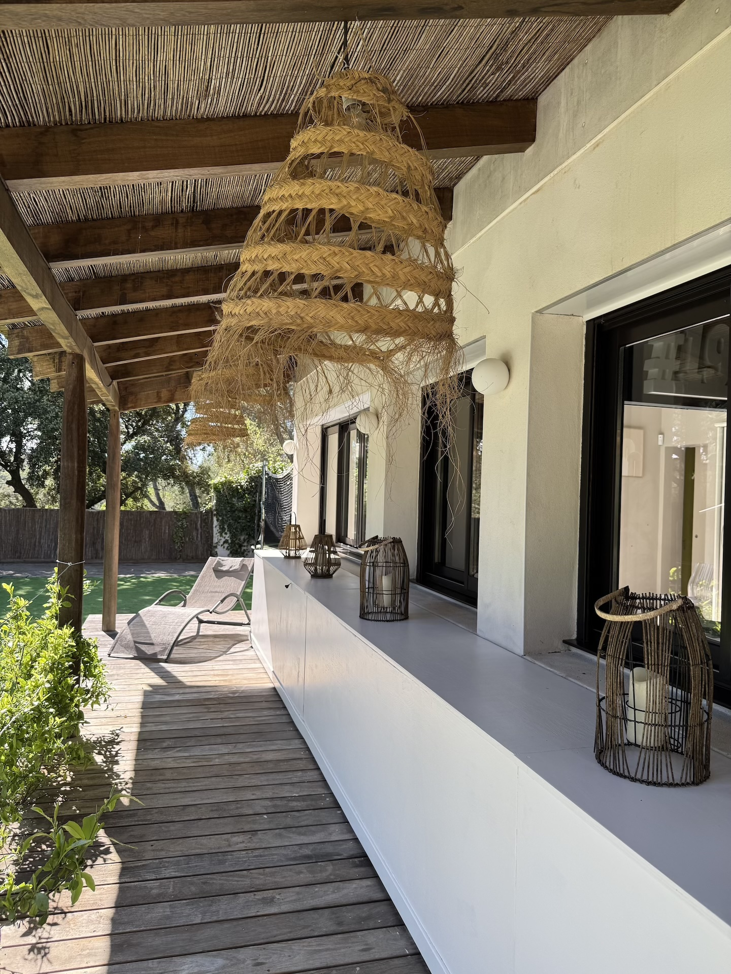 Step outside of the villa to explore a lush garden, adorned with palm trees and exotic plants. Opposite the living room, an outdoor dining area for 12 is sheltered by a sunshade sail. Facing the house, the pool crowns ttha garden with its generous dimensions (11m x 4m x 1.5m). It is surrounded by a wooden deck fitted with sun loungers and a Balinese daybed for ultimate relaxation. At night, extterior lighting transforms the garden into a true paradise under the stars, inviting you to extend the gentle summer evenings.