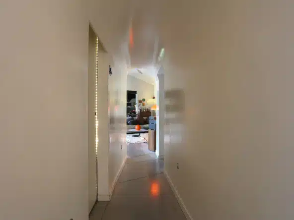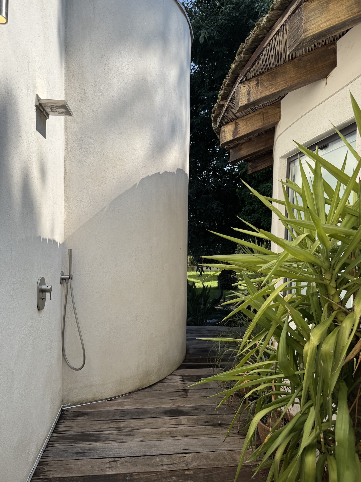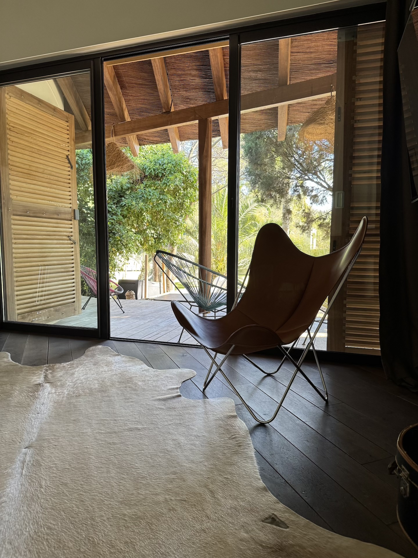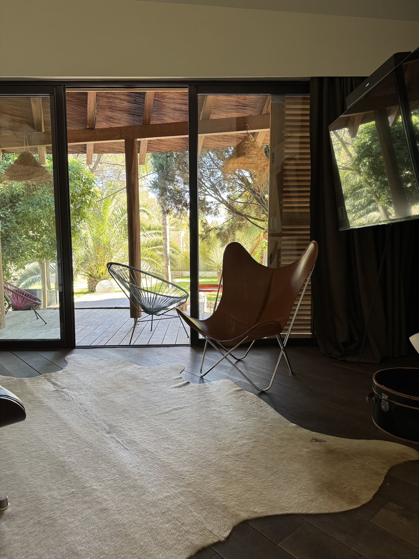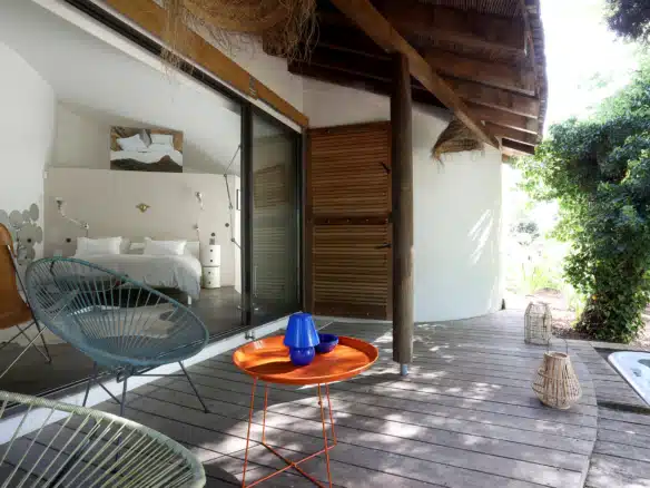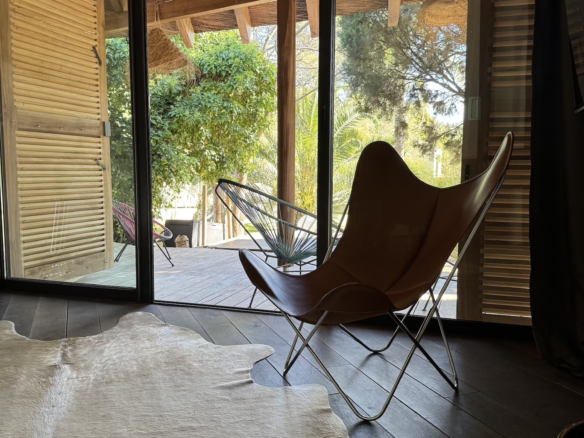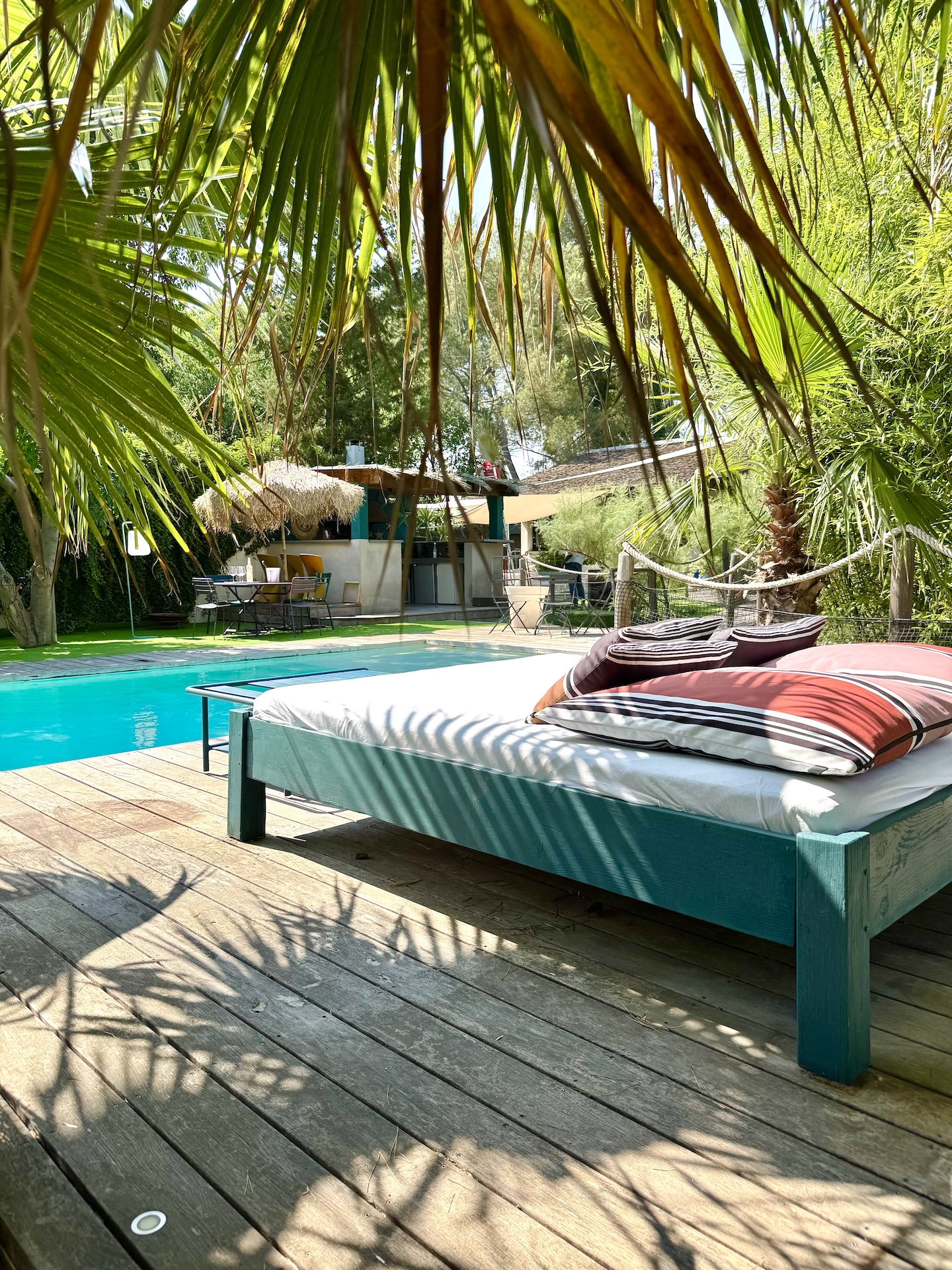 Un hall d’entrée aux allures ‘rock and roll’ mène à une aile climatisée ou se trouvent deux autres chambres, chacune équipée d’un canapé lit double en 140cm de large et d’un lit simple en bois pour enfant, ces deux chambres partagent une salle d’eau avec douche intérieure et extérieure.