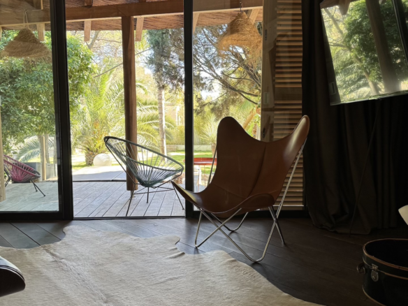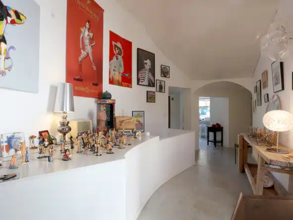 À l’intérieur, un vaste salon baigné de lumière naturelle vous accueille avec sa hauteur sous plafond imposante et son sol rafraichissant. Les larges baies vitrées s’ouvrent sur une terrasse ensoleillée et un jardin exotique de 2000 mètres carrés, créant ainsi une harmonie parfaite entre l’intérieur et l’extérieur.