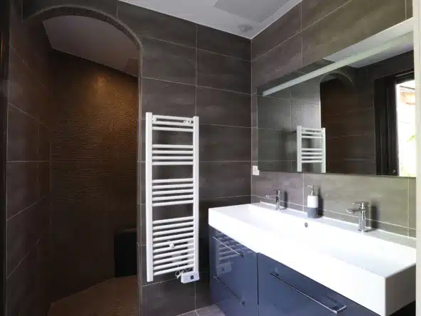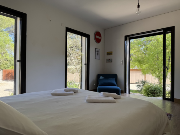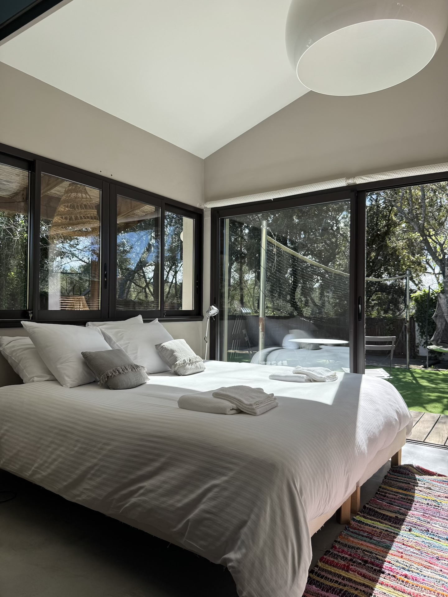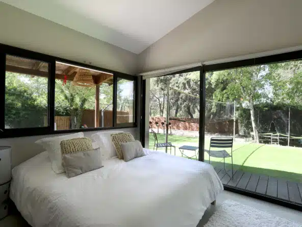 De l’autre côté du salon se trouve la suite principale, équipée d’un sol rafraîchissant, d’une télévision murale et d’un lit double de 180 cm par 200 cm. Elle offre une terrasse en bois surplombant le jardin, où se trouve un jacuzzi, ainsi qu’une grande salle de bain avec une belle baignoire îlot, une douche à l’italienne et de magnifiques vues sur la nature.