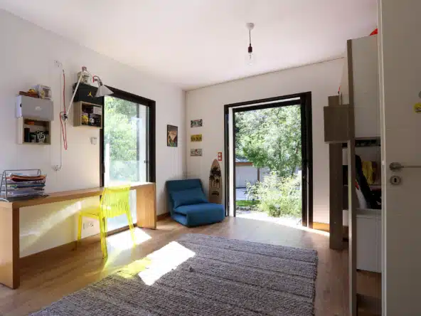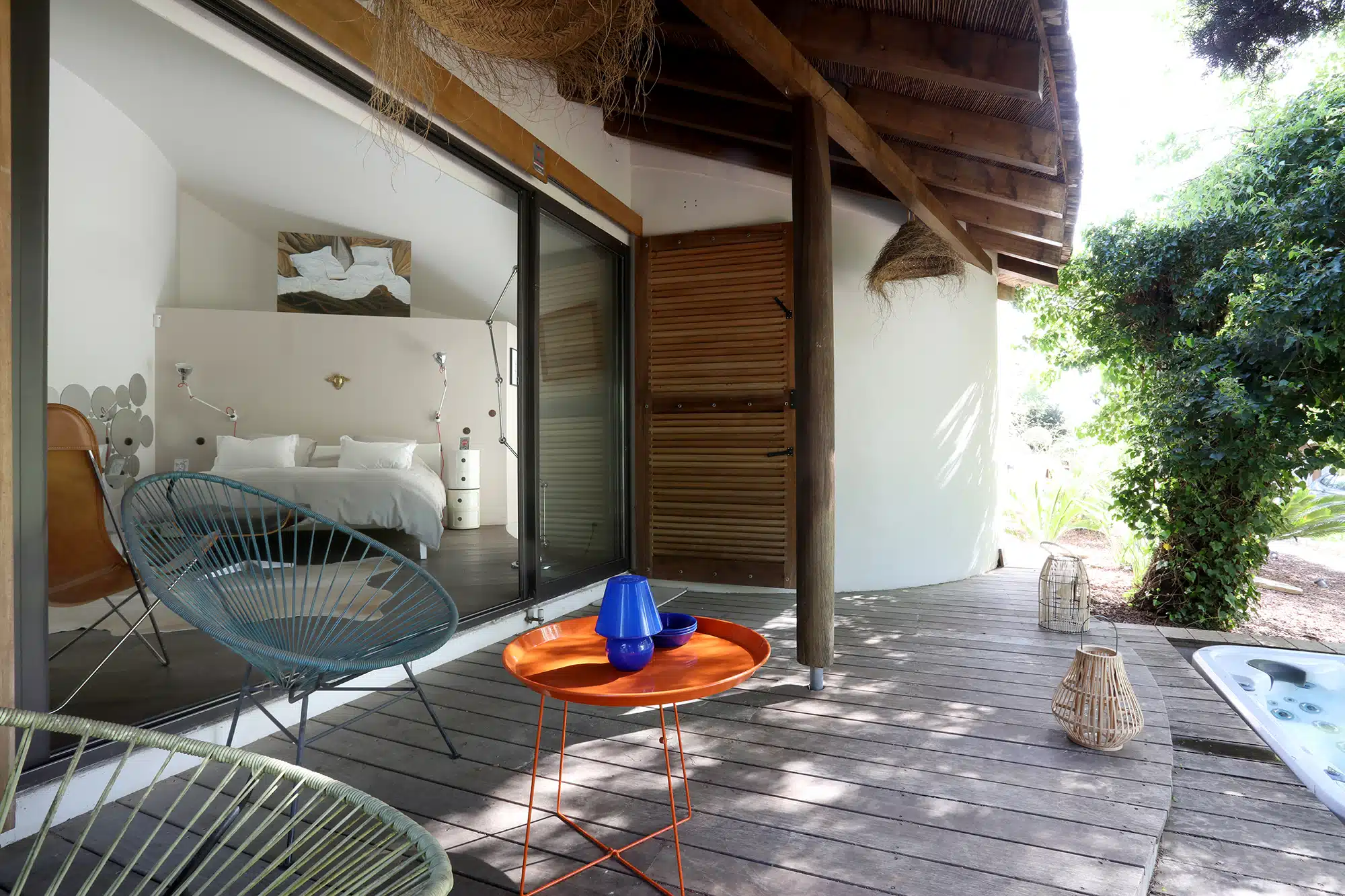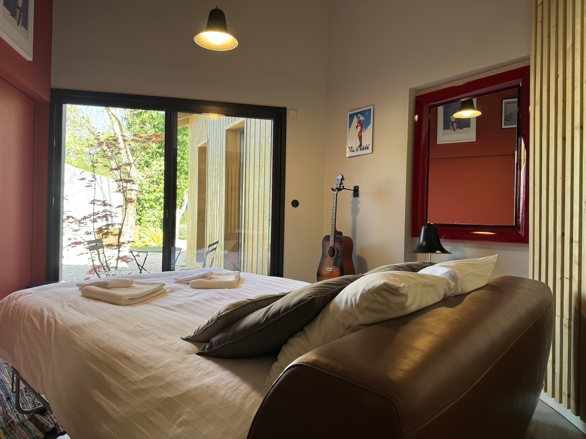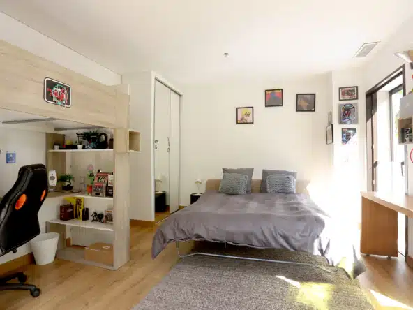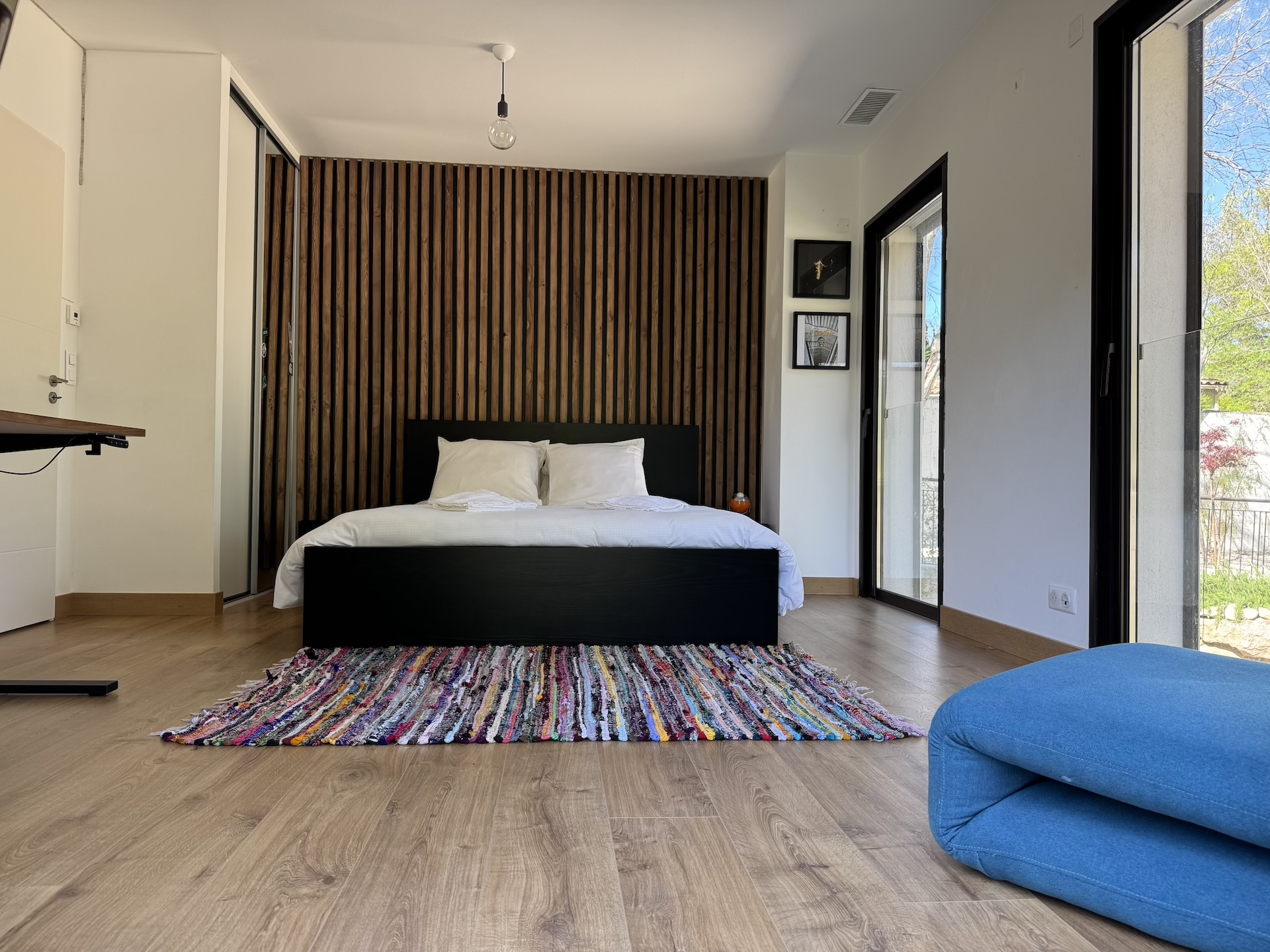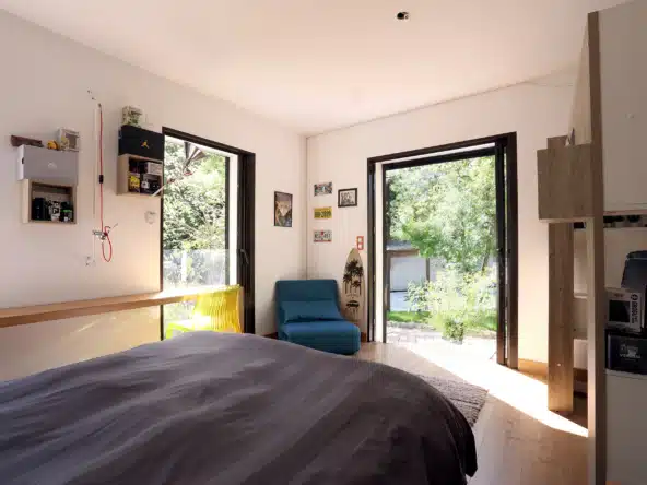 La première chambre, accessible depuis la salle à manger, dispose d’un lit double mesurant 180 cm par 200 cm, ainsi que d’un sol rafraîchissant. Elle est également pourvue d’une salle d’eau privée avec douche et toilettes, et bénéficie d’une petite terrasse en bois donnant sur le terrain de sport.