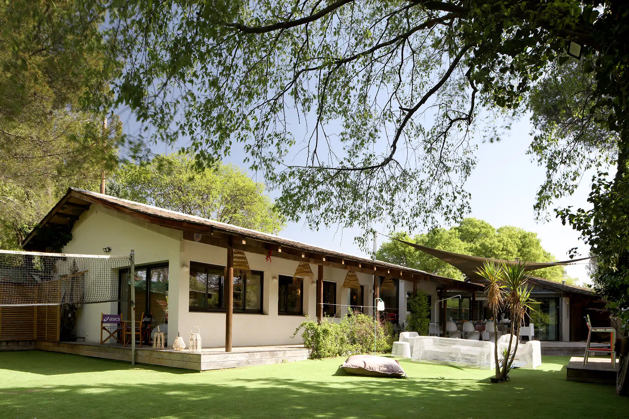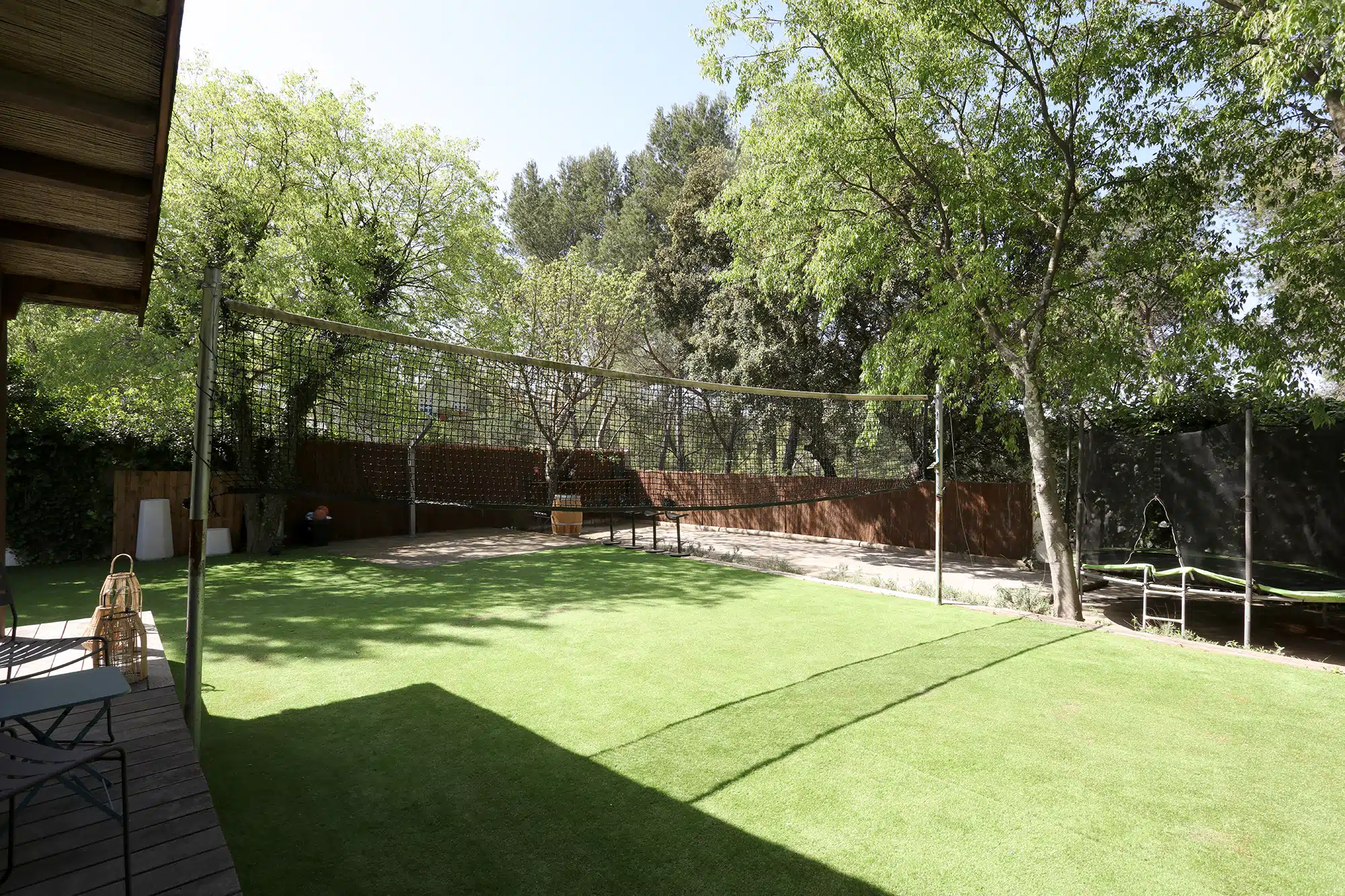 To the west side of the garden, a multi-sport ground offers activities such as volleyball, basketball, and pétanque (boule balls), and a trampoline