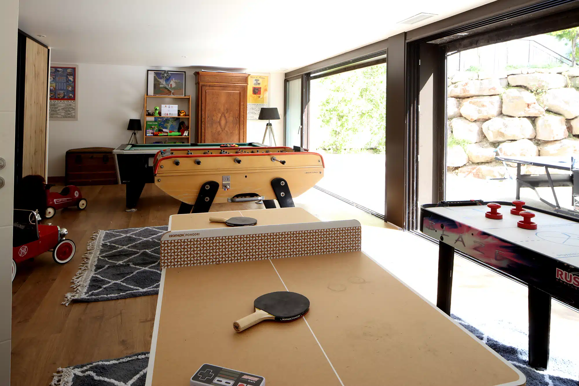 Un escalier depuis cette aile conduit à un étage inférieur où se trouve une grande salle de jeux ouvrant par deux grandes baies vitrées sur la partie Est du jardin. Elle est équipée d’une variété de jeux de société, ainsi que d’un baby-foot, d’un billard, d’une table de ping-pong et d’une table de air hockey, garantissant ainsi des heures de divertissement pour les vacanciers.