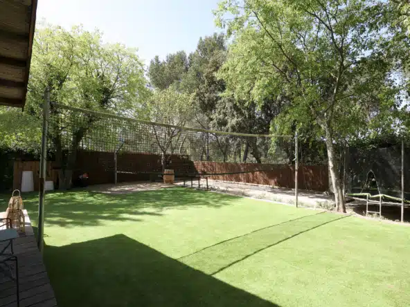 Face à la maison, la piscine de dimensions généreuses (11m x 4m x 1,5m) est également entourée d’une terrasse en bois, offrant des transats, un lit balinais et d’autres équipements de jardin pour une relaxation optimale. À l’ouest de la maison, un terrain multisports propose diverses activités telles que le volley-ball, le basket-ball, la pétanque, le football et un trampoline, garantissant divertissement et plaisir pour tous.