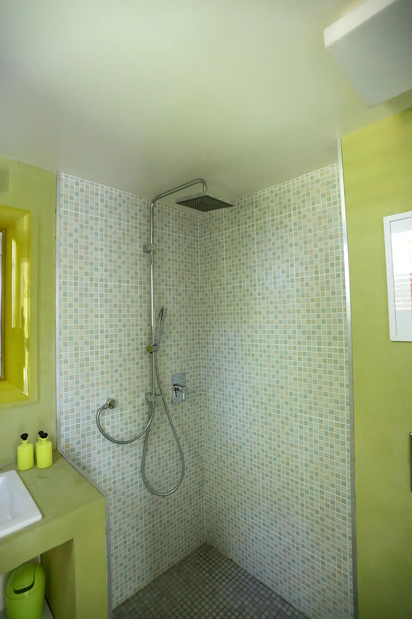 At the center of the house, an entrance hall leads to an air-conditioned wing housing two additional bedrooms, each furnished with a double sofa bed and a child-friendly wooden single bed. These rooms share a bathroom, complete with indoor and outdoor showers.