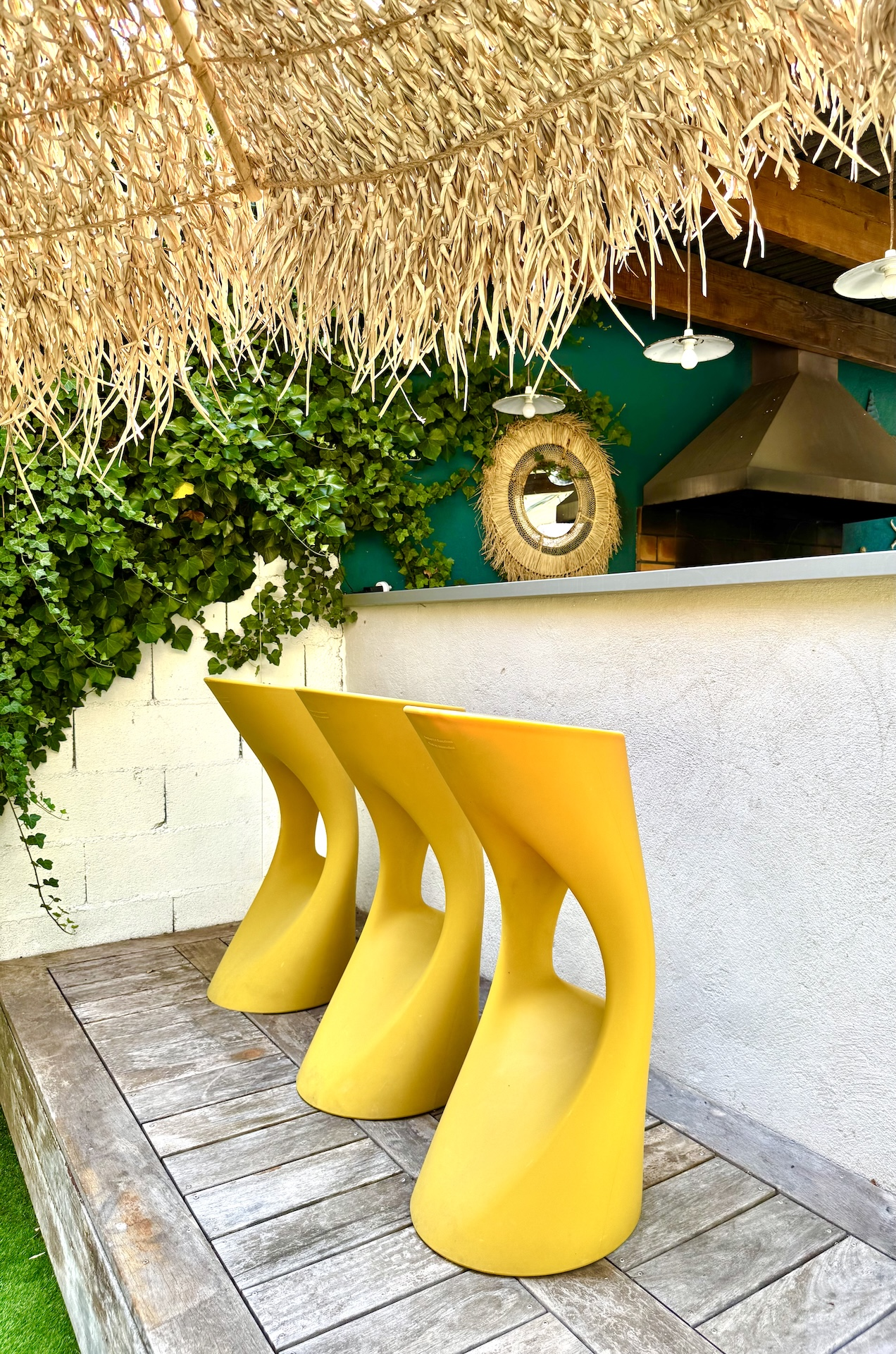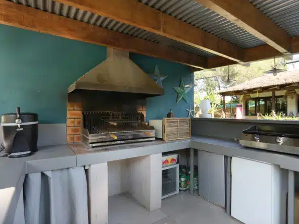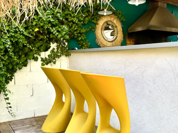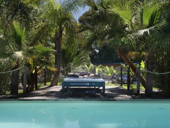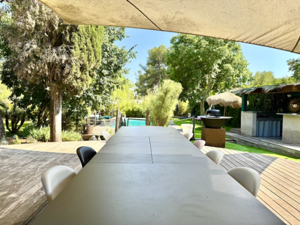 À l’extérieur, la maison nous révèle un jardin verdoyant, agrémenté de palmiers et de plantes exotiques, qui borde une piscine spacieuse entourée d’une terrasse en bois, directement devant le salon une table à manger pouvant accueillir 12 convives est abritée par une toile d’ombrage.