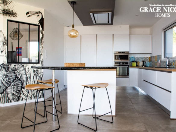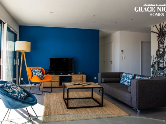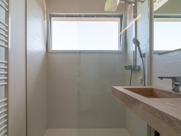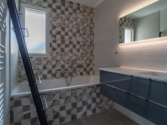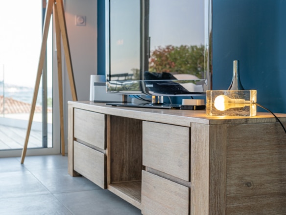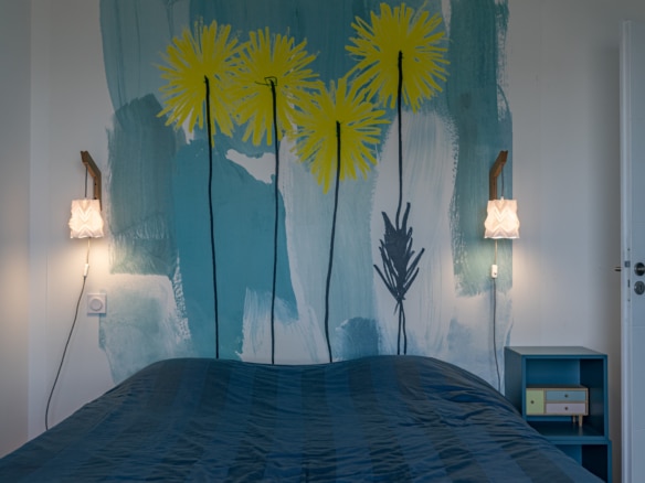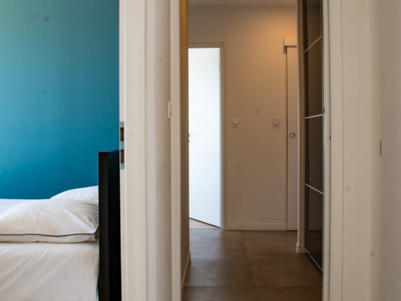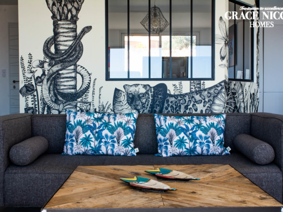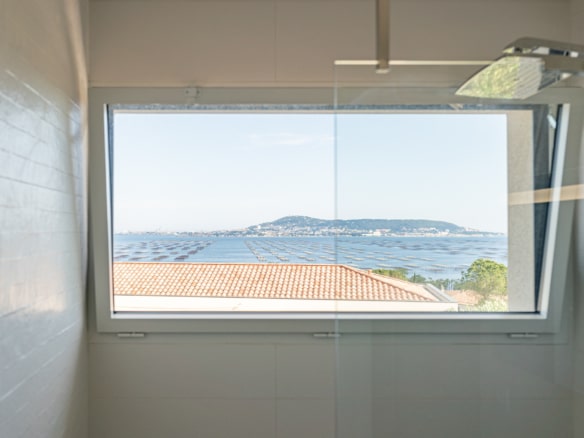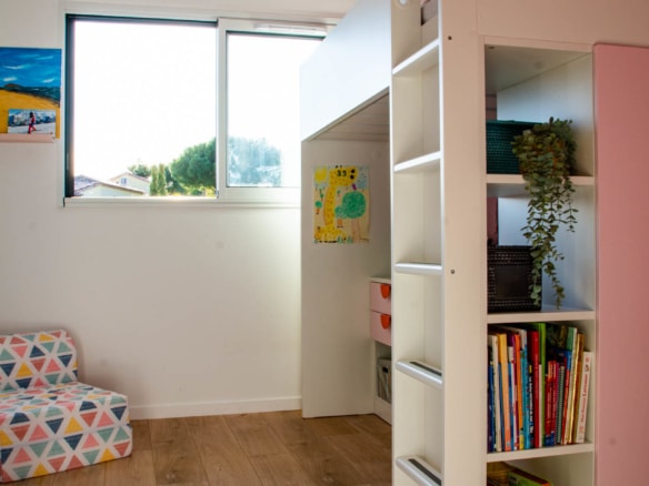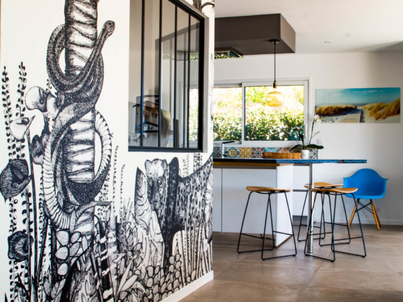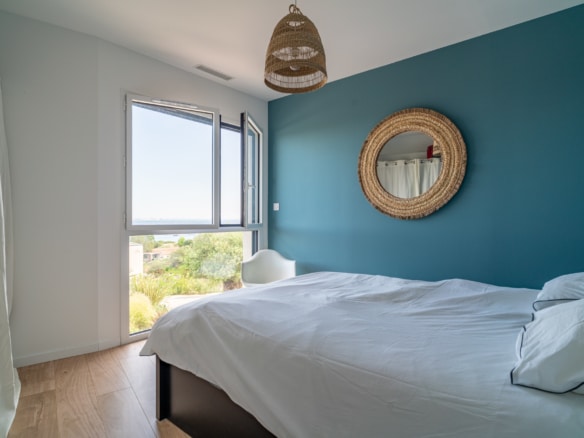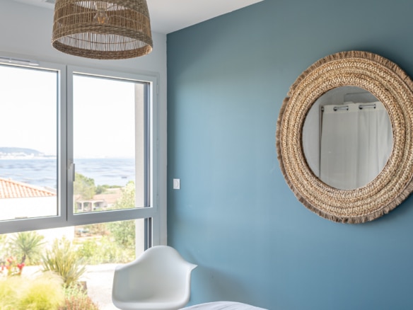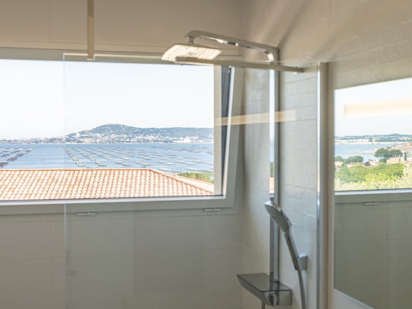 From the terrace, you can step into the main living area of the villa. This open floor plan houses the living room with stylish furniture and a TV, the adjoining dining area, and the well-equipped kitchen with its own central island. A beautiful mural facing the living room livens up the whole room. This area also holds a gym/yoga room where guests can continue their workout plan or meditate after a long day of sightseeing. Down the corridor, there are 3 rooms: 2 double bedrooms overlooking the lagoon and one spacious children’s room so they can enjoy playtime in their own room. Two bathrooms can be found at Villa Les Terrasses de Thau, one with a shower and the other with a bathtub.
