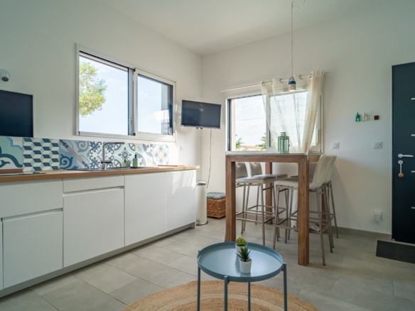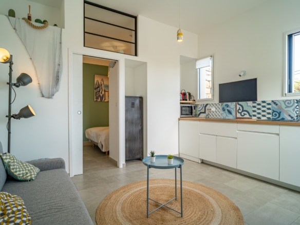 The ground floor has an independant and refined, fully-equipped studio apartment of 30 m2. It is composed of a double bedroom with a bathroom, and a living room with a flat-screen TV, a well-equipped kitchen, and a dining area.