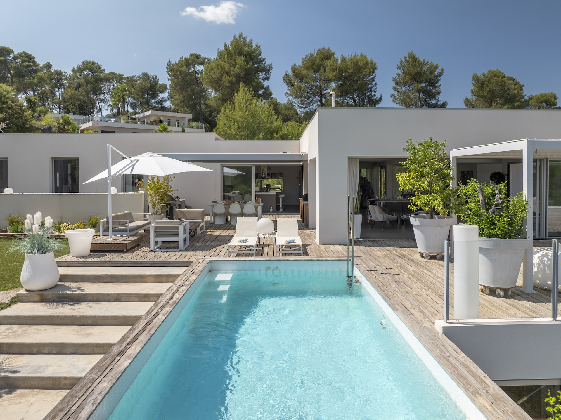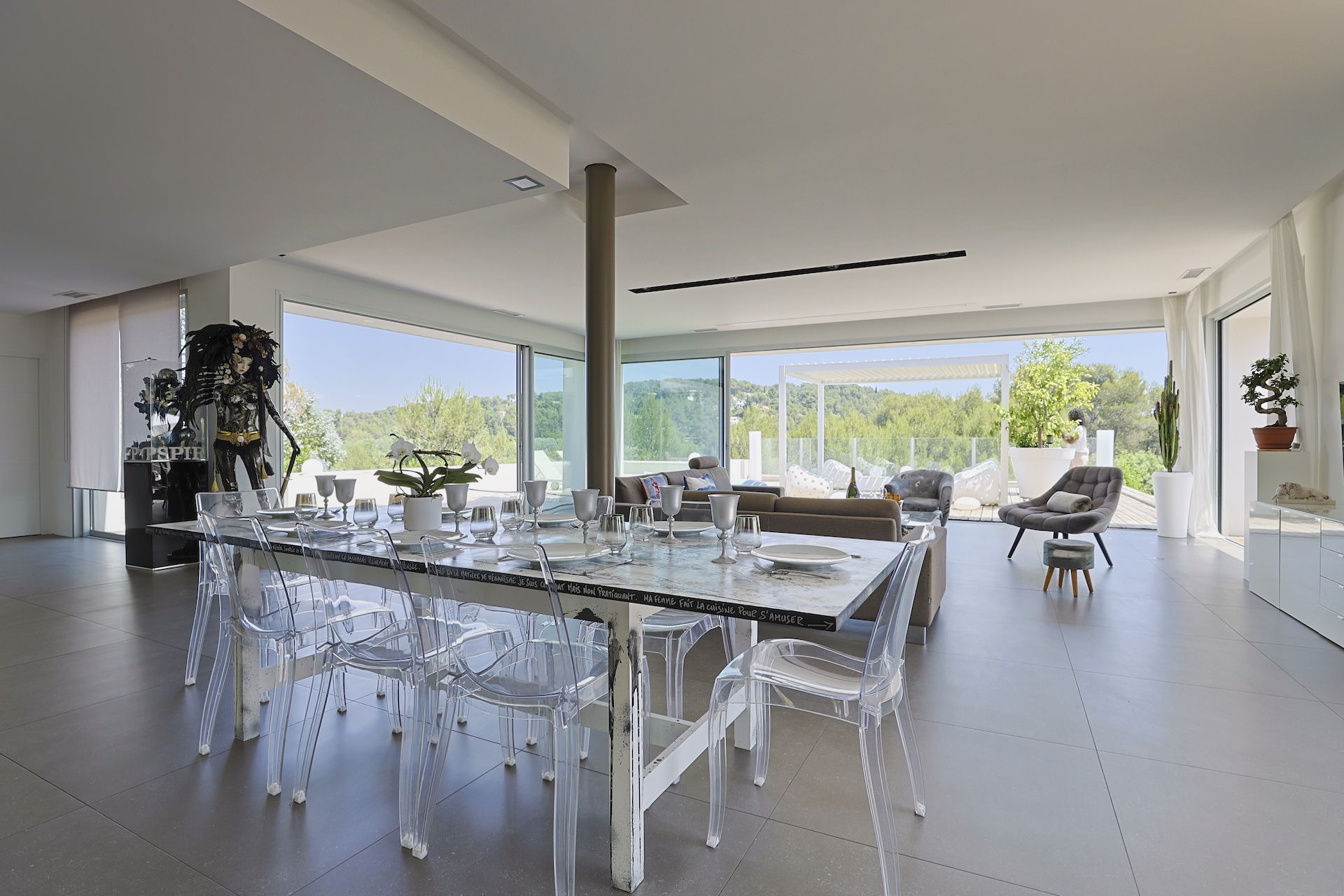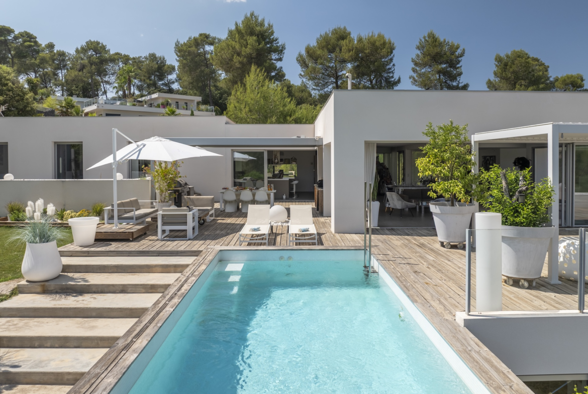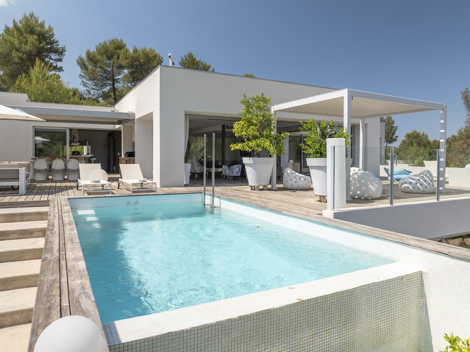 Perched on a hilltop in the prestigious private Domaine des Vautes, just outside Montpellier, Villa Pop-corn is a striking white contemporary villa offering 290 m² of living space on a 3,000 m² landscaped garden. With uninterrupted views over the rolling Mediterranean countryside, this architect-designed home embodies the essence of the modern Languedoc lifestyle — refined, serene, and deeply connected to nature.