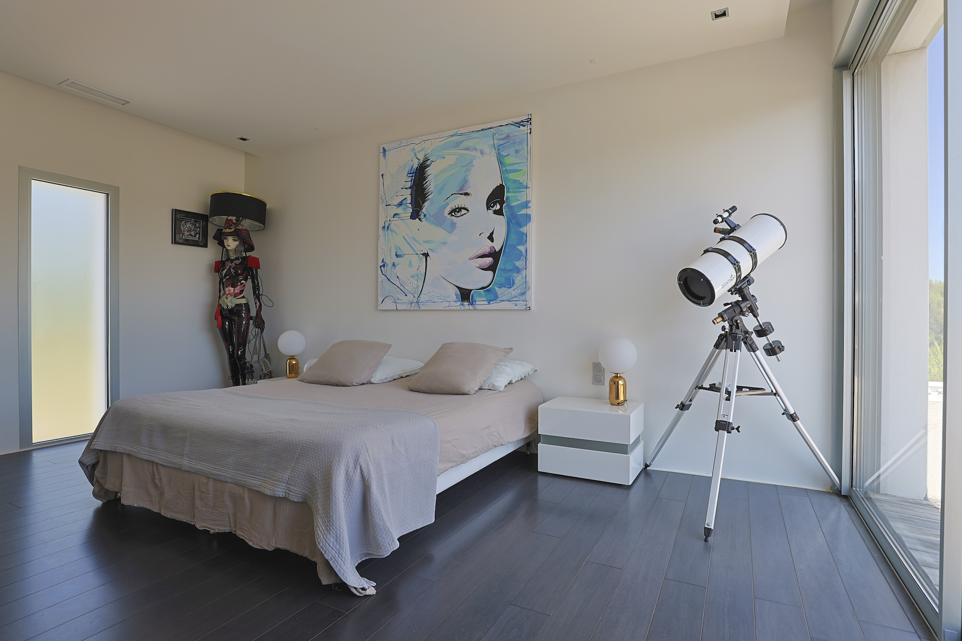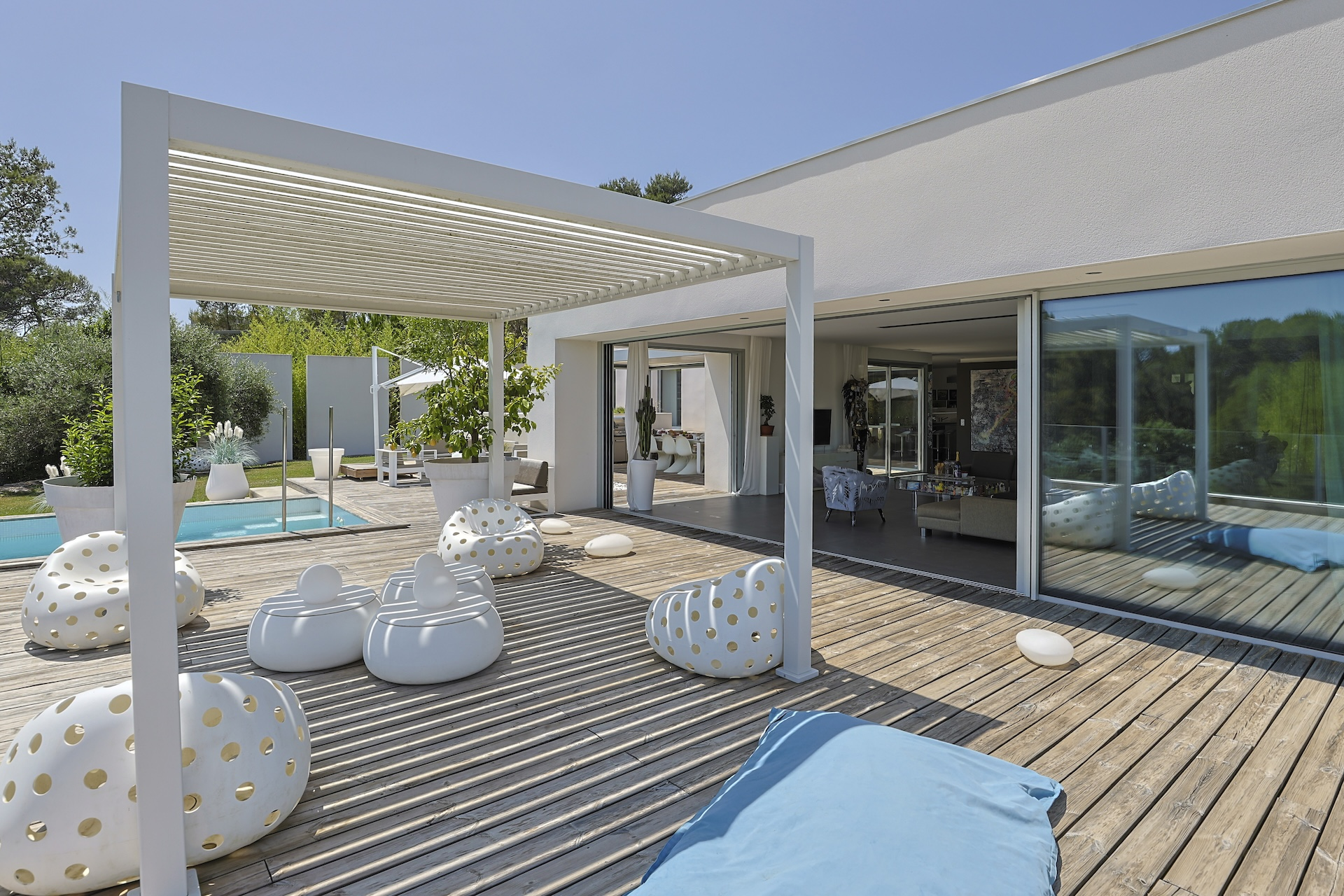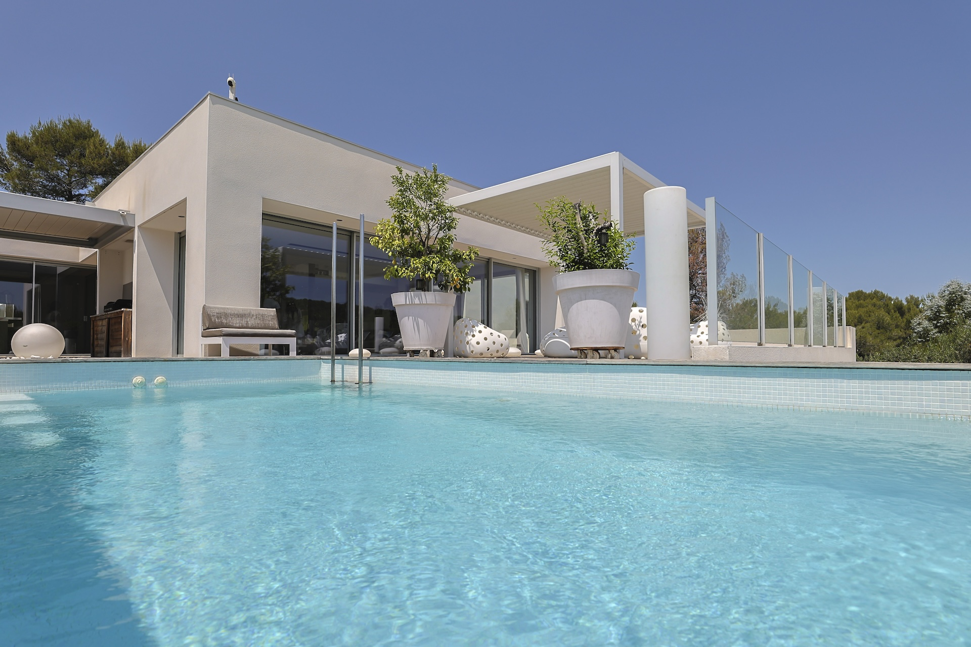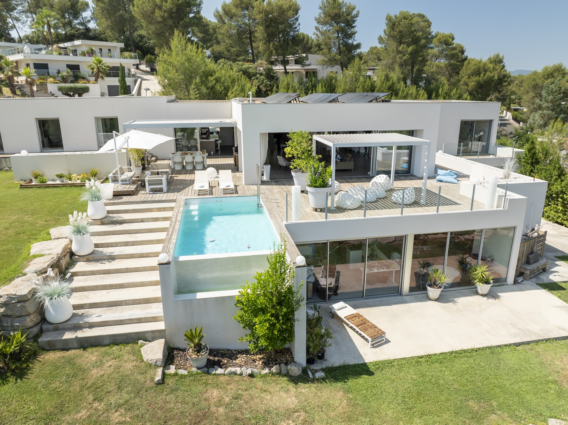 Perched on a hilltop in the prestigious private Domaine des Vautes, just outside Montpellier, Villa Pop-corn is a striking white contemporary villa offering 290 m² of living space on a 3,000 m² landscaped garden. With uninterrupted views over the rolling Mediterranean countryside, this architect-designed home embodies the essence of the modern Languedoc lifestyle — refined, serene, and deeply connected to nature.