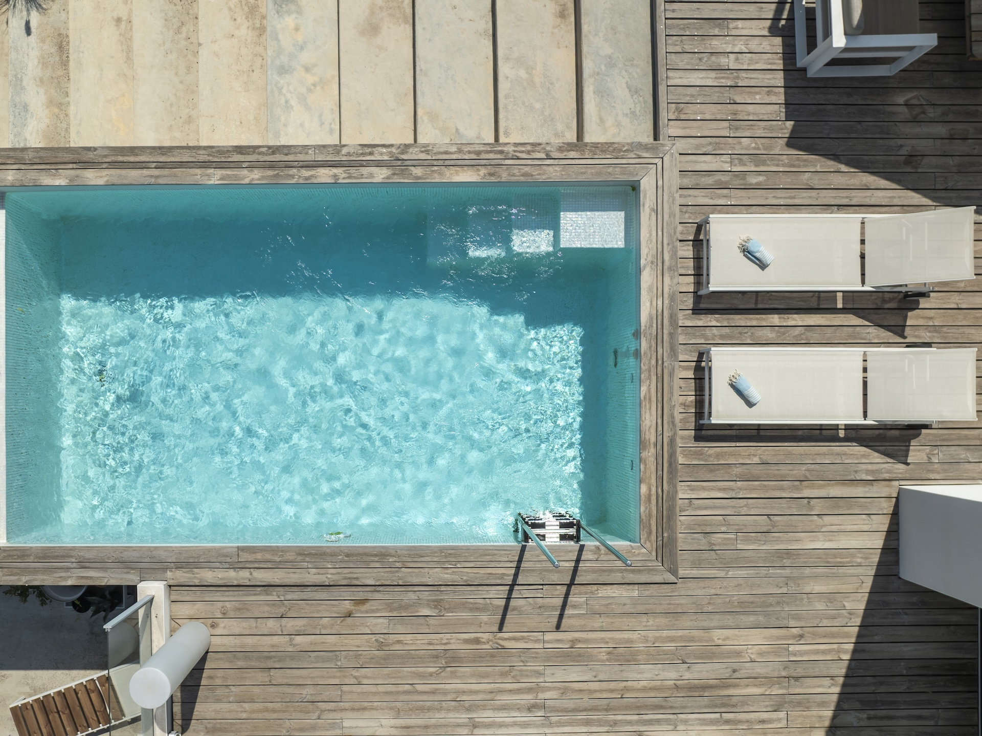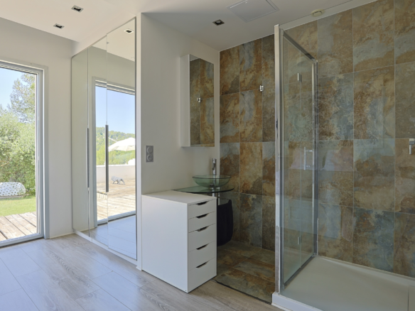 The 6x4m swimming pool (depth 1.75 m) features an infinity edge and counter-current swimming system, set against the breathtaking backdrop of nature. Whether you’re swimming laps or enjoying a glass of wine on the terrace, this pool area is a haven of peace and privacy.