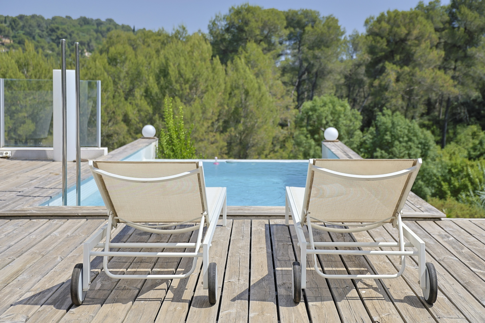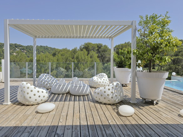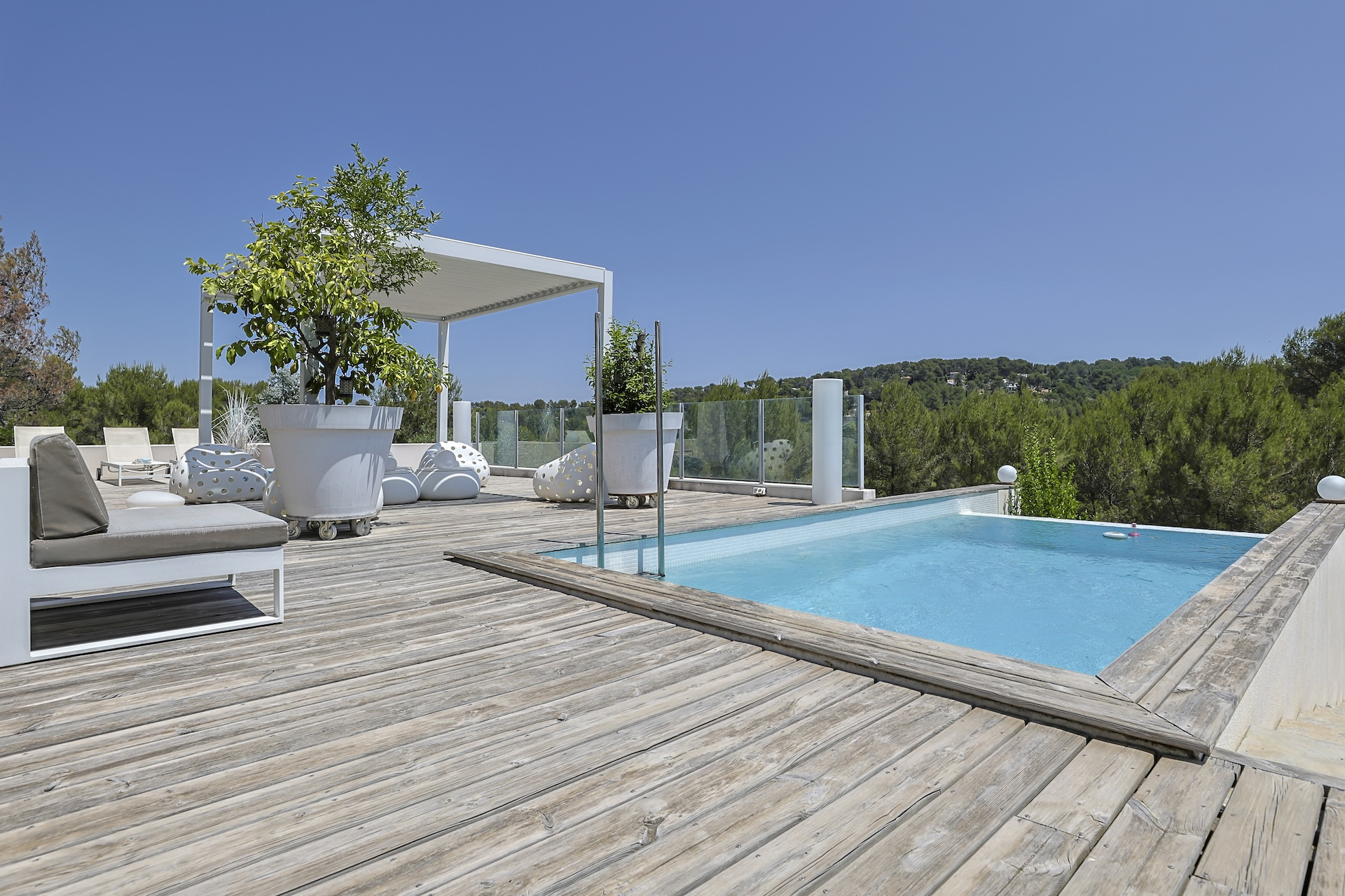 Decked terrace with sitting area and covered dining table Private infinity edge swimming pool