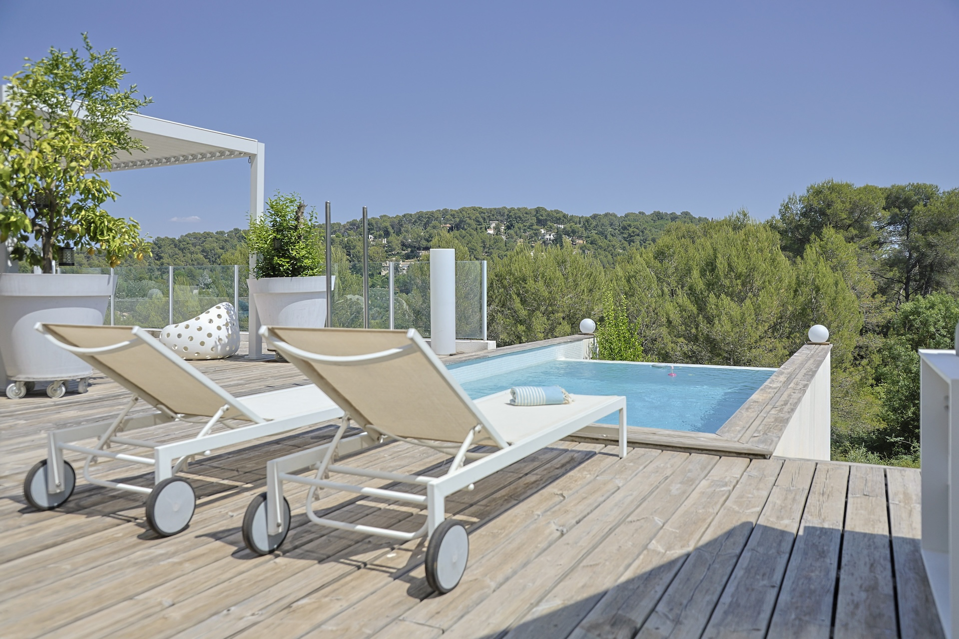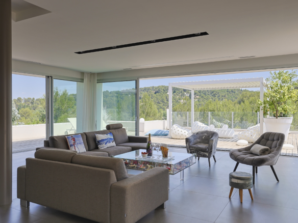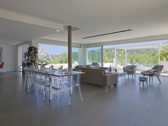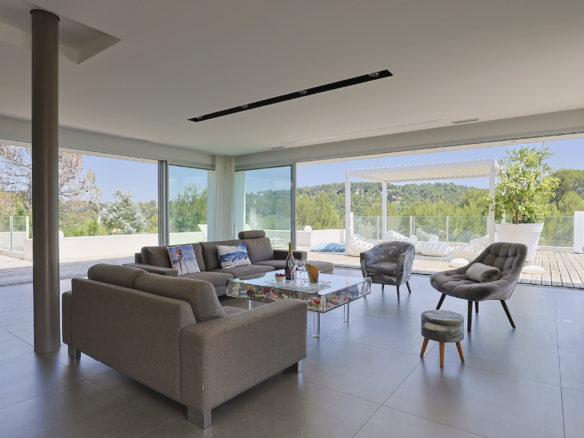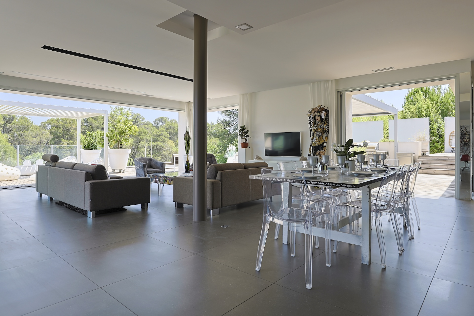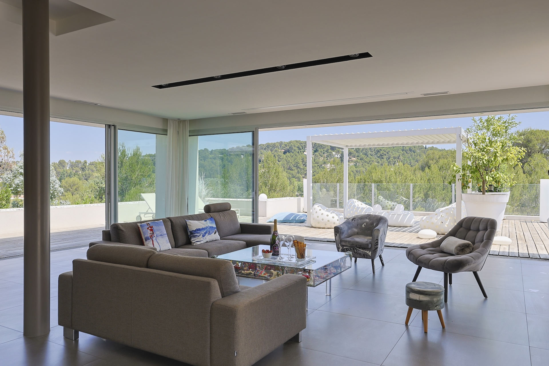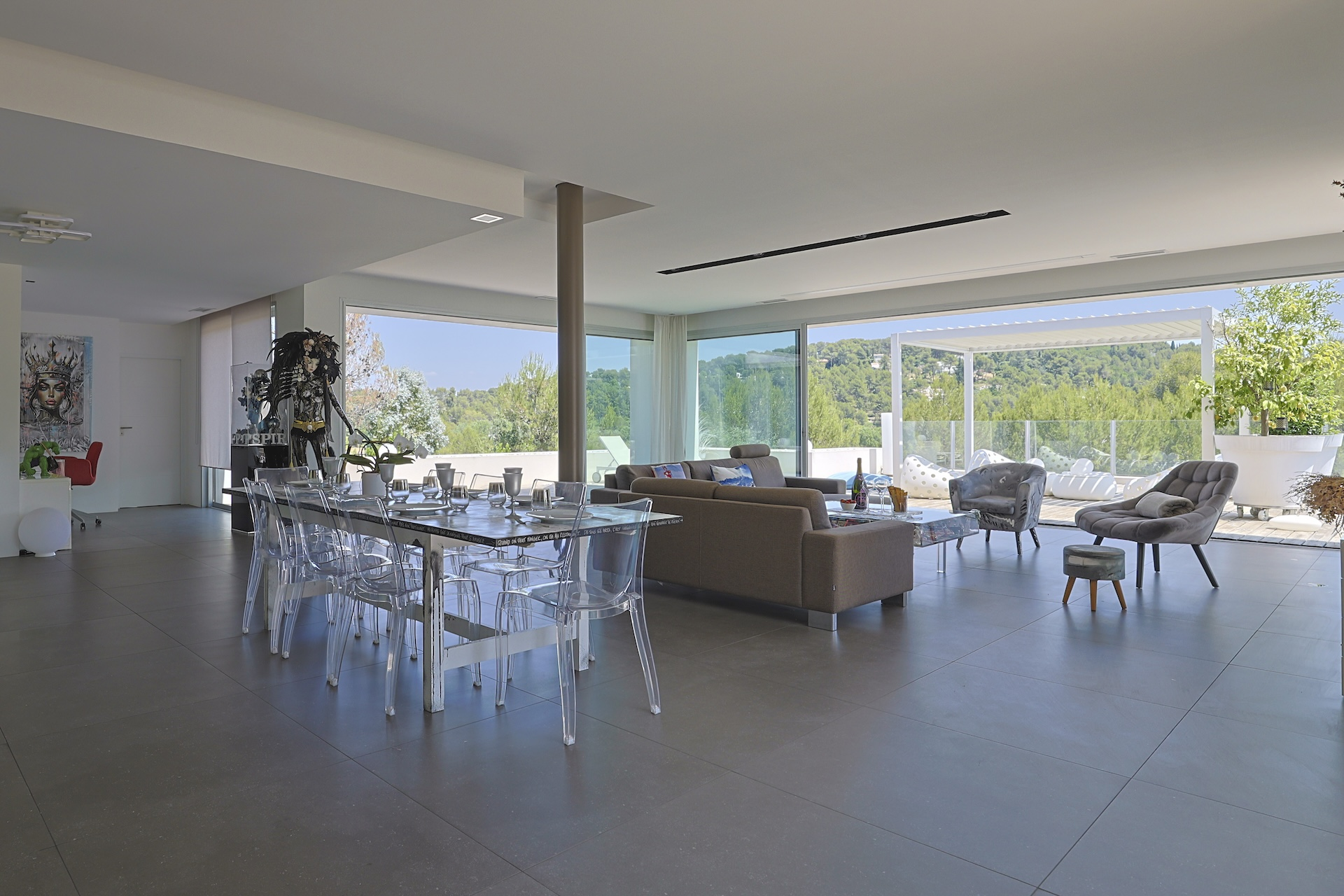 From the moment you enter, Villa Pop-corn reveals its magic: a vast open living area with 2.80-meter ceilings and floor-to-ceiling bay windows on three sides. The panoramic views of the surrounding hills become an integral part of the interior, and the space opens seamlessly onto a sun-drenched, south-facing terrace that wraps around the villa. The terrace is fully furnished with outdoor lounges and sunbeds, perfect for relaxing or entertaining.