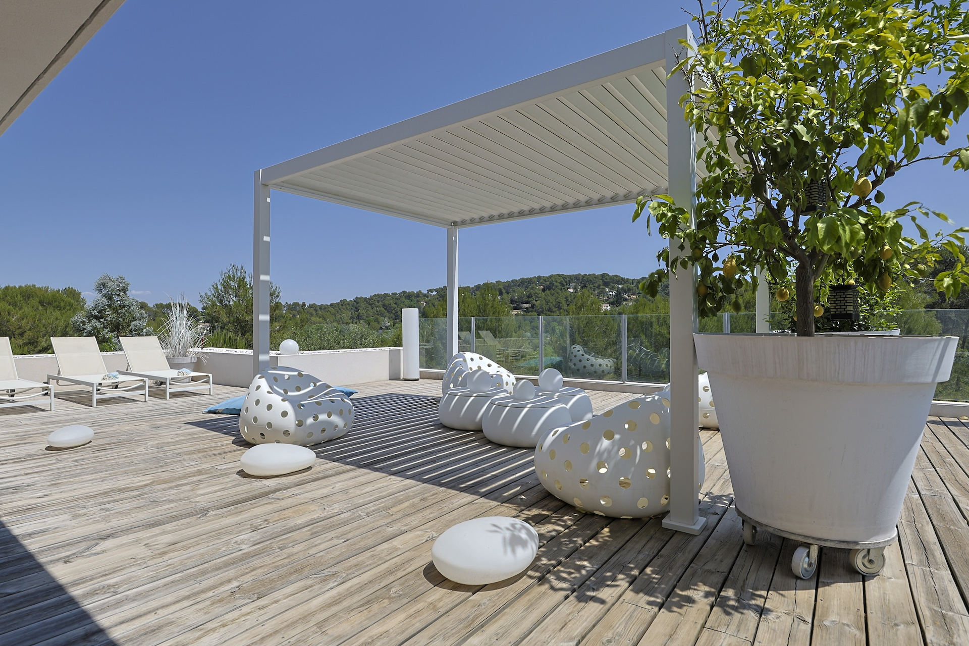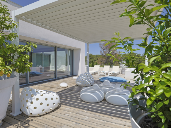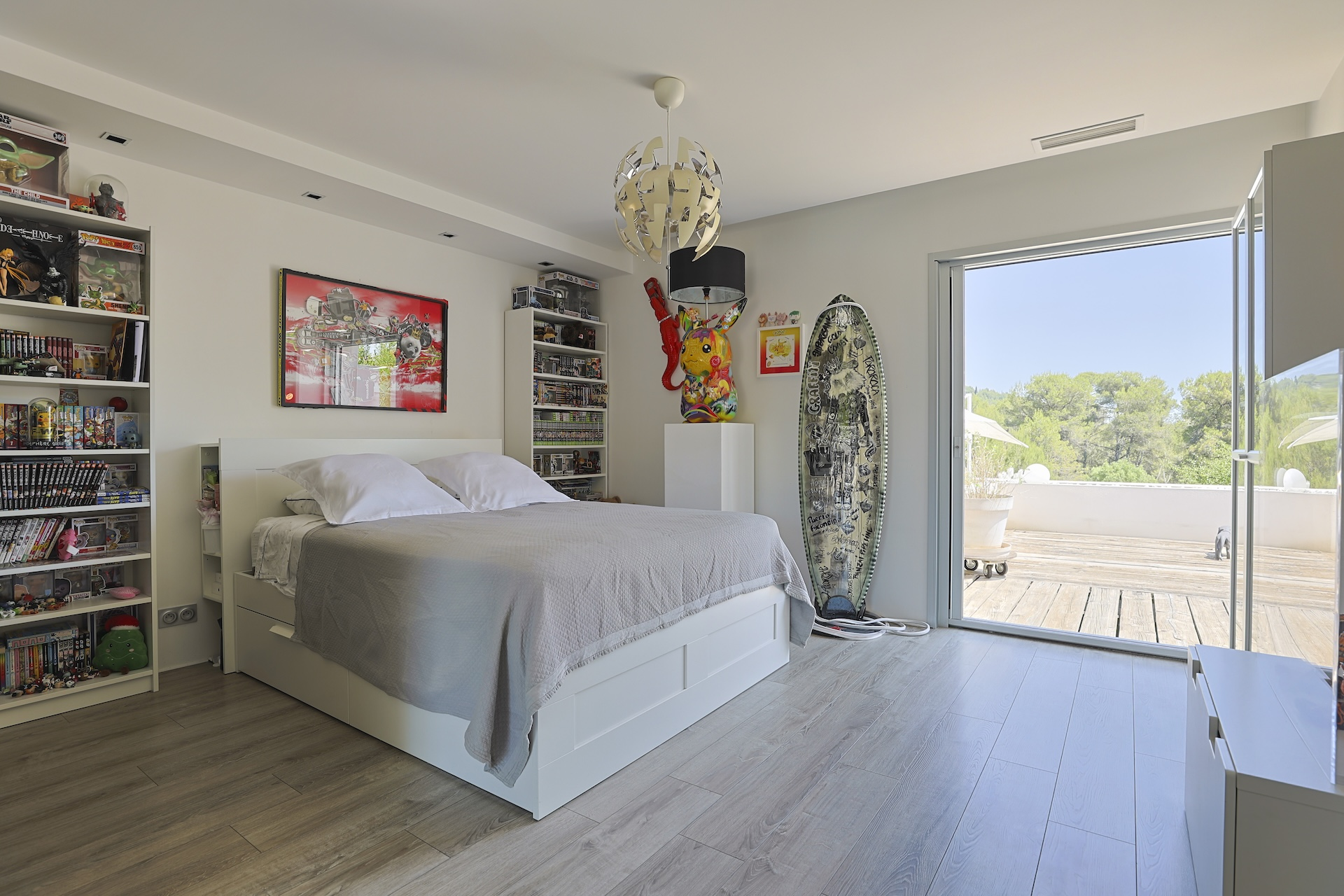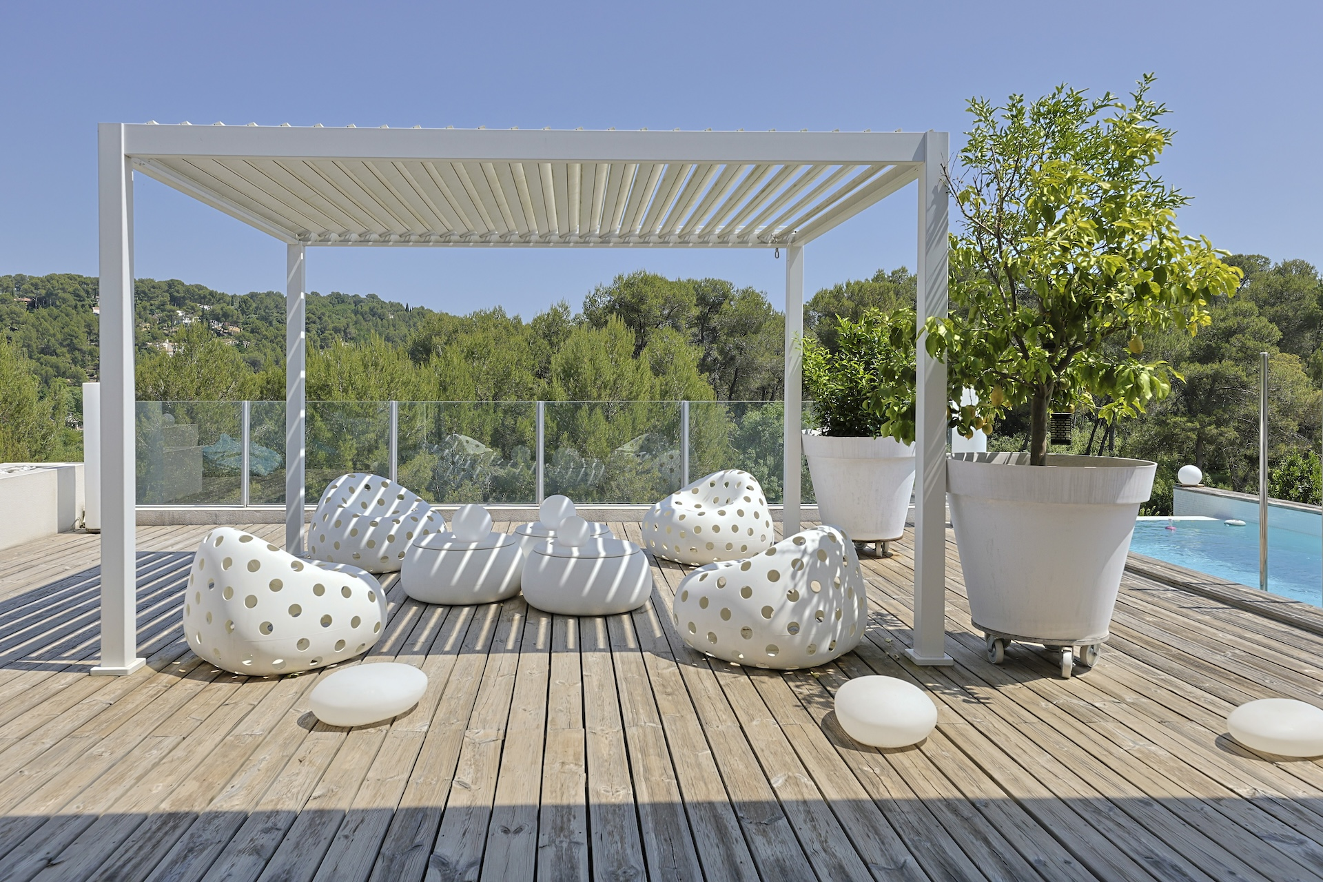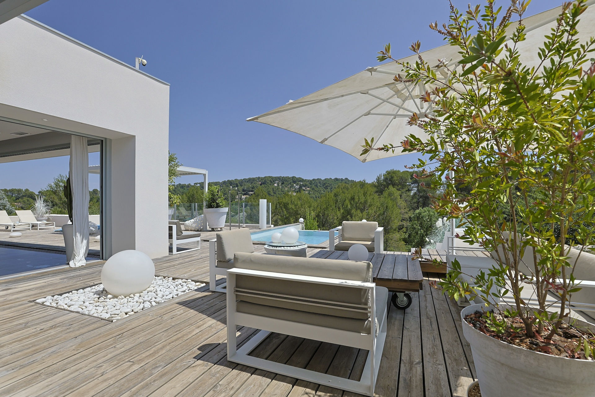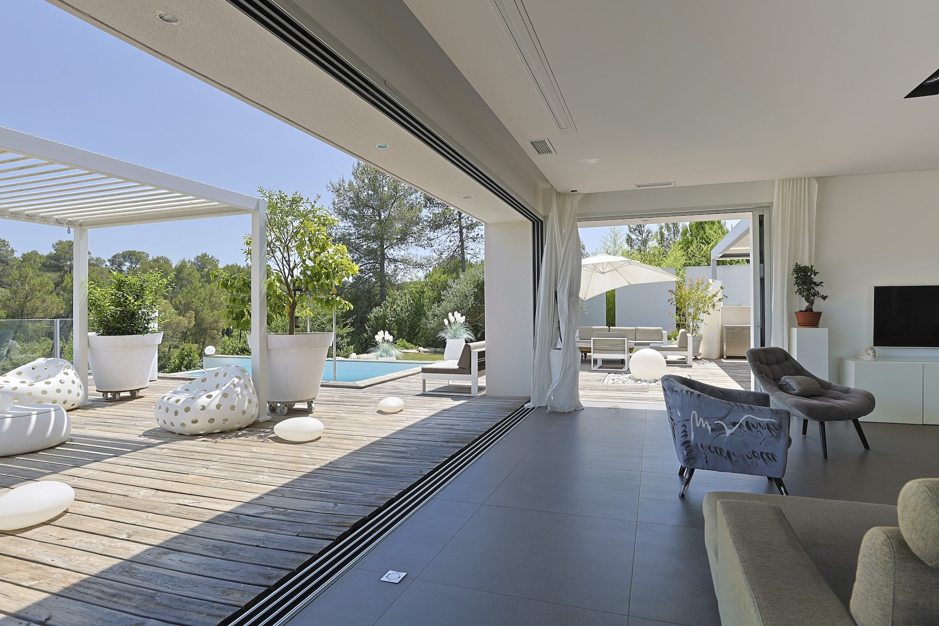 From the moment you enter, Villa Pop-corn reveals its magic: a vast open living area with 2.80-meter ceilings and floor-to-ceiling bay windows on three sides. The panoramic views of the surrounding hills become an integral part of the interior, and the space opens seamlessly onto a sun-drenched, south-facing terrace that wraps around the villa. The terrace is fully furnished with outdoor lounges and sunbeds, perfect for relaxing or entertaining.