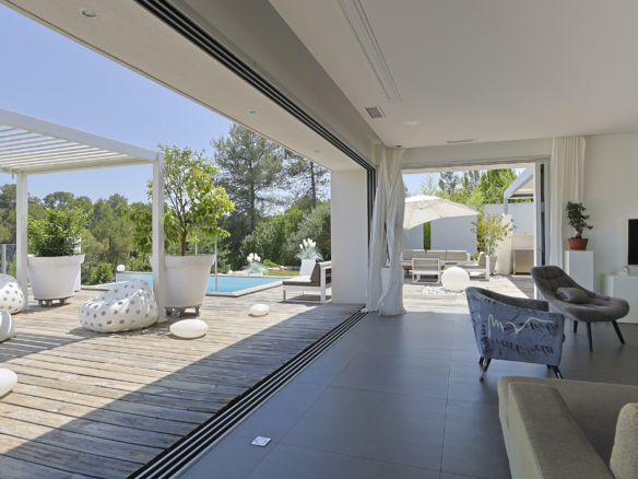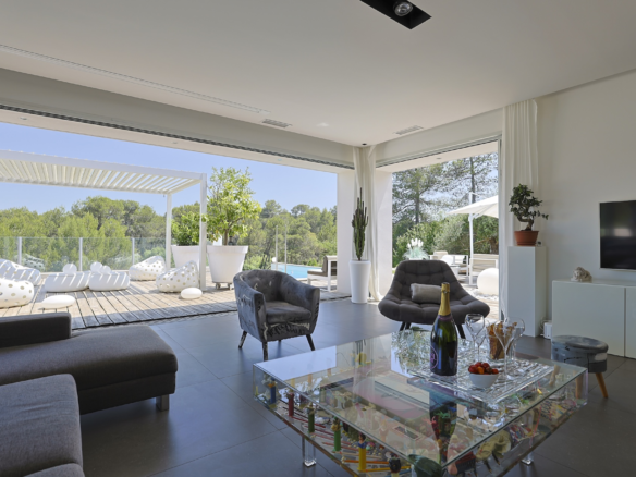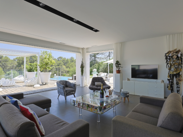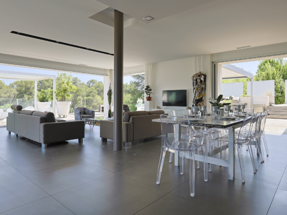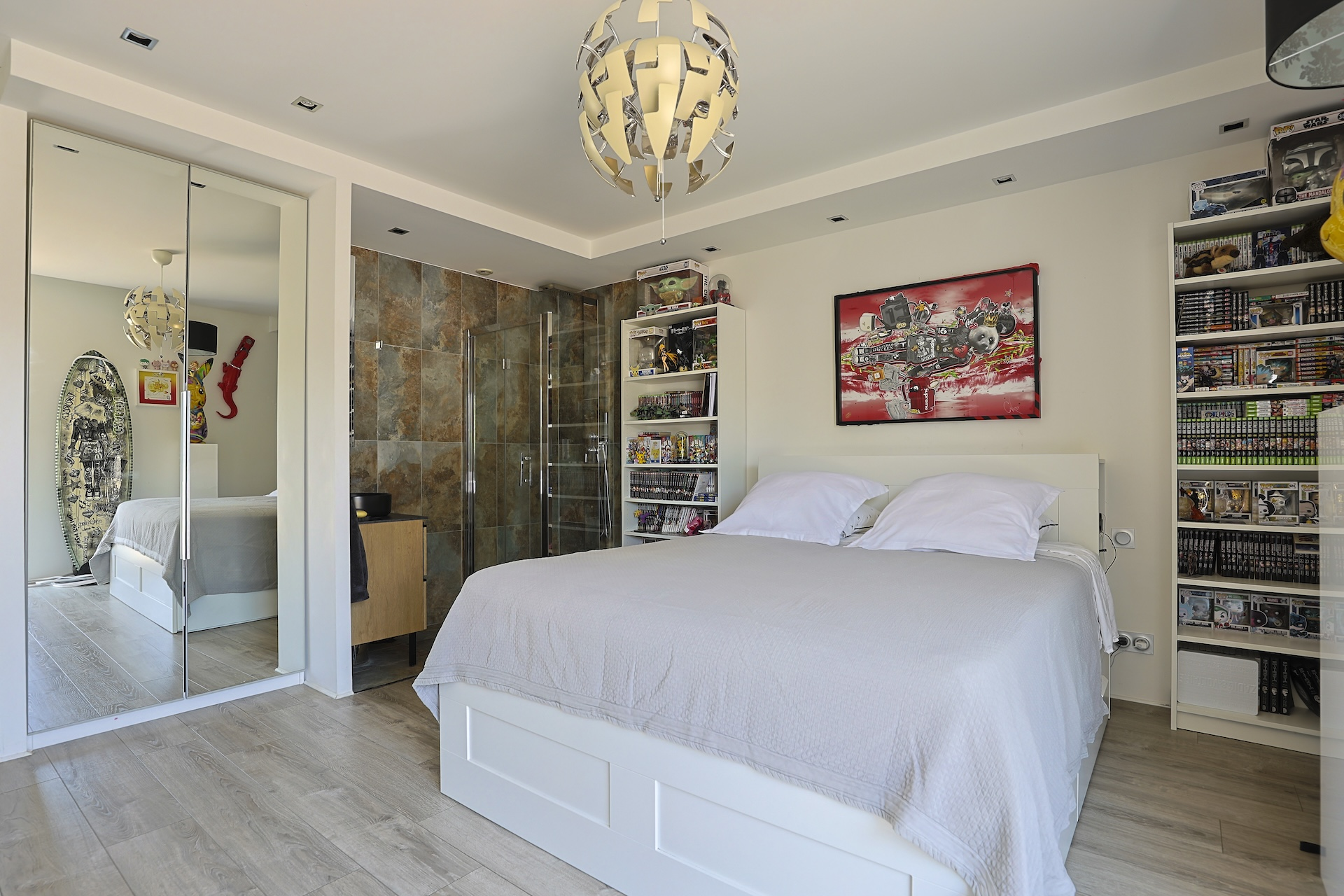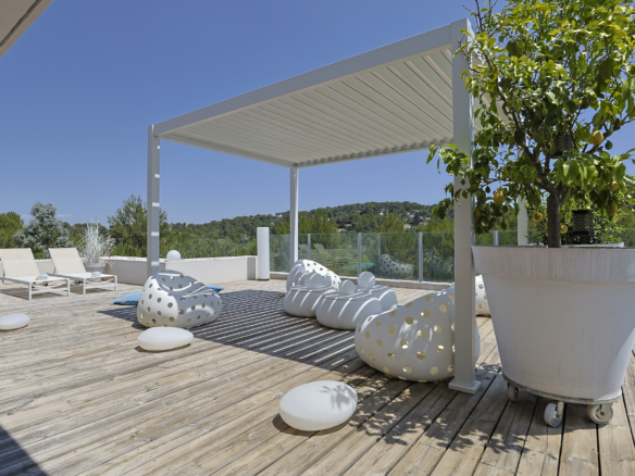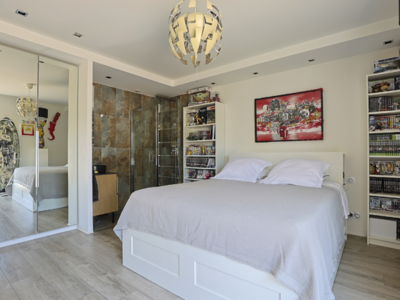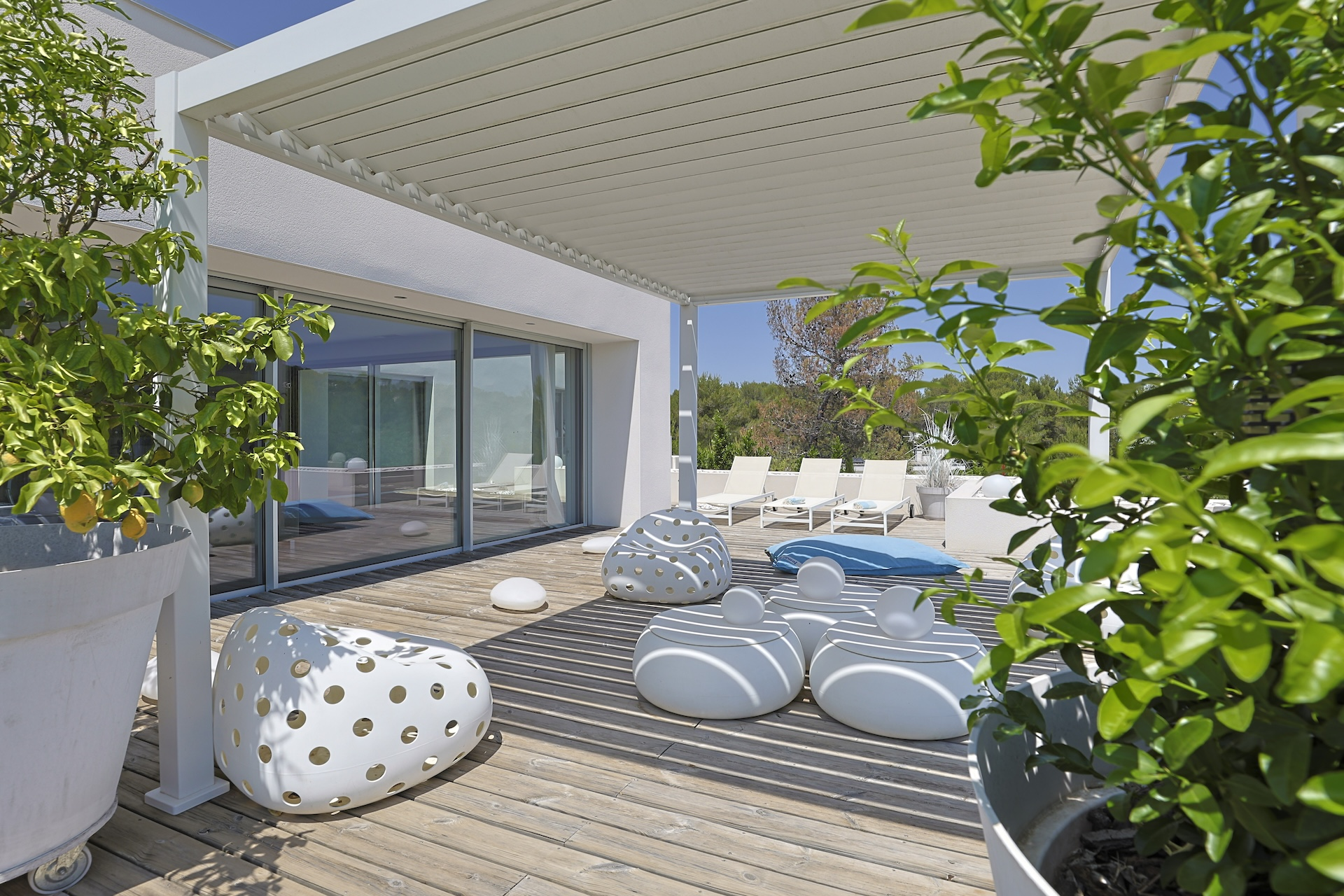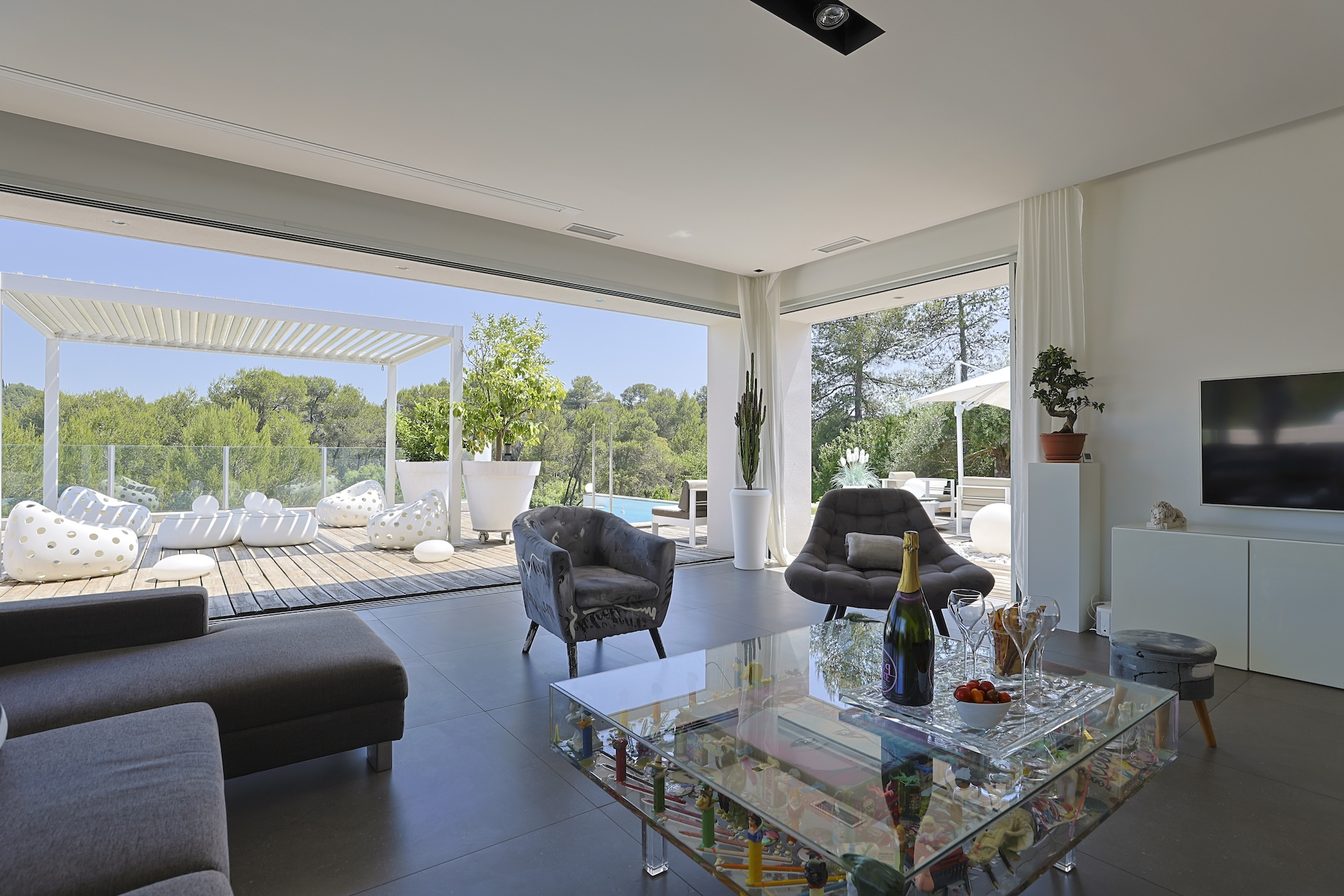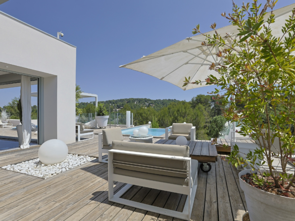 From the moment you enter, Villa Pop-corn reveals its magic: a vast open living area with 2.80-meter ceilings and floor-to-ceiling bay windows on three sides. The panoramic views of the surrounding hills become an integral part of the interior, and the space opens seamlessly onto a sun-drenched, south-facing terrace that wraps around the villa. The terrace is fully furnished with outdoor lounges and sunbeds, perfect for relaxing or entertaining.