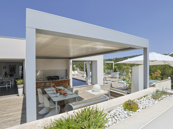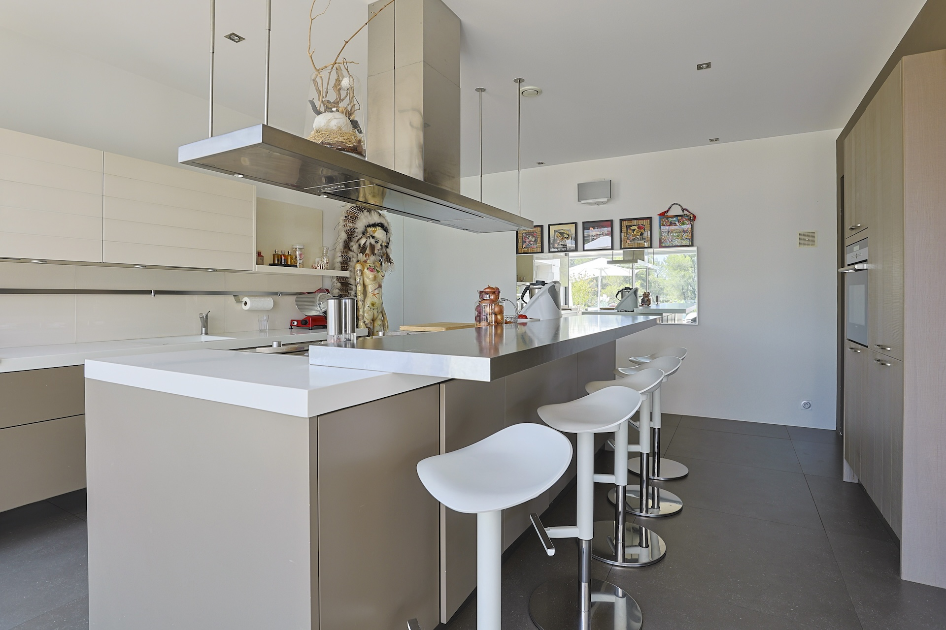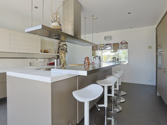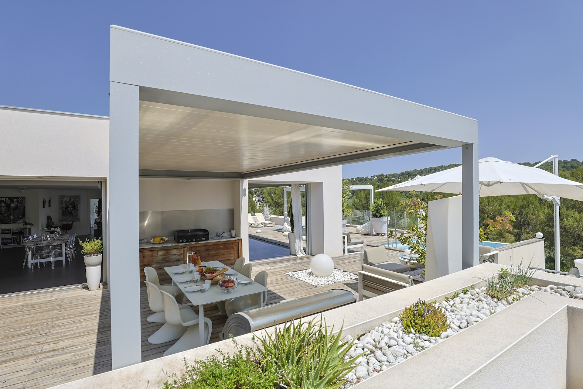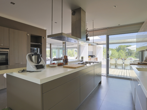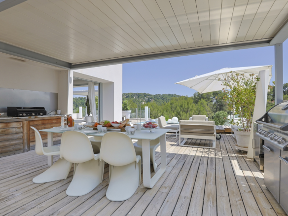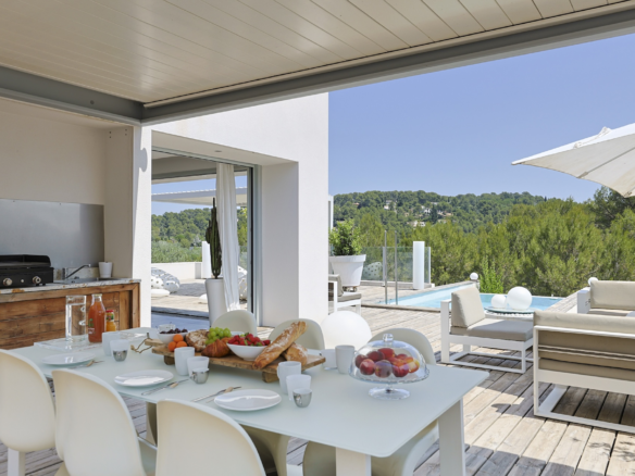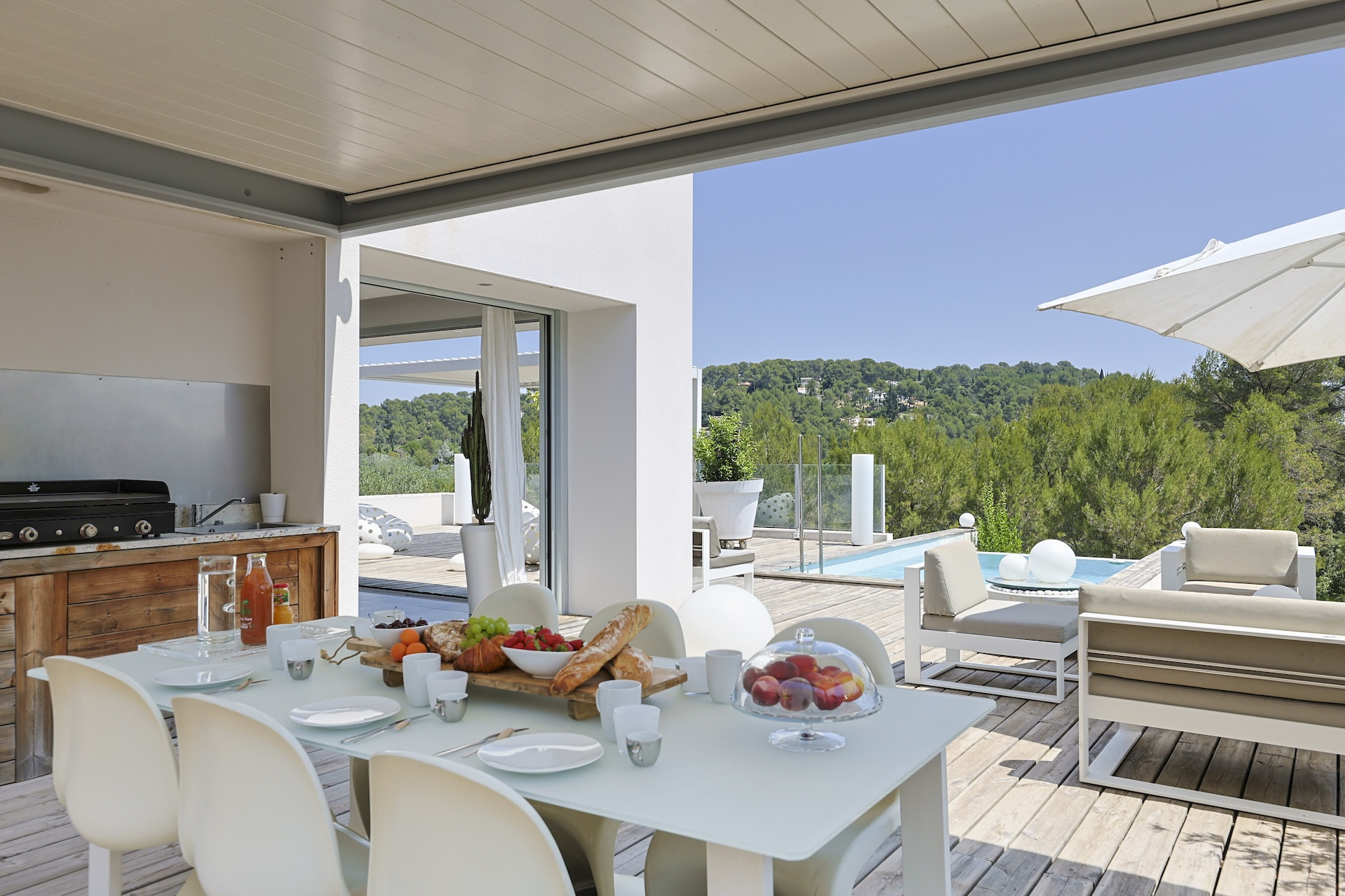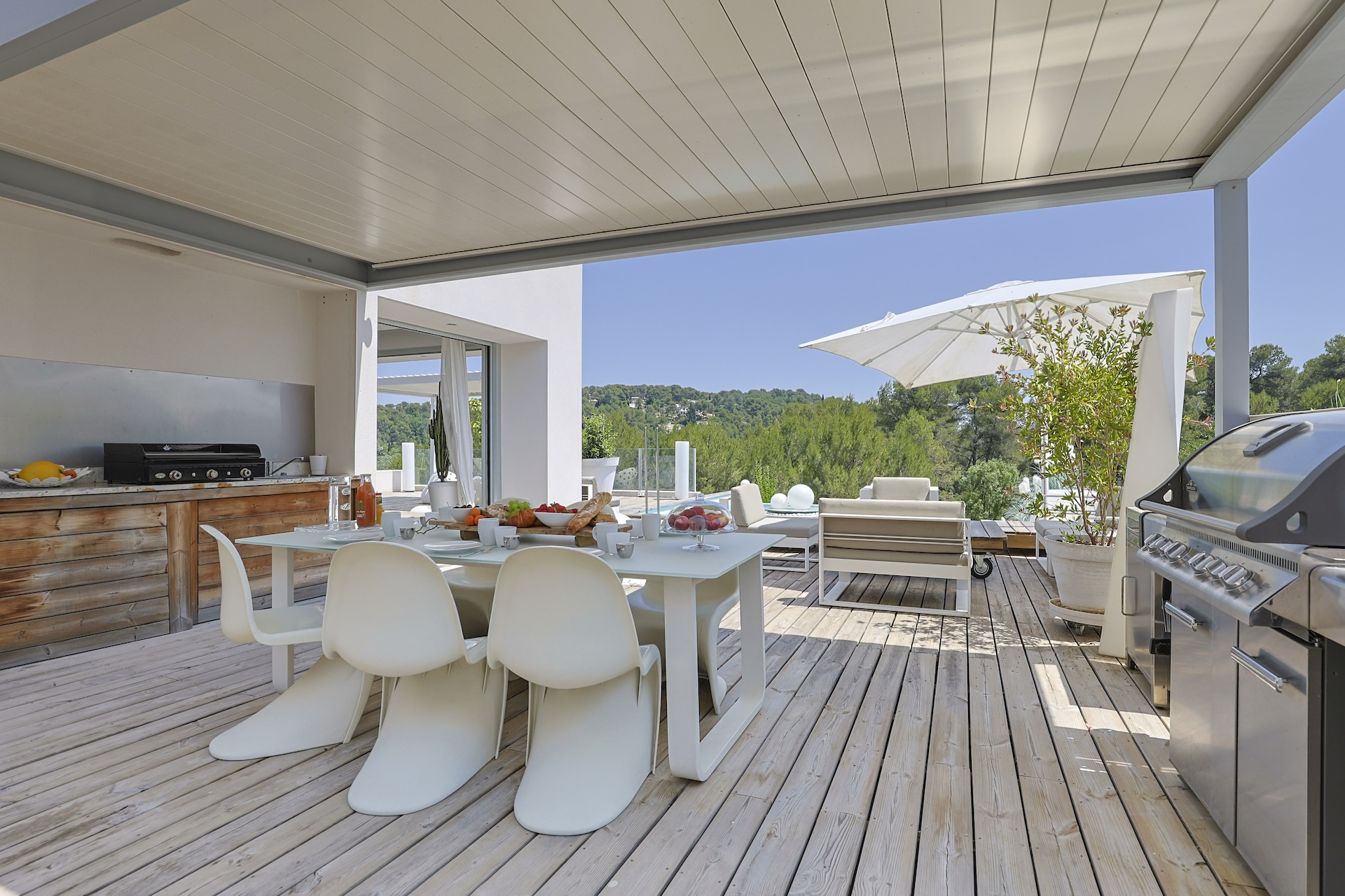 The sleek open kitchen is fully equipped with high-end appliances and a central island, ideal for convivial meals. A large bay window connects the kitchen to a covered outdoor dining terrace complete with plancha, barbecue, and a table overlooking the pool and countryside — perfect for alfresco dinners.