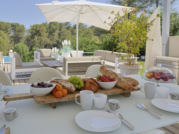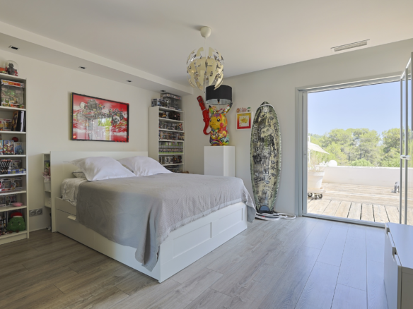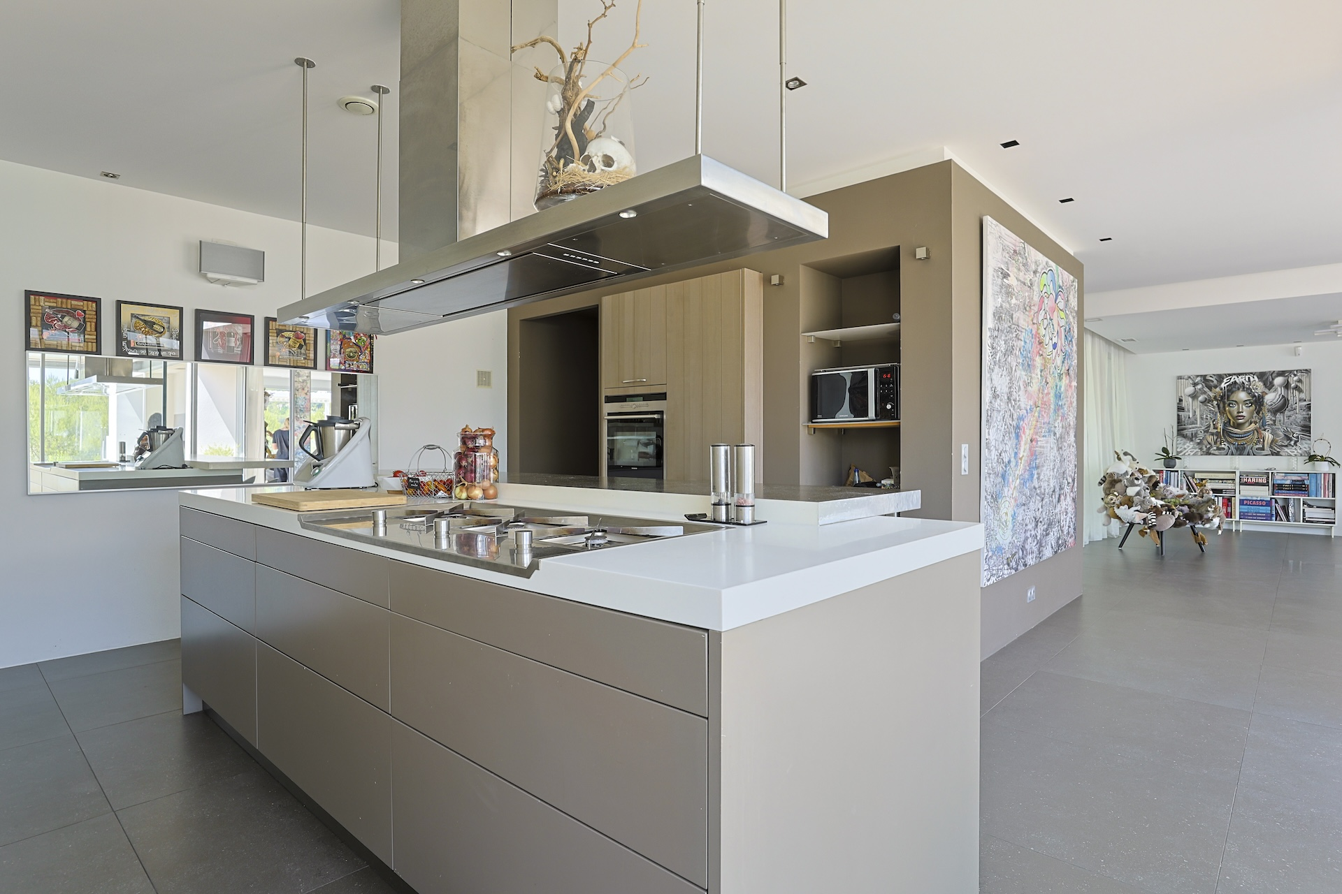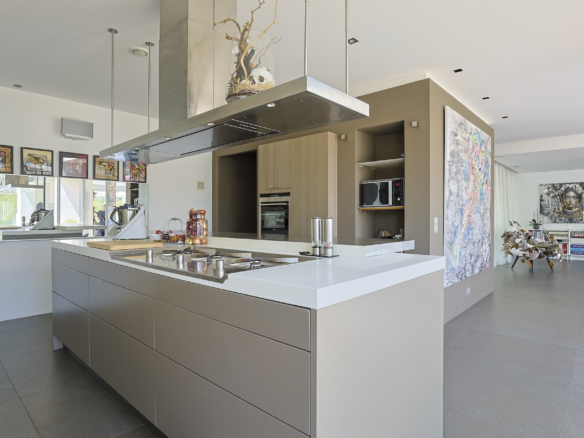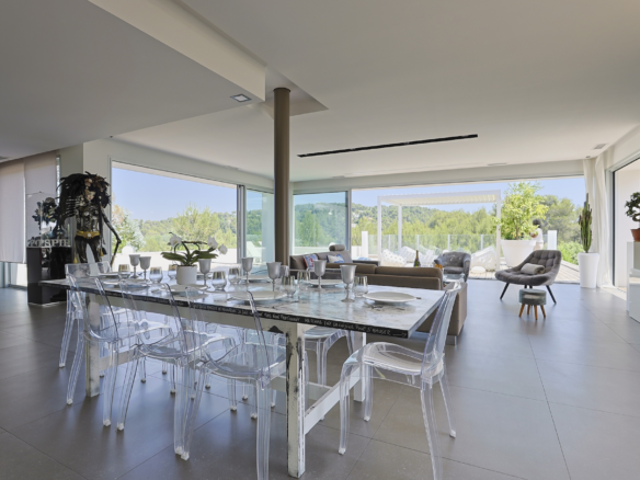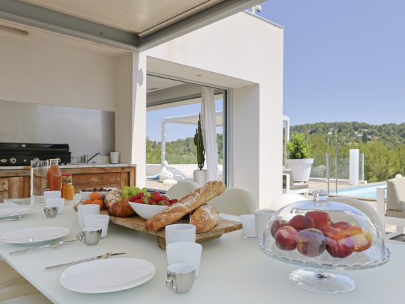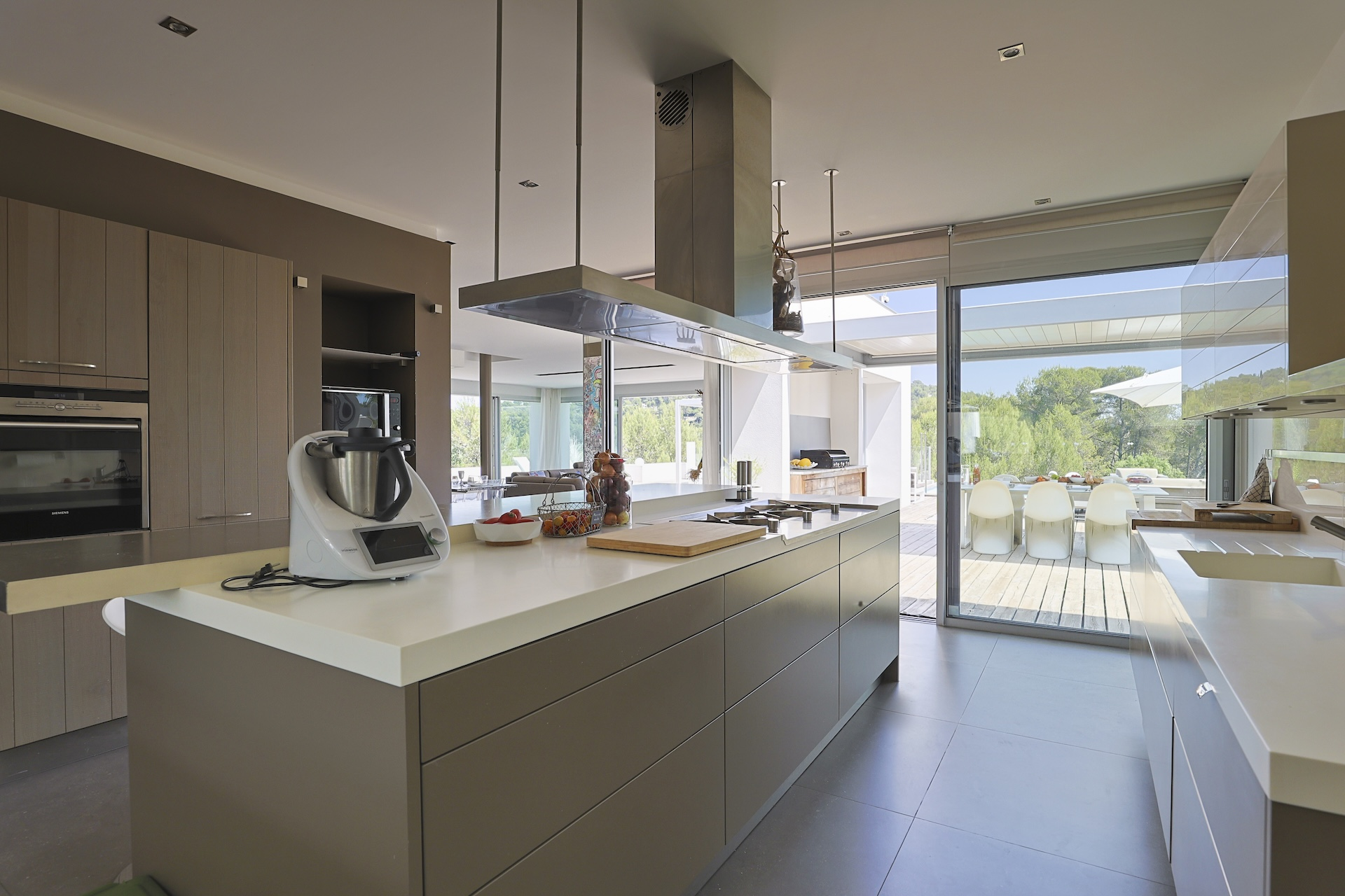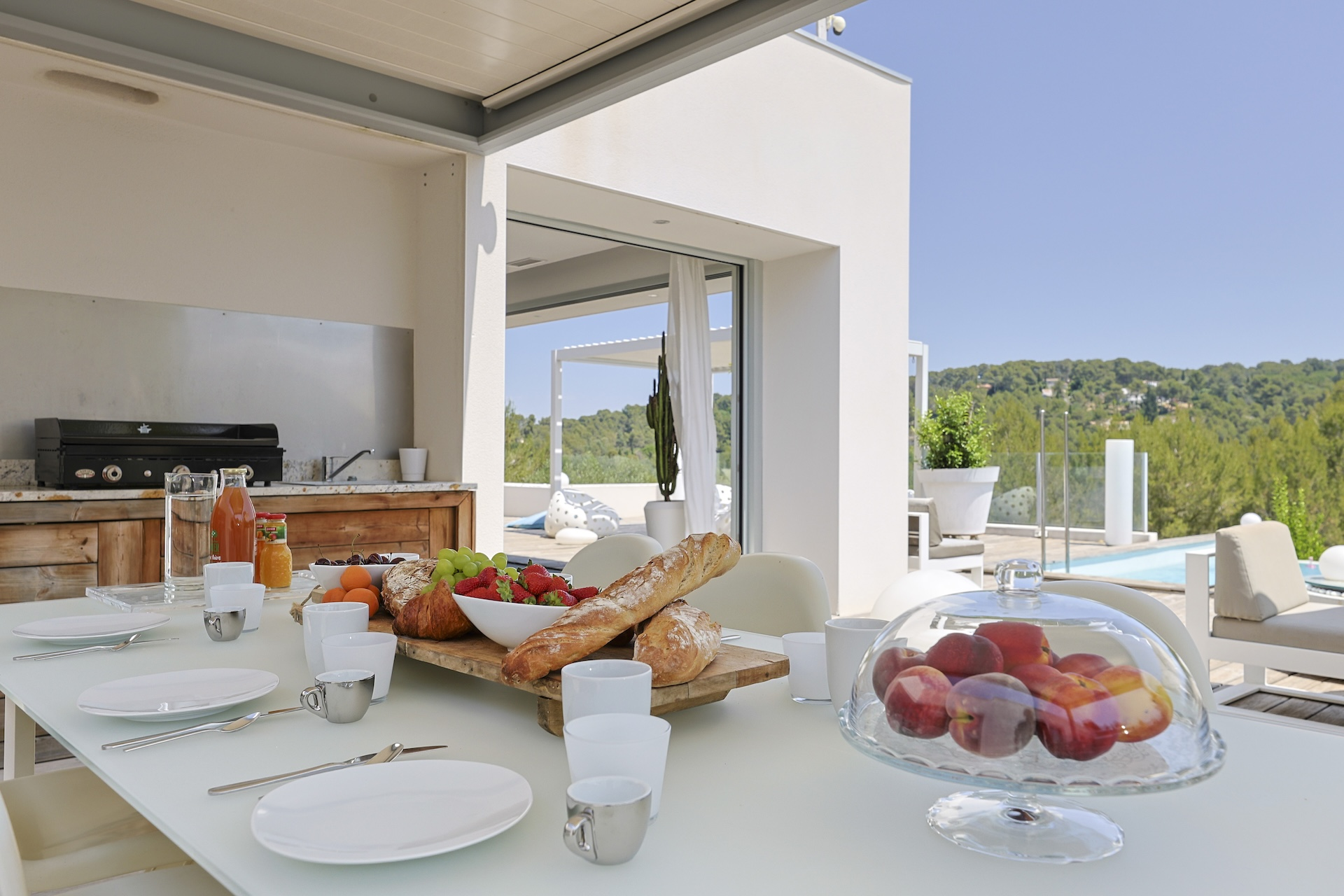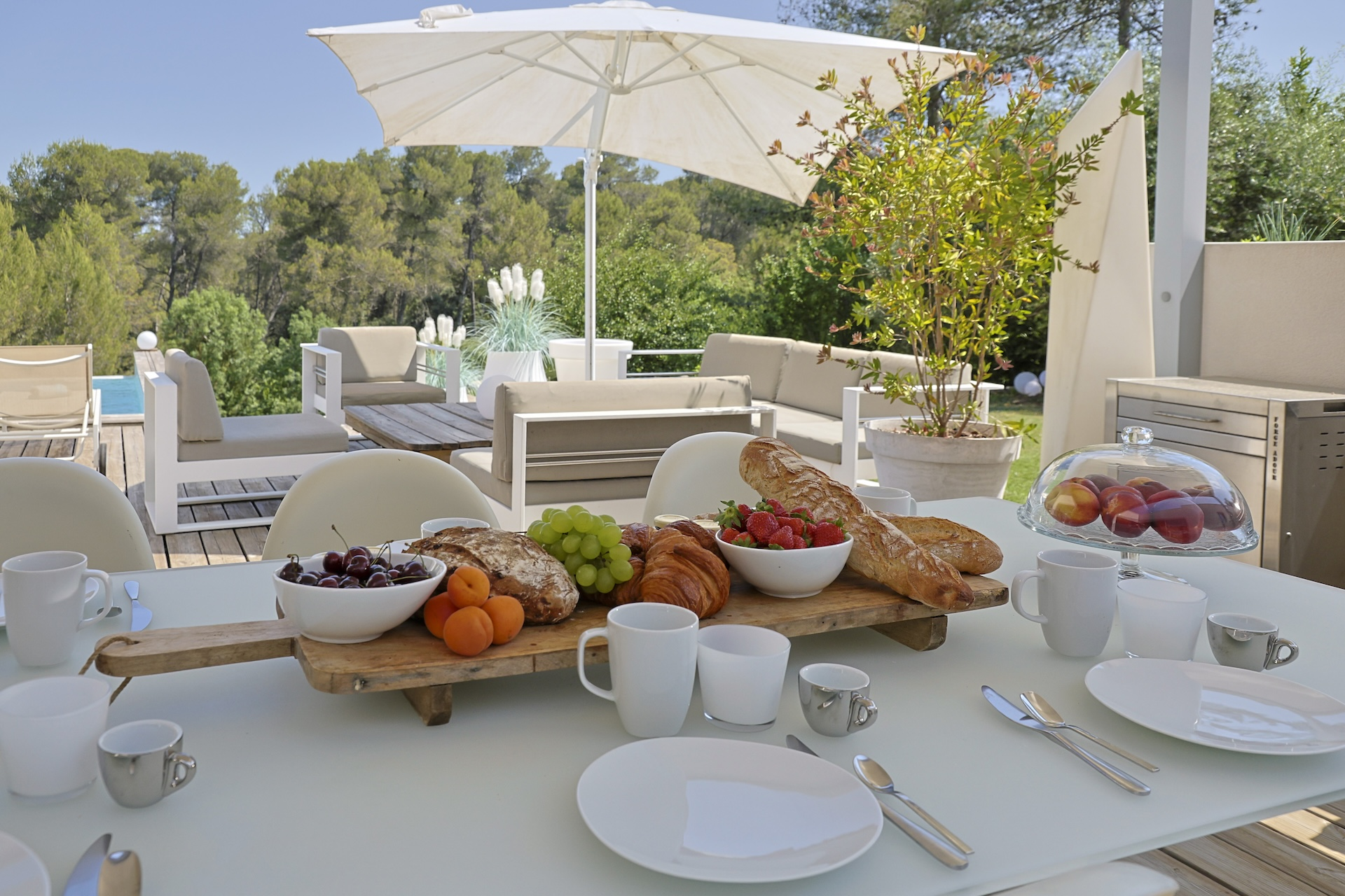 The sleek open kitchen is fully equipped with high-end appliances and a central island, ideal for convivial meals. A large bay window connects the kitchen to a covered outdoor dining terrace complete with plancha, barbecue, and a table overlooking the pool and countryside — perfect for alfresco dinners.