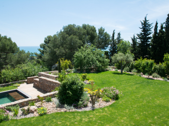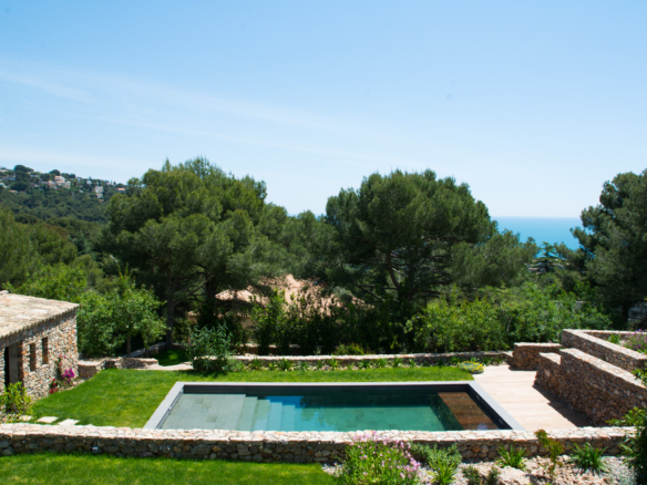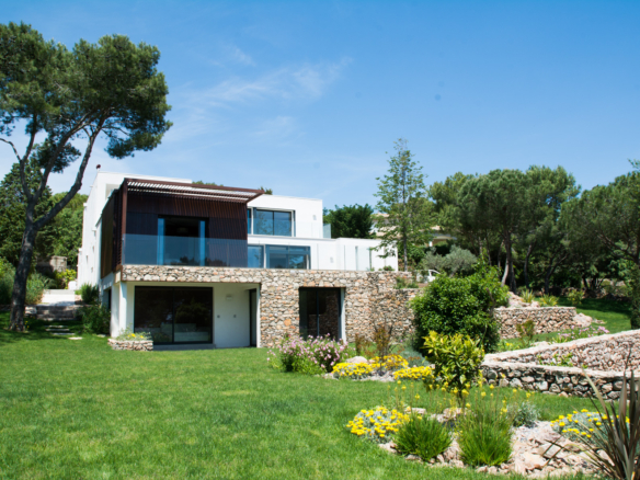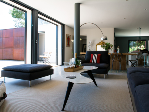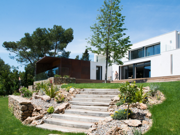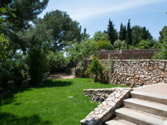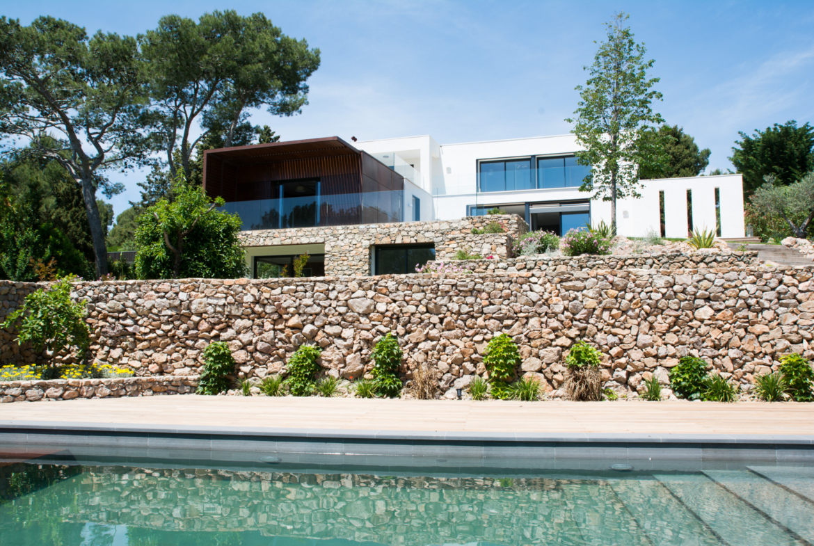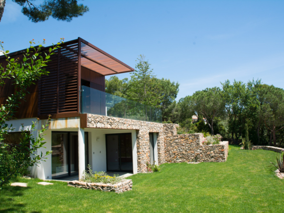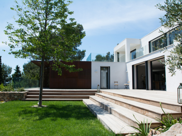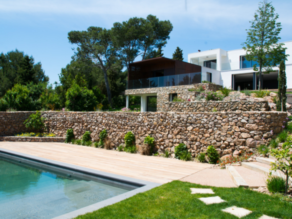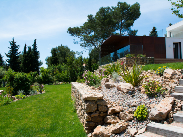 The Villa is nestled within a peaceful environment, at the end of a cul-de-sac, protected from any nighbours’ gaze. Guests will love to relax in the beautiful mediterranean landscaped garden shaped with typical dry stone low walls on several levels, pool area, lawn, pétanque court, shifting from direct sunlight to cool, shaded corners. A true green outdoor haven. This 250m2 house is build using a very chic mix of dry stone, immaculate white stucco walls and corten (rusty-finish alloy steel)