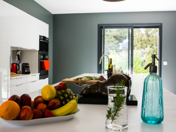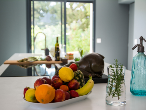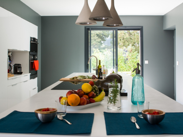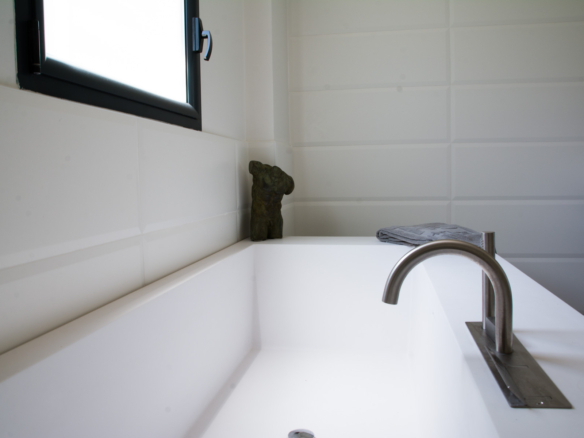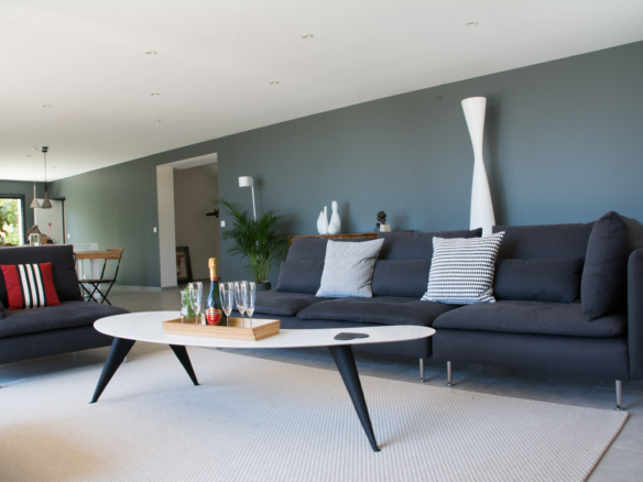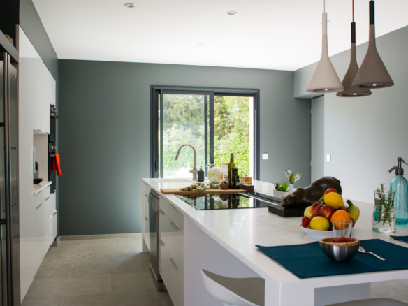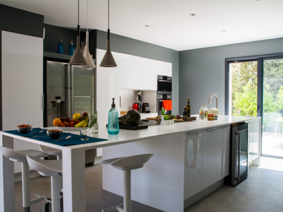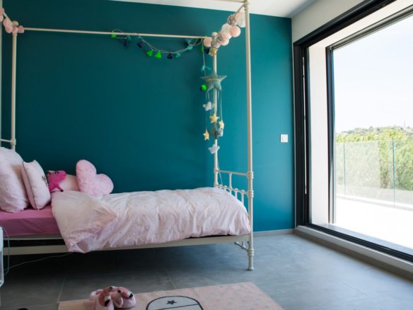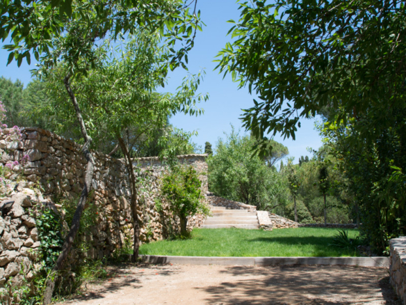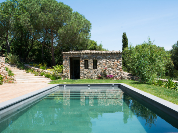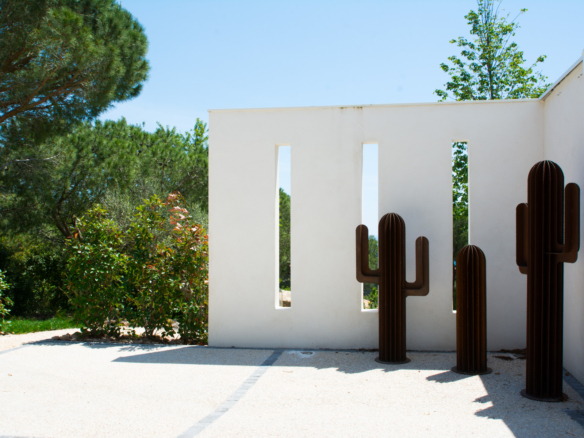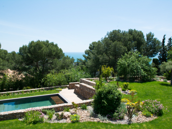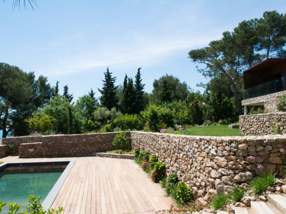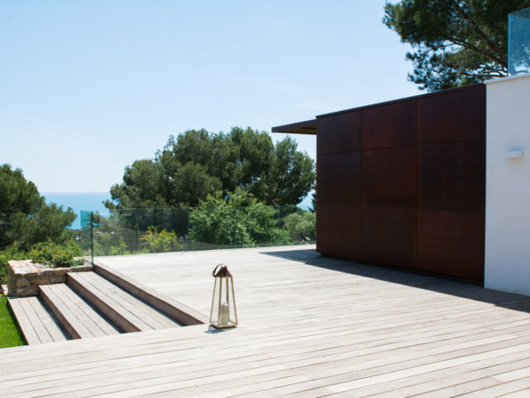 The Villa is nestled within a peaceful environment, at the end of a cul-de-sac, protected from any nighbours’ gaze. Guests will love to relax in the beautiful mediterranean landscaped garden shaped with typical dry stone low walls on several levels, pool area, lawn, pétanque court, shifting from direct sunlight to cool, shaded corners. A true green outdoor haven. This 250m2 house is build using a very chic mix of dry stone, immaculate white stucco walls and corten (rusty-finish alloy steel)