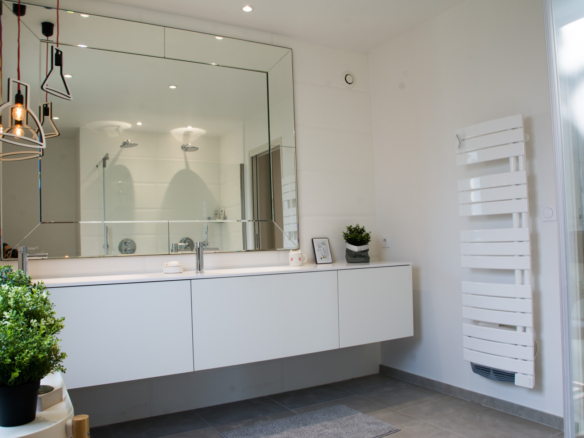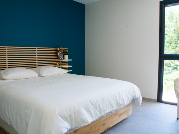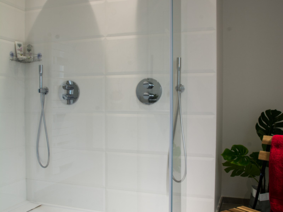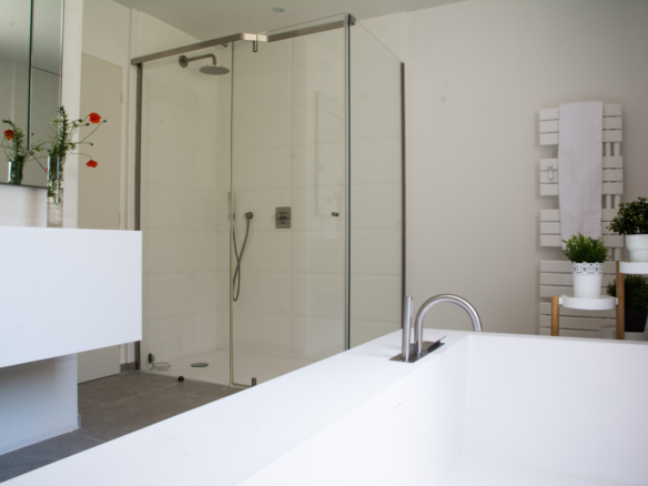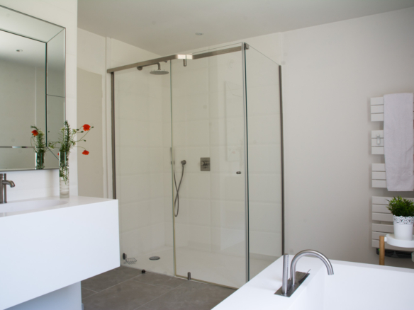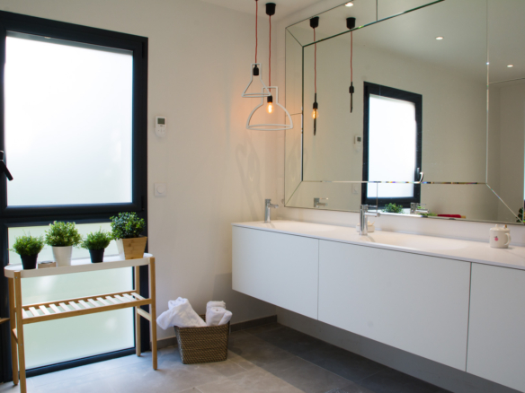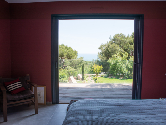 On the garden level, below the main floor and accessible by the garden only, there are two more double bedrooms each with its own shower room, and large sliding glass doors to enjoy the garden and the sea view in the distance.