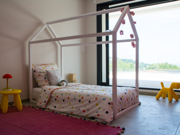 On the first floor, the staircase leads to a relaxing open space with sofa and carpet. There are two large children’s bedrooms, with single beds, and another bedroom with a queen-size bed. All three bedrooms are connected by an incredibly beautiful terrace with direct sea views, which is protected by a framelss, transparent safety railing. A fourth bedroom with windows to the east and queen-size bed is found on this floor. These four bedrooms share a large shower room and a separate toilet.