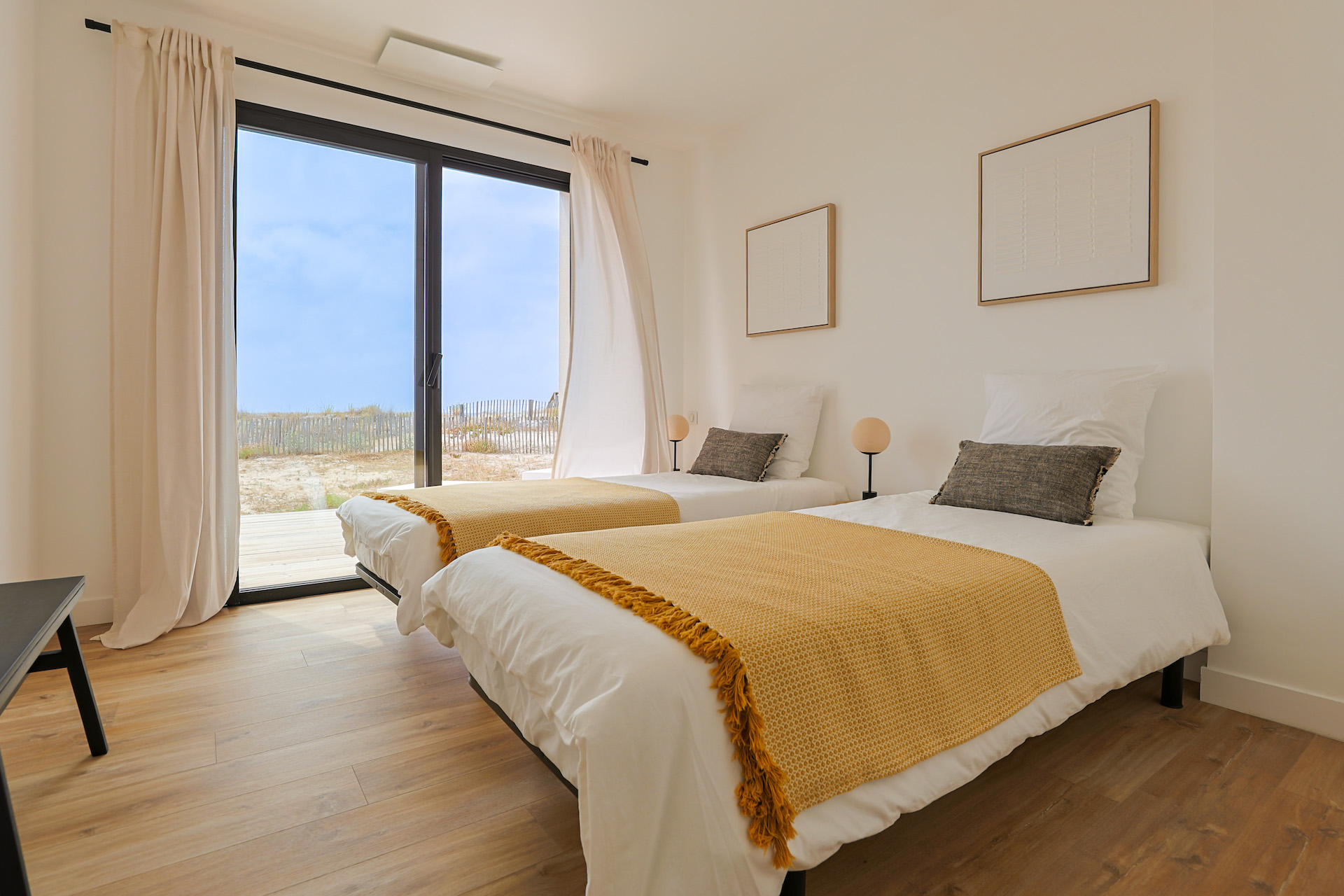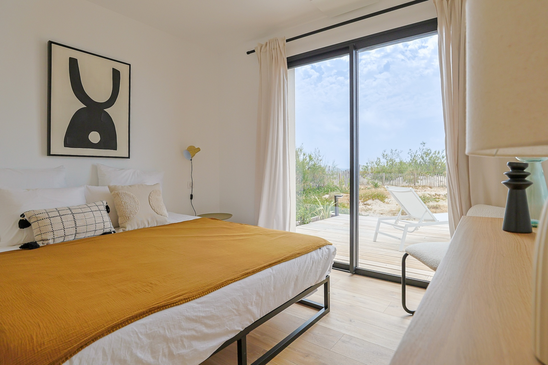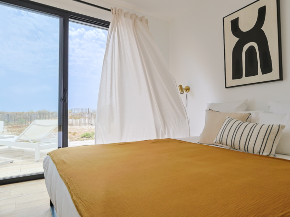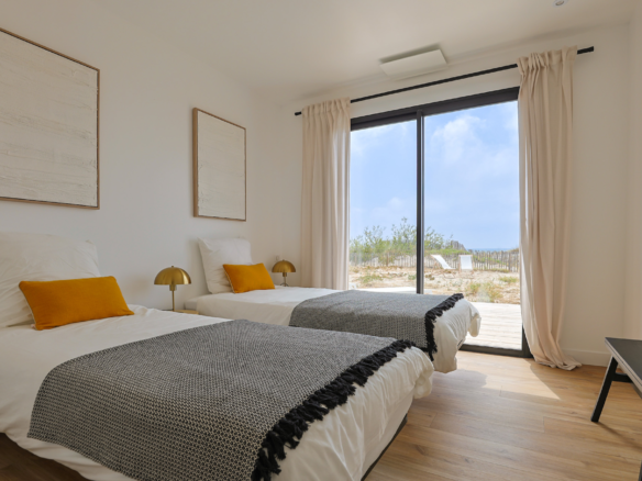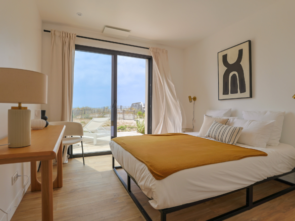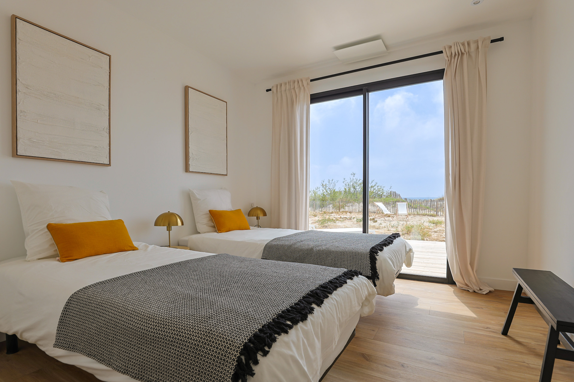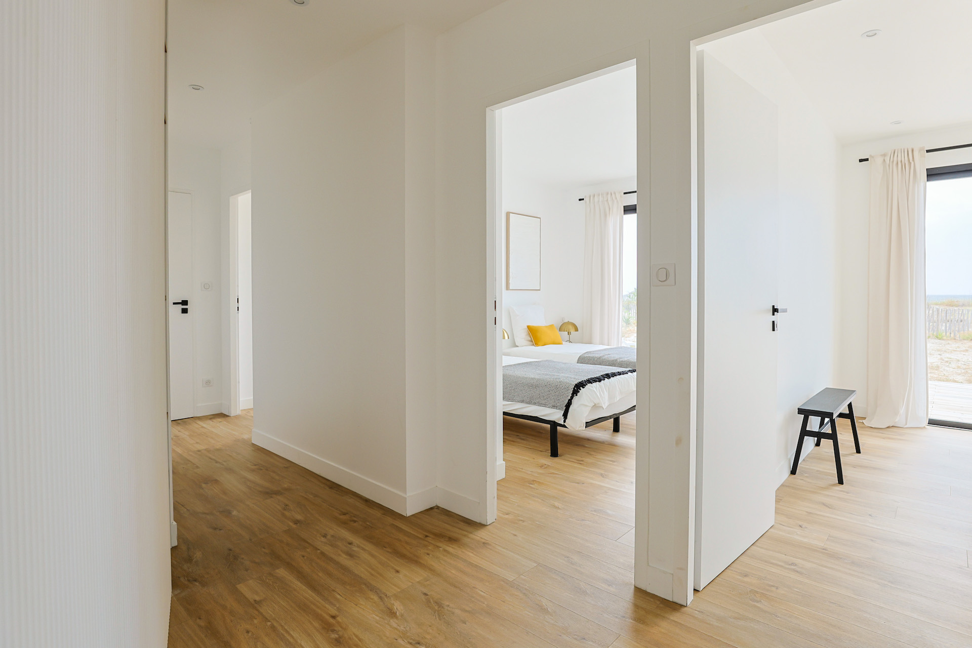 Rising a couple of steps, the entrance of the house leads to a spacious hallway that connects two double bedrooms and two twin bedrooms, each with its own access to a beach-facing terrace equipped with sundeck chairs. These bedrooms are served by two stylish shower rooms, and a large laundry room is tucked at the back of the floor.