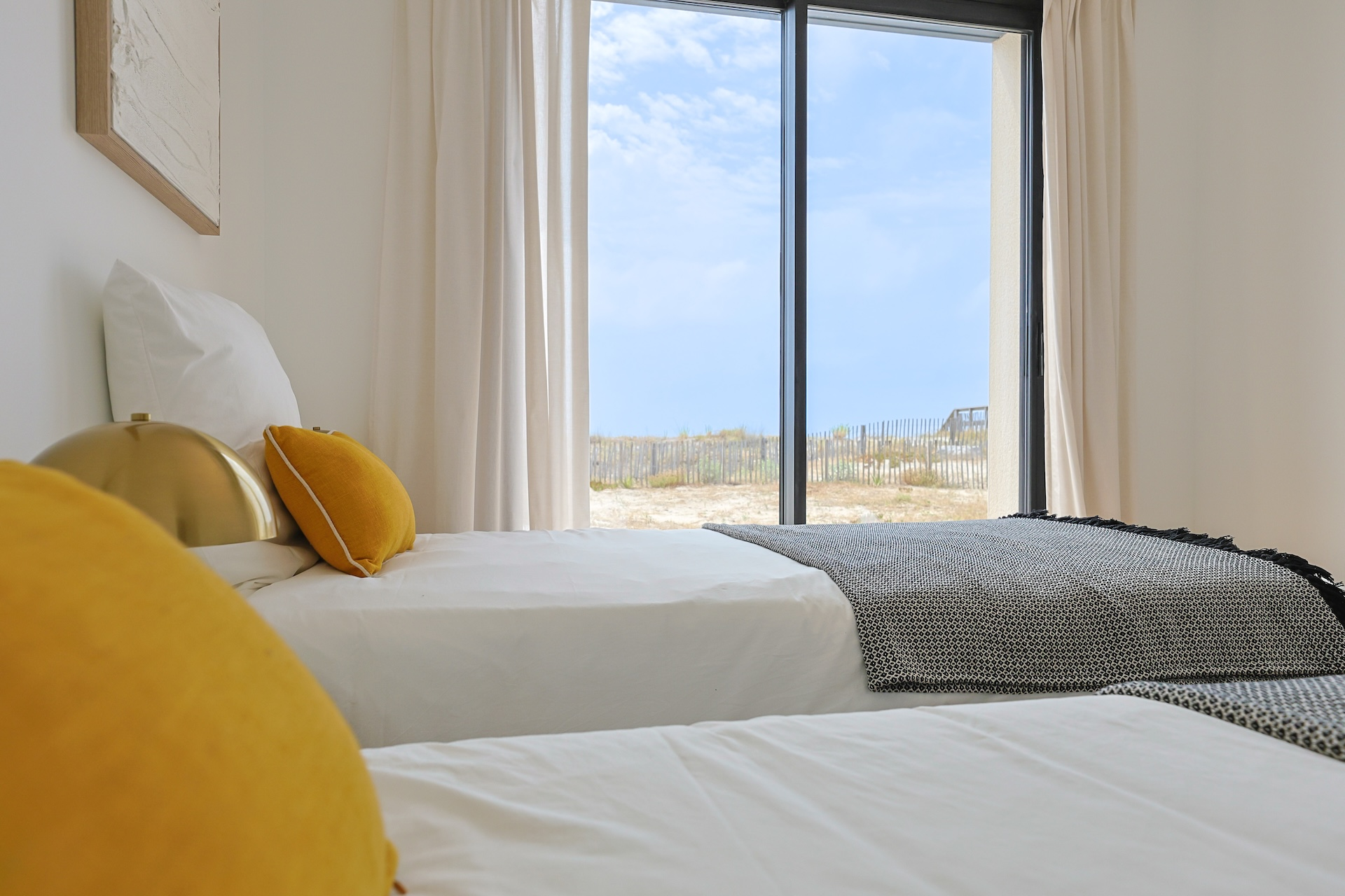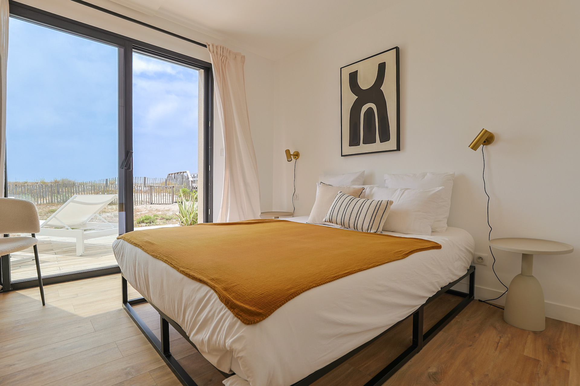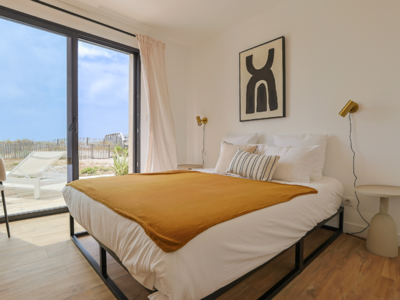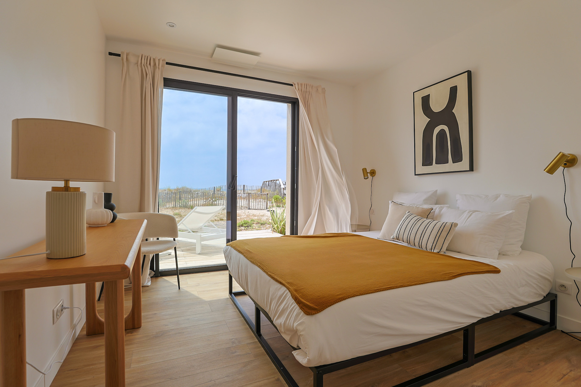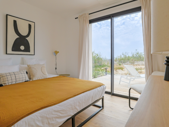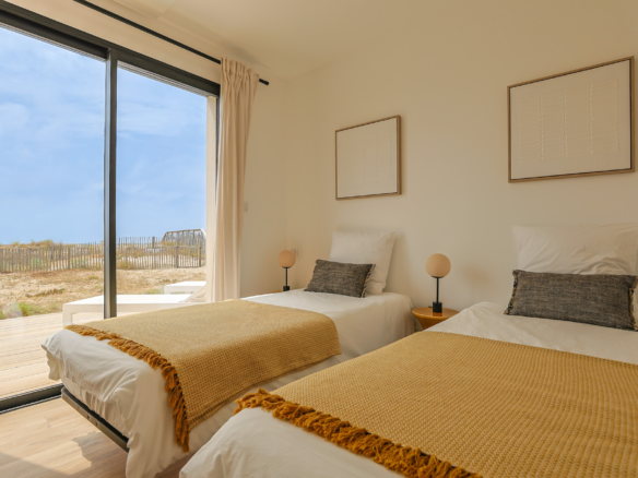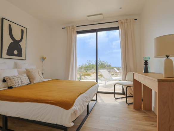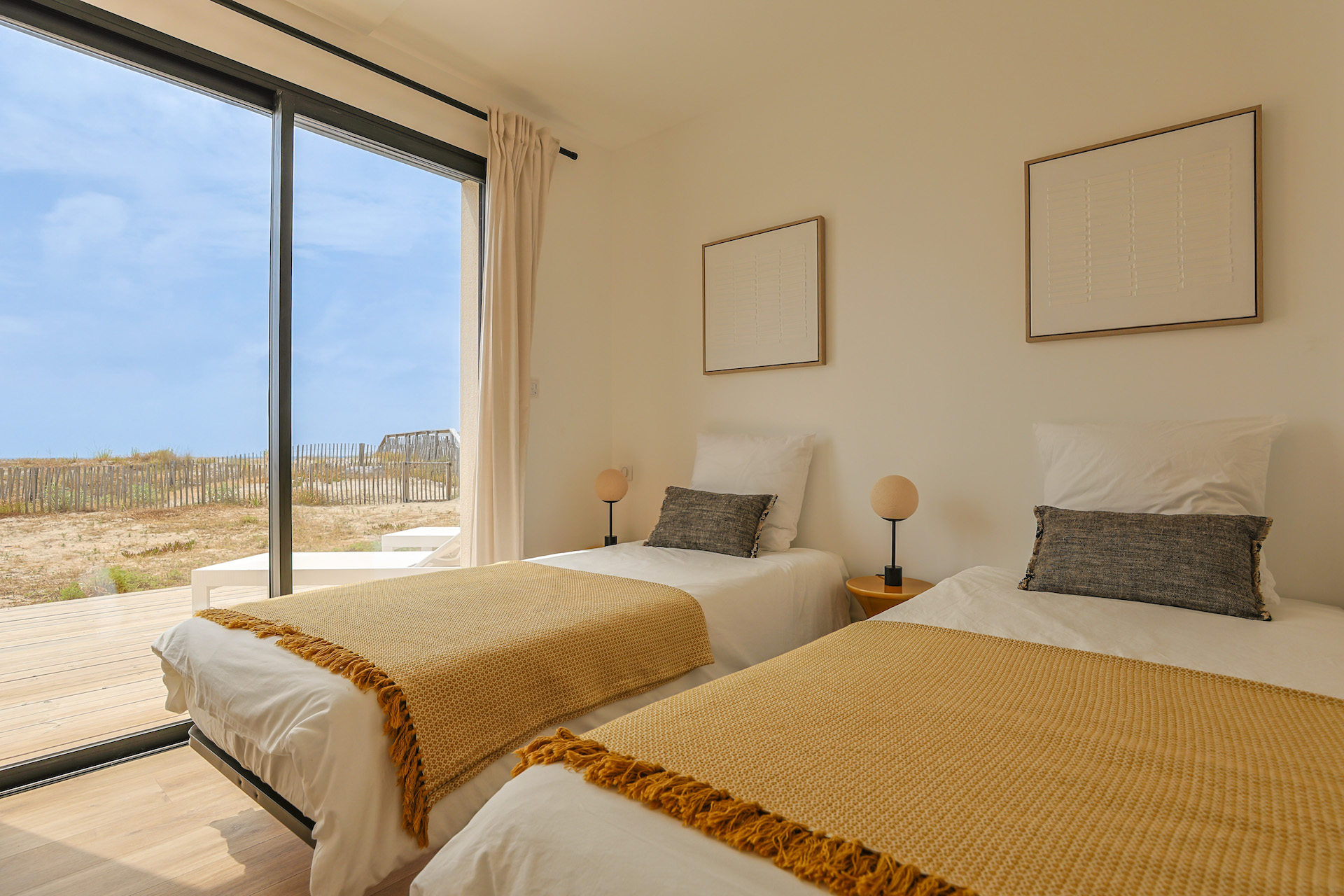 Rising a couple of steps, the entrance of the house leads to a spacious hallway that connects two double bedrooms and two twin bedrooms, each with its own access to a beach-facing terrace equipped with sundeck chairs. These bedrooms are served by two stylish shower rooms, and a large laundry room is tucked at the back of the floor.