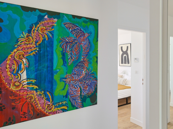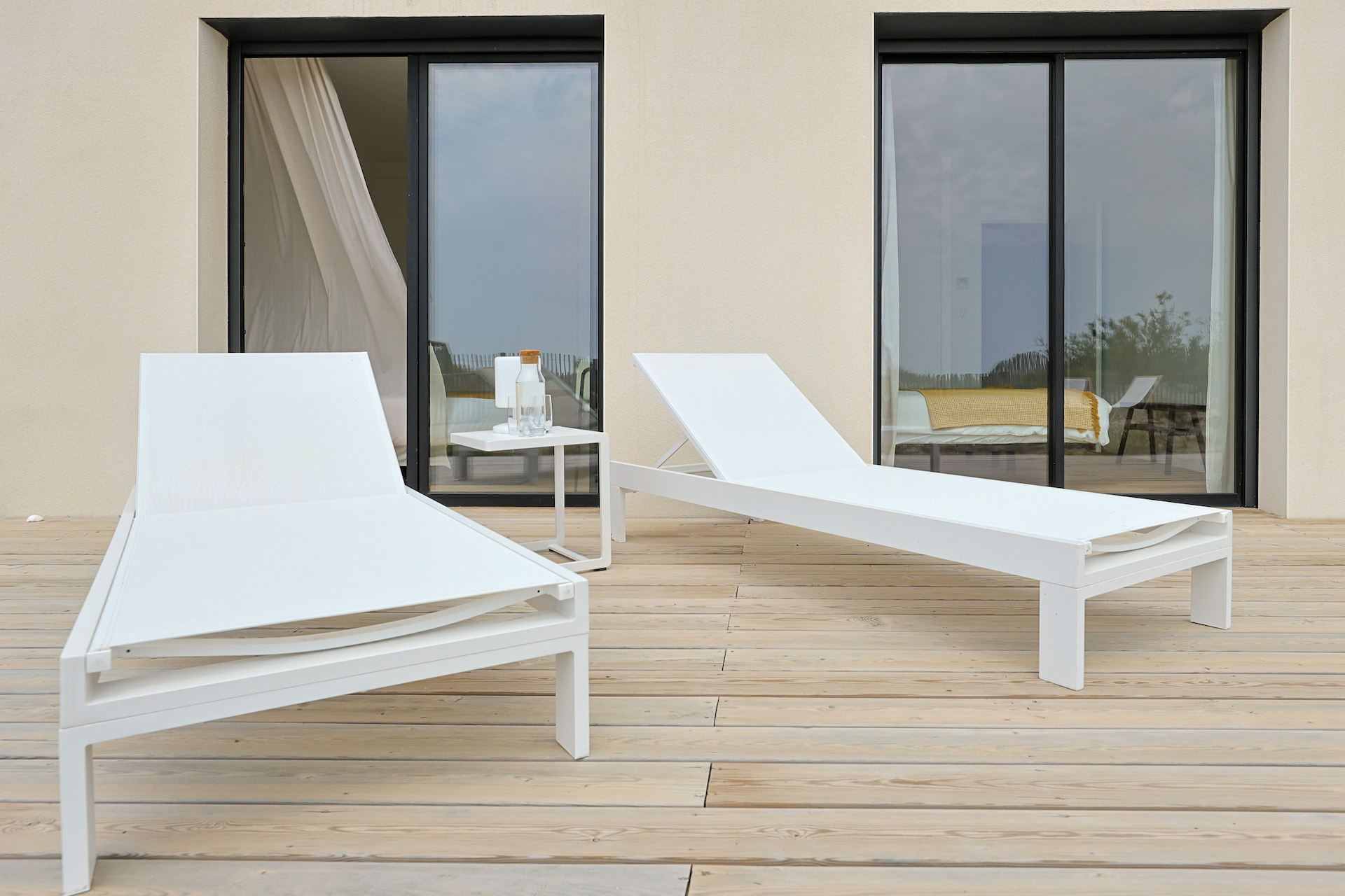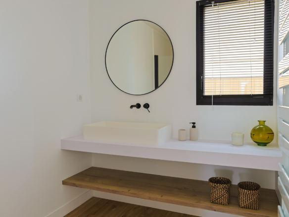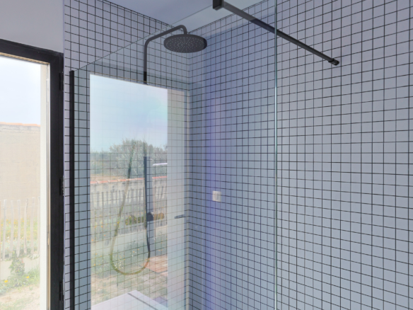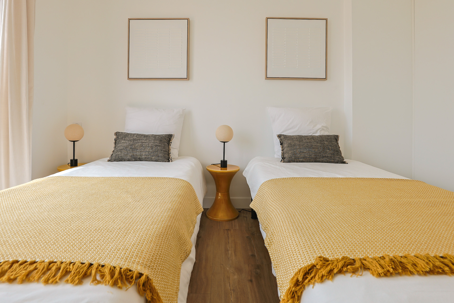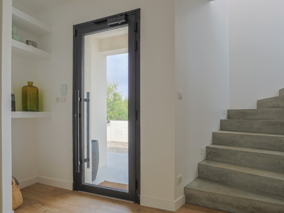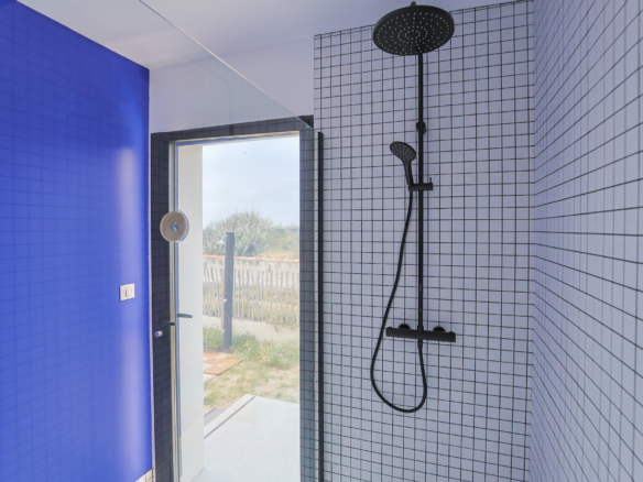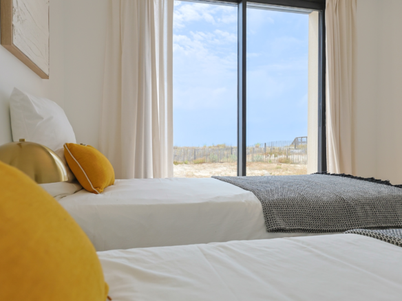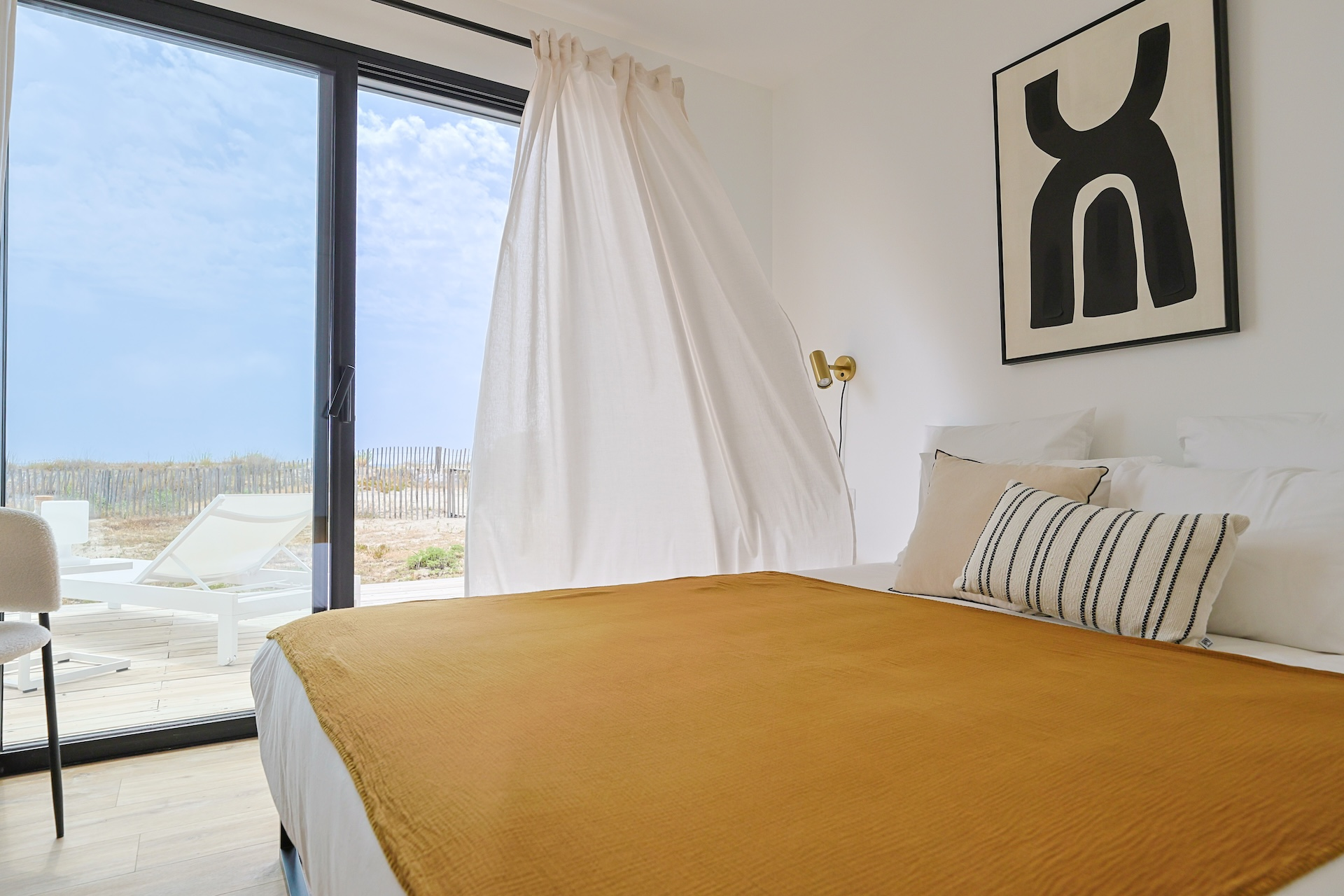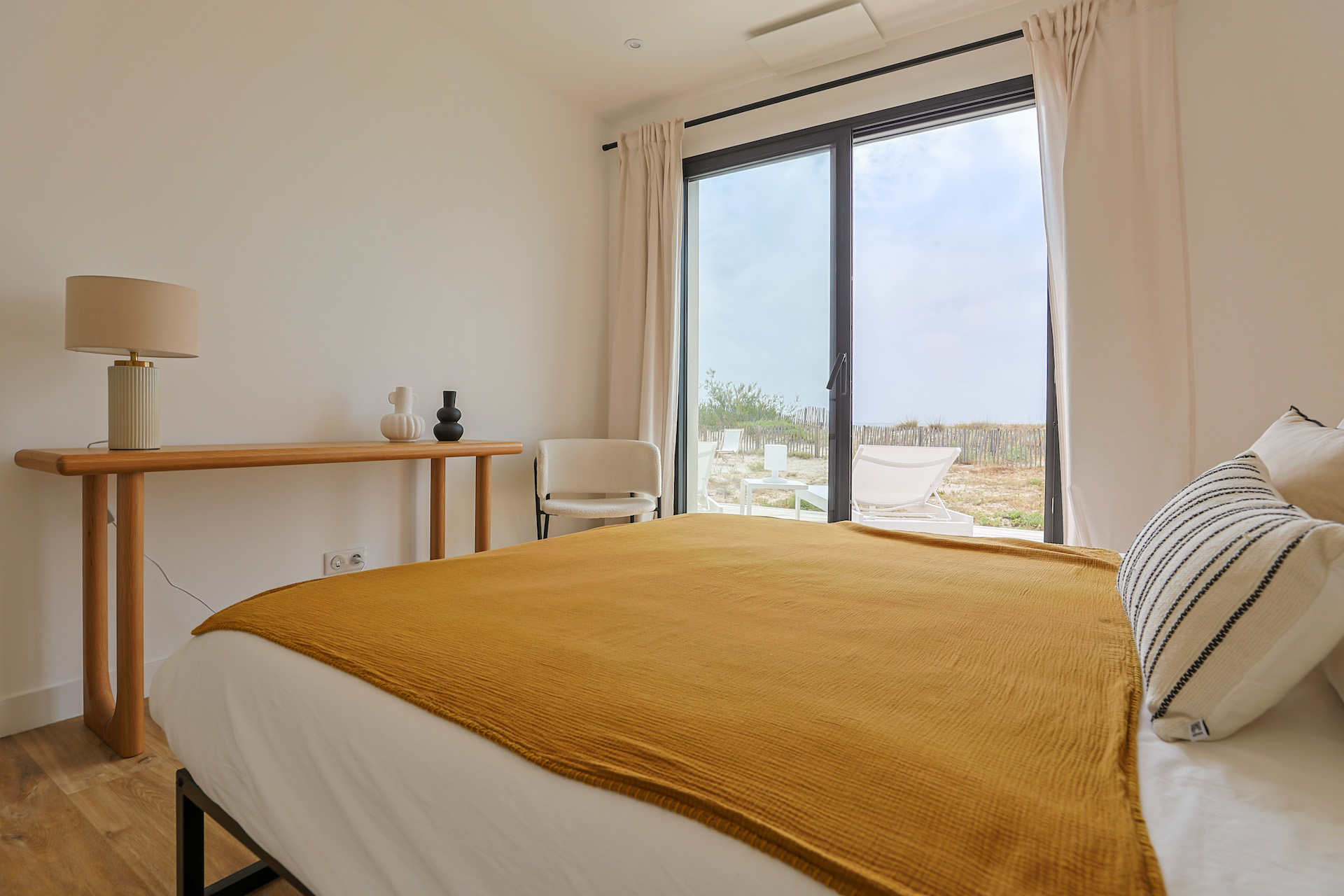 Rising a couple of steps, the entrance of the house leads to a spacious hallway that connects two double bedrooms and two twin bedrooms, each with its own access to a beach-facing terrace equipped with sundeck chairs. These bedrooms are served by two stylish shower rooms, and a large laundry room is tucked at the back of the floor.
