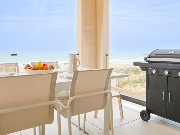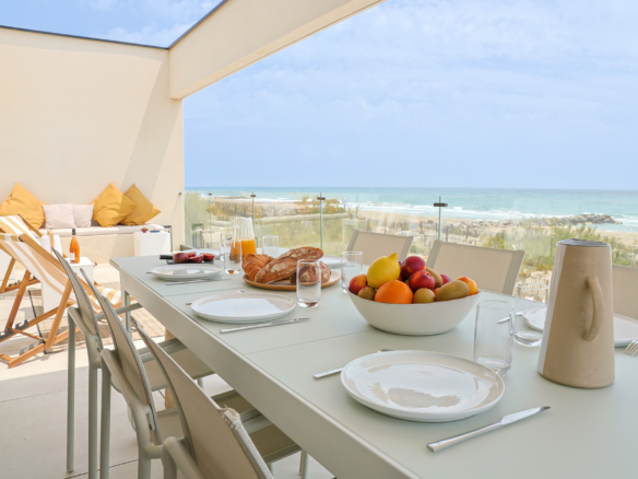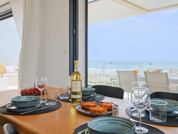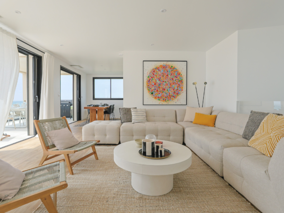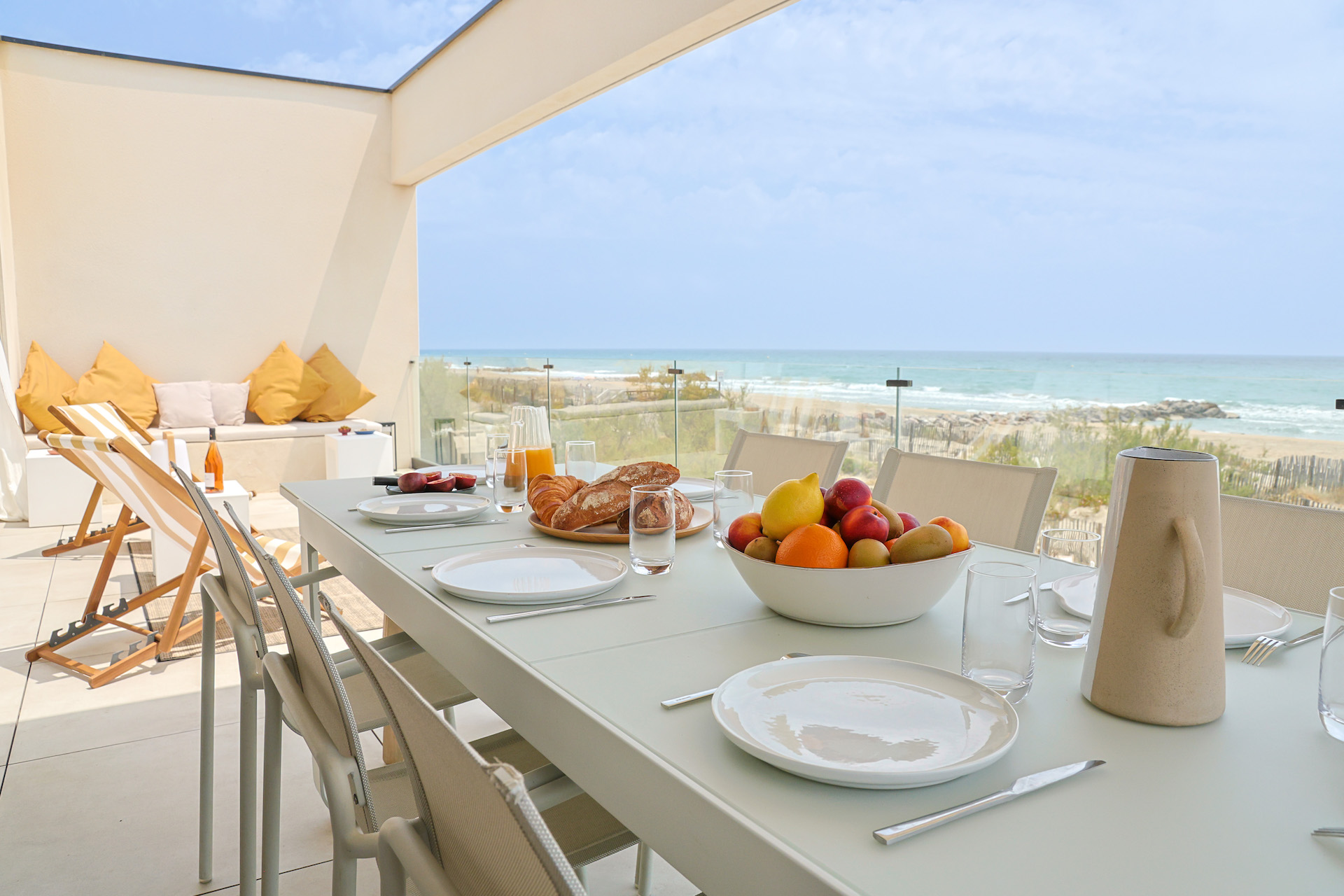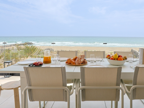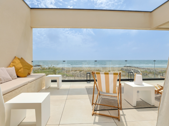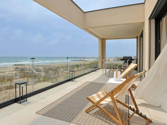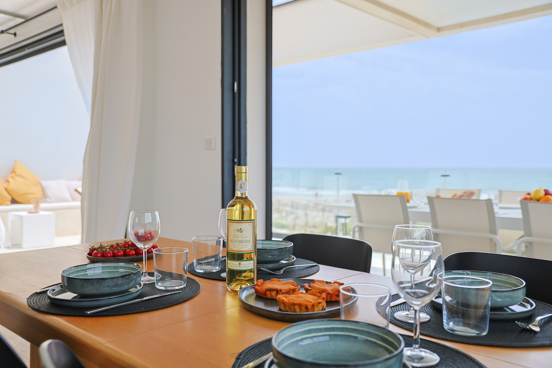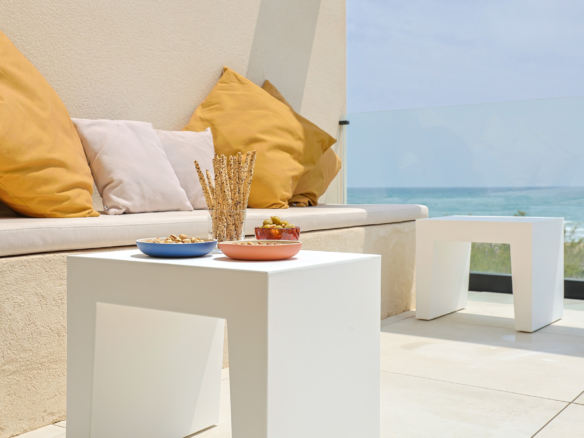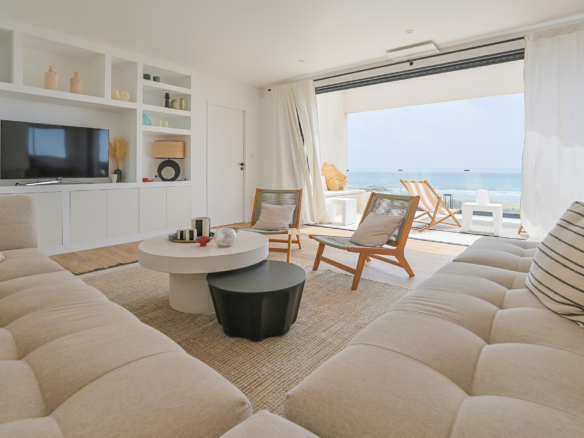 The spacious terrace is designed for relaxation and entertainment, complete with comfortable seating, a dining area, and a barbecue. Glass railings offer uninterrupted views of the beach and the Mediterranean. The indoor-outdoor space encourages guests to enjoy the peaceful seaside setting.