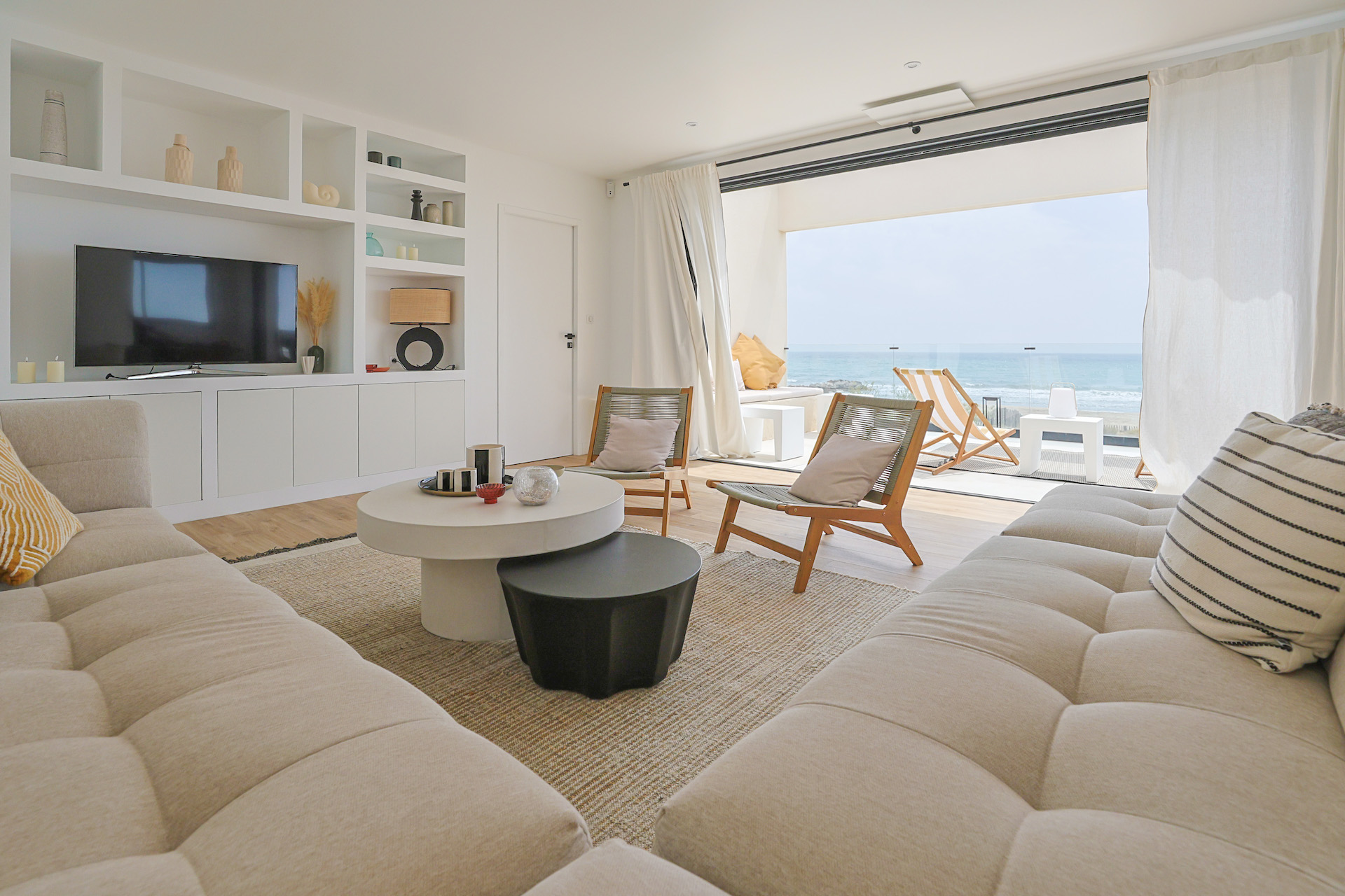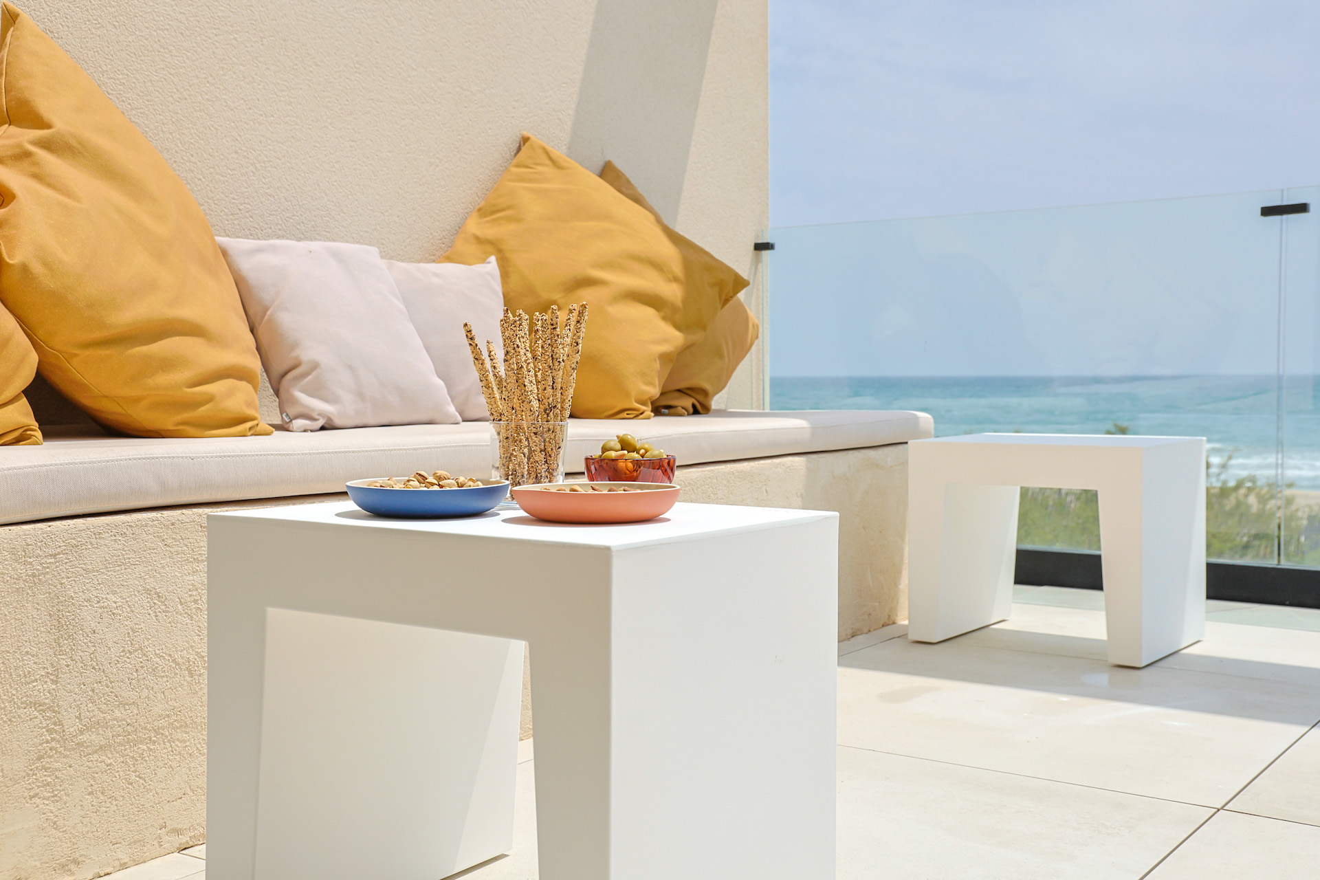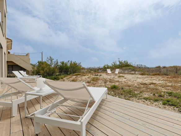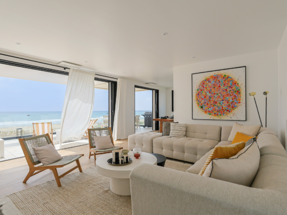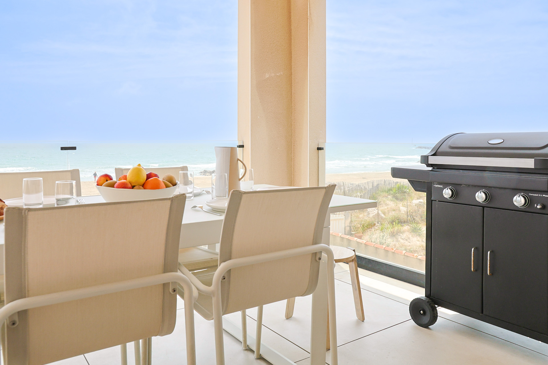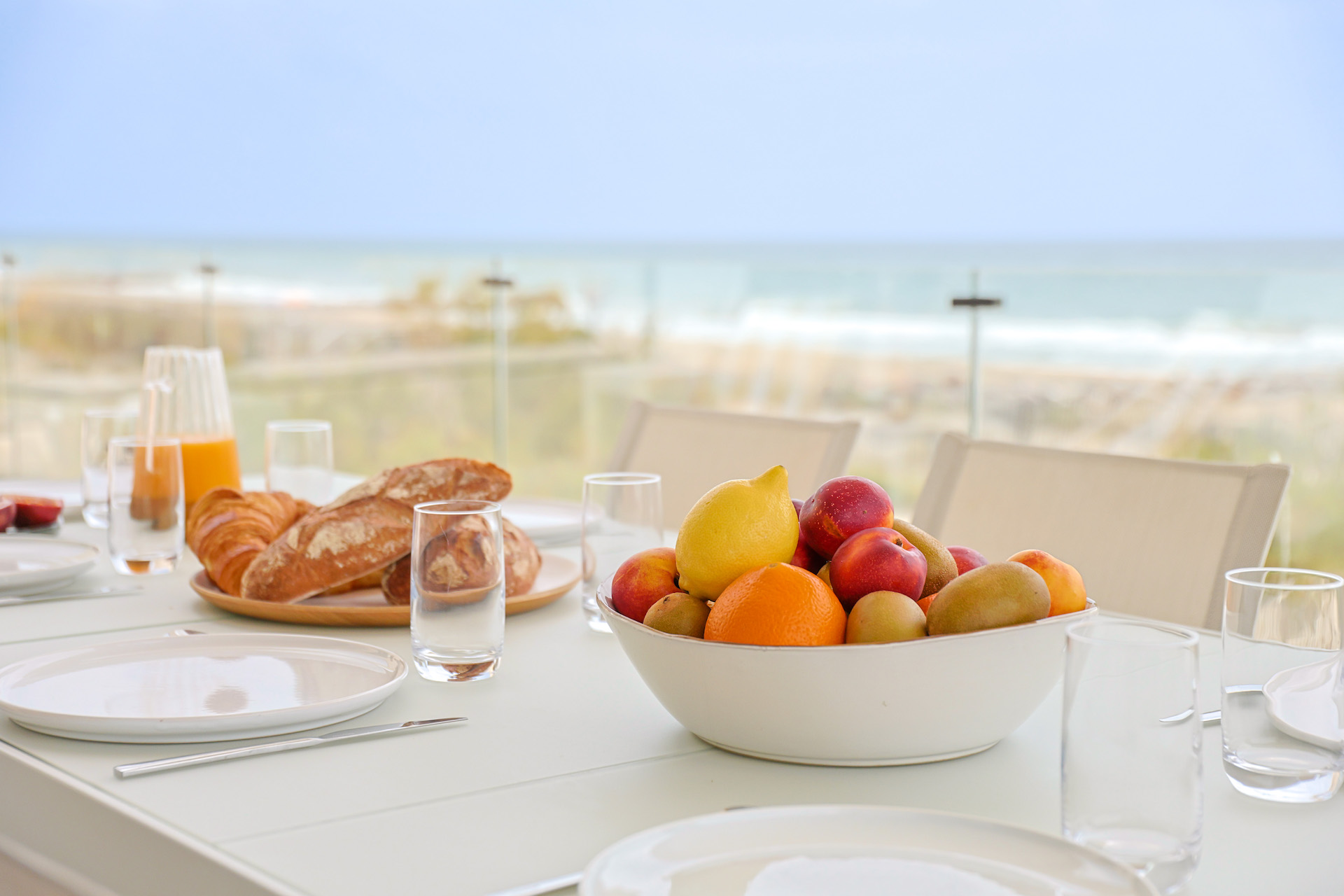 The spacious terrace is designed for relaxation and entertainment, complete with comfortable seating, a dining area, and a barbecue. Glass railings offer uninterrupted views of the beach and the Mediterranean. The indoor-outdoor space encourages guests to enjoy the peaceful seaside setting.