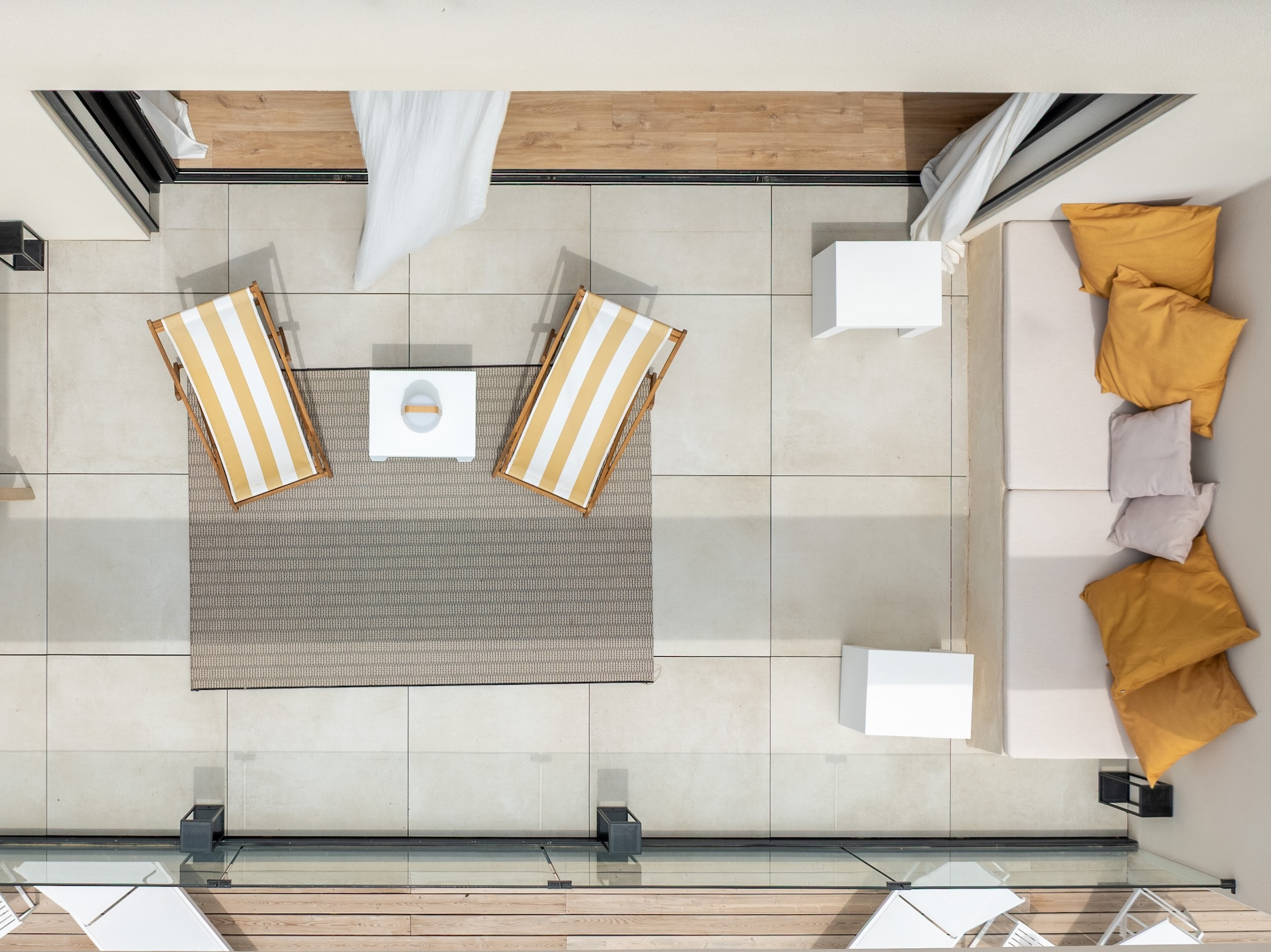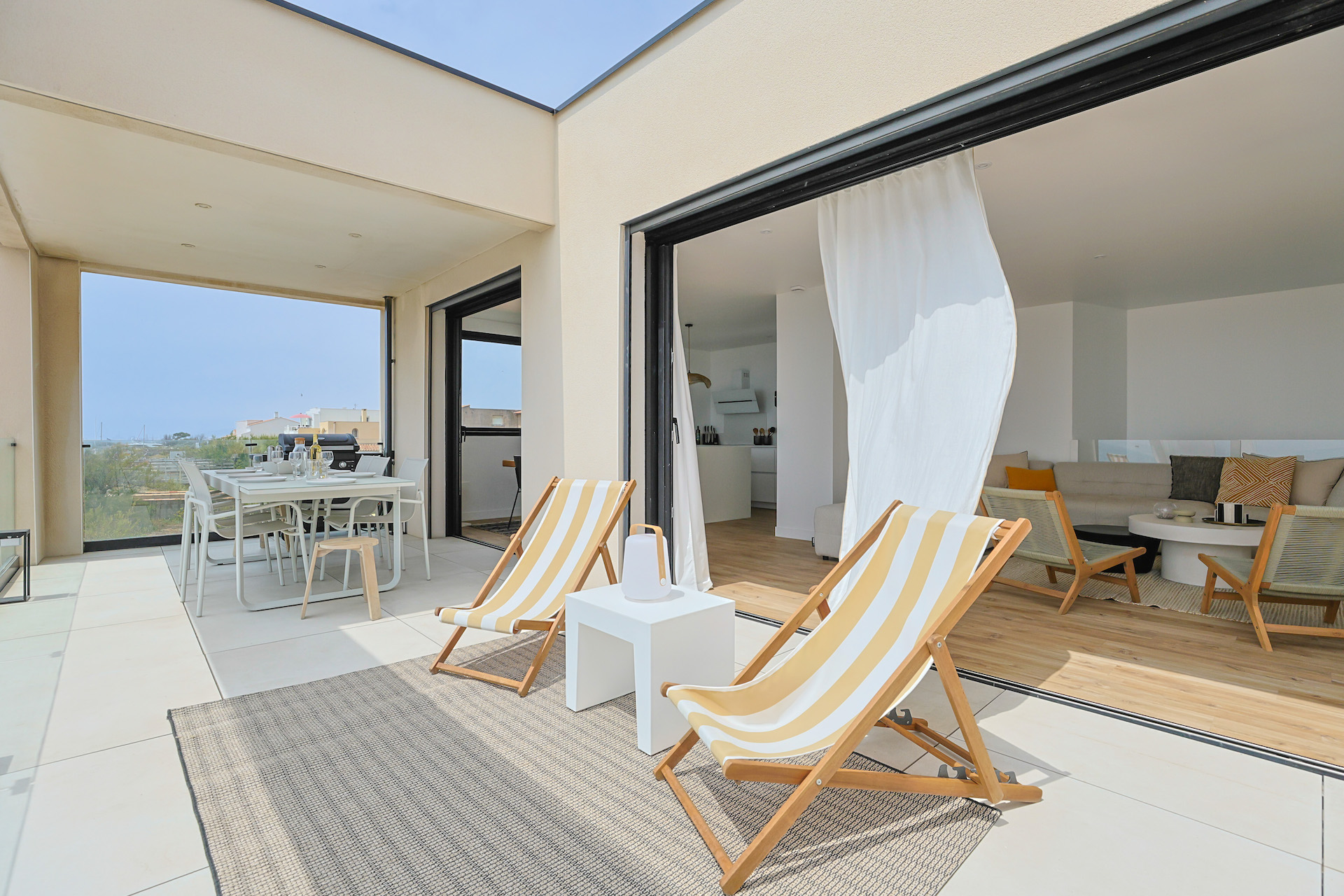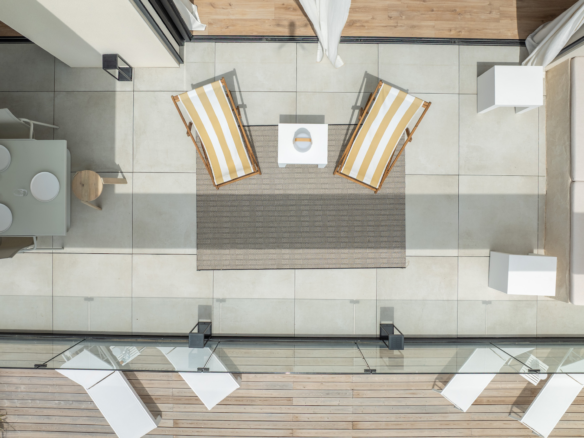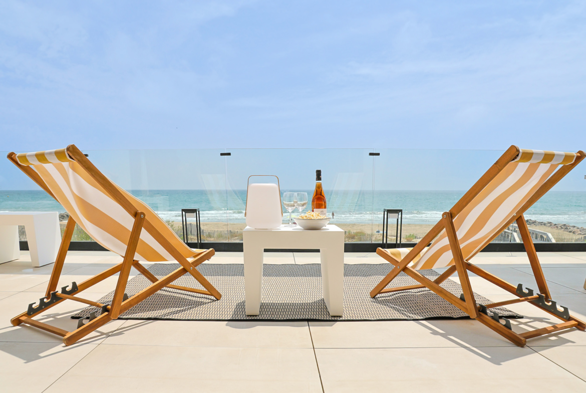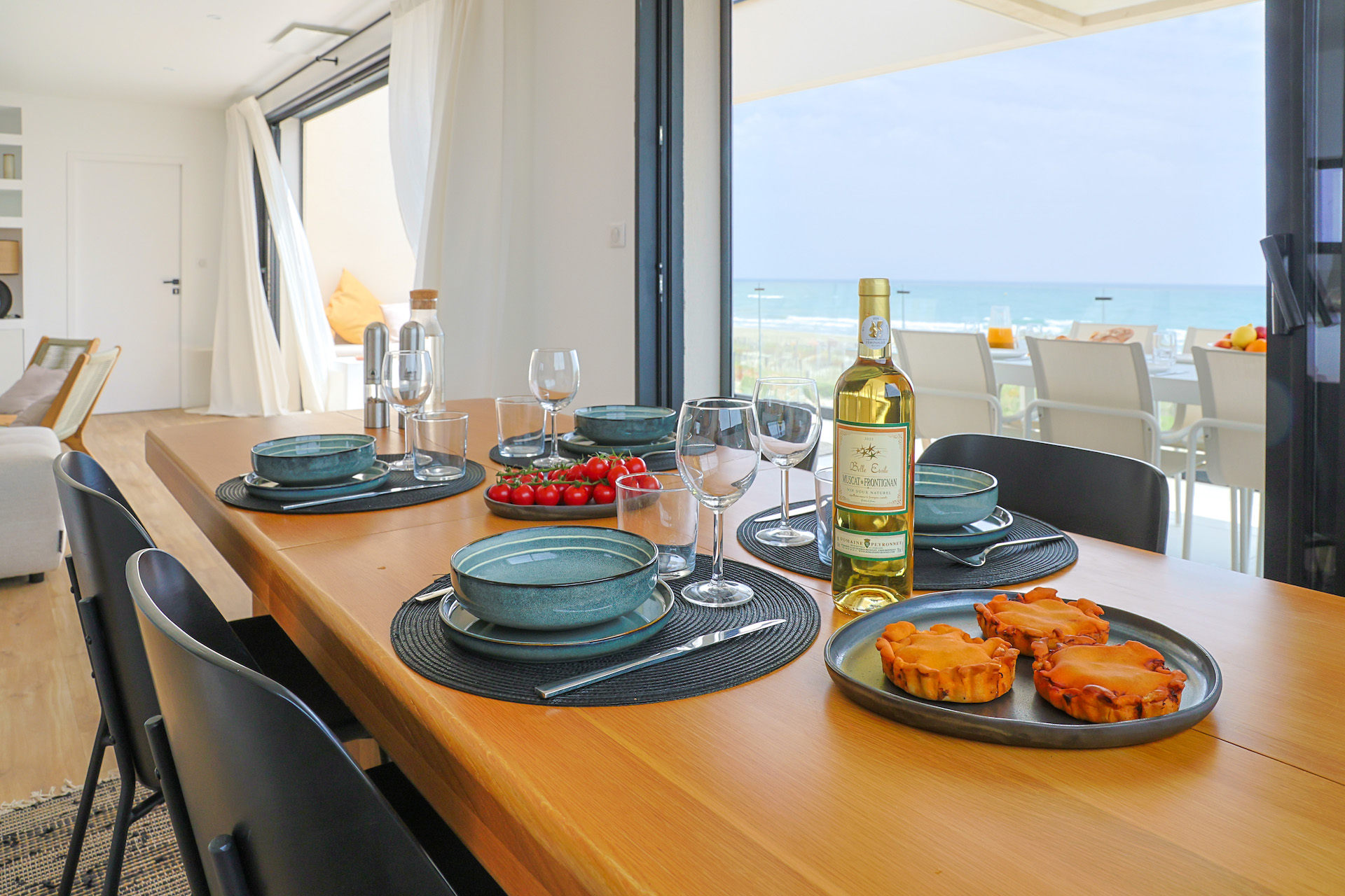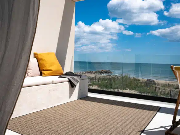 The spacious terrace is designed for relaxation and entertainment, complete with comfortable seating, a dining area, and a barbecue. Glass railings offer uninterrupted views of the beach and the Mediterranean. The indoor-outdoor space encourages guests to enjoy the peaceful seaside setting.