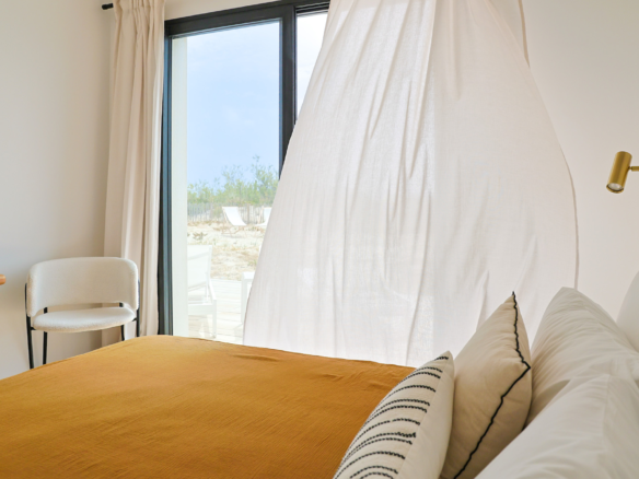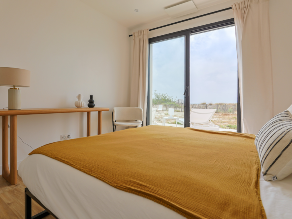 The villa is fully equipped with air-conditioning for added comfort and features high-quality beds for a restful stay. For convenience, a modern outdoor shower room is available on the side of the house, ideal for rinsing off after a day at the beach. A small gate from the garden provides direct access to the sandy shores, allowing guests to easily enjoy the beach.
