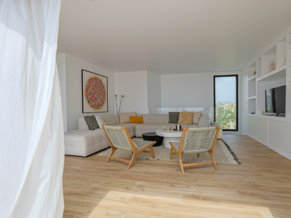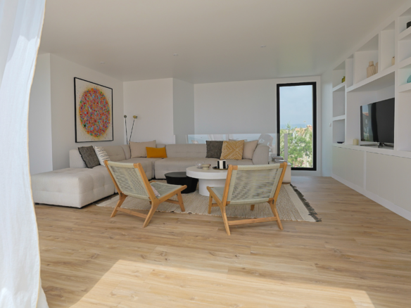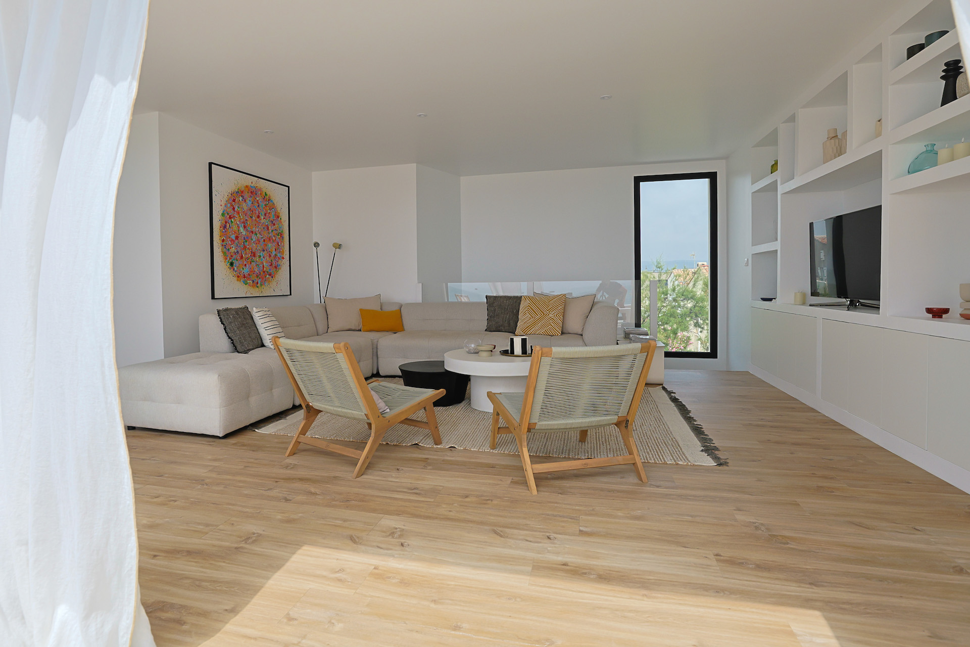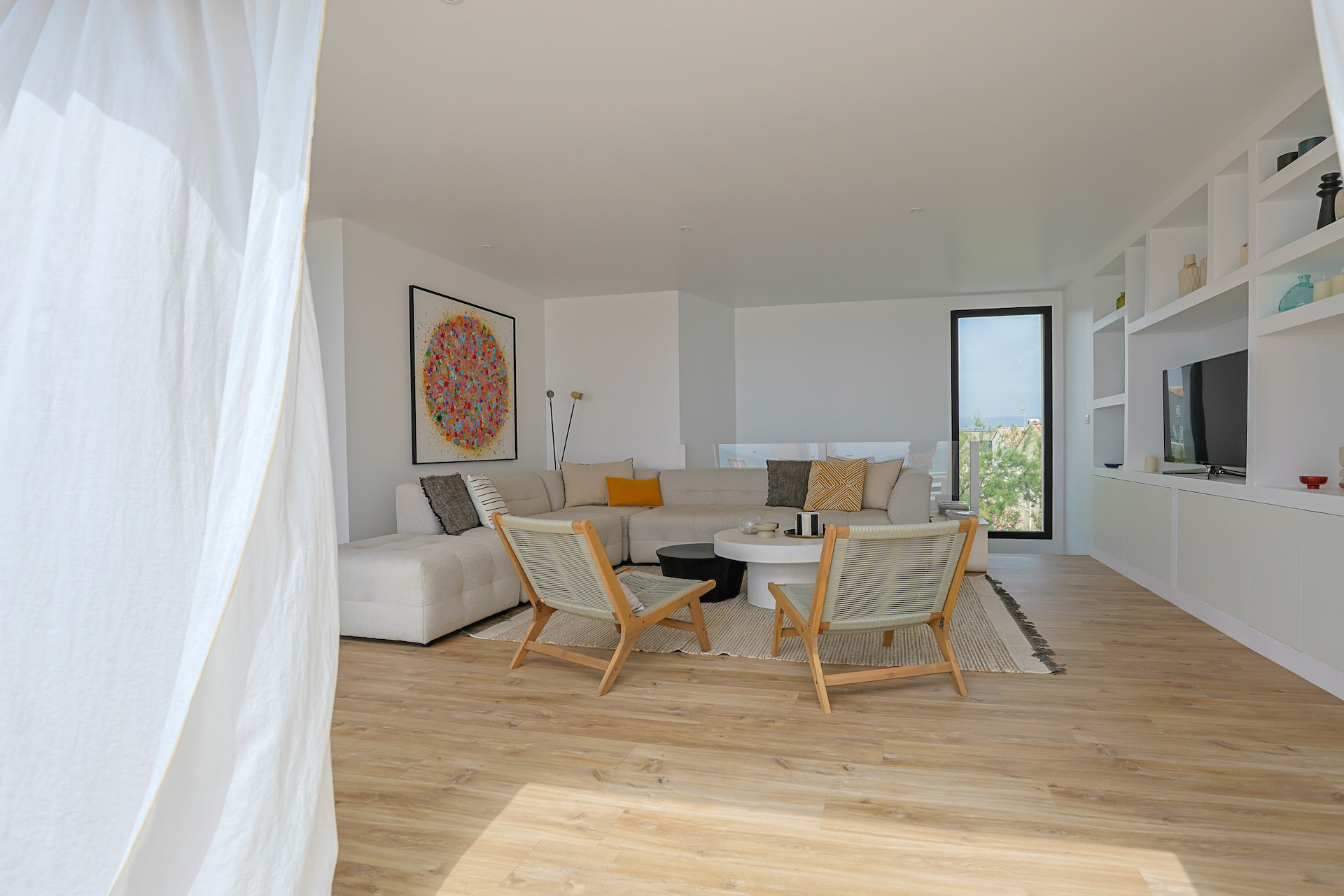 From the hallway, a staircase leads to the first floor, where the living area boasts breathtaking views of the Mediterranean. The living room features elegant, contemporary furniture and opens to a generous terrace. A fully equipped kitchen faces a dining area that flows onto the terrace.
