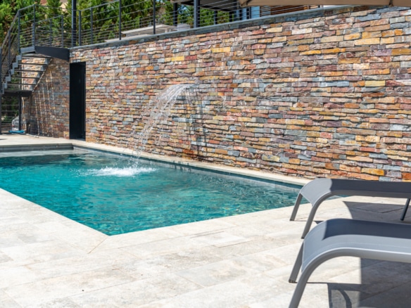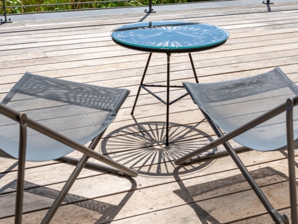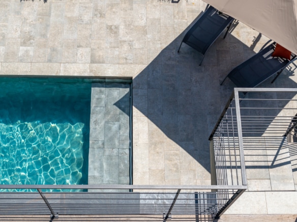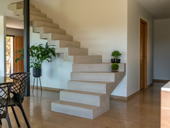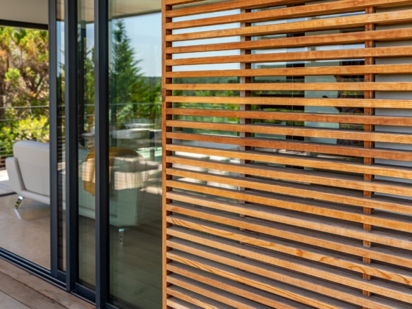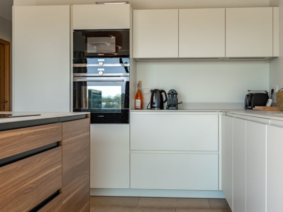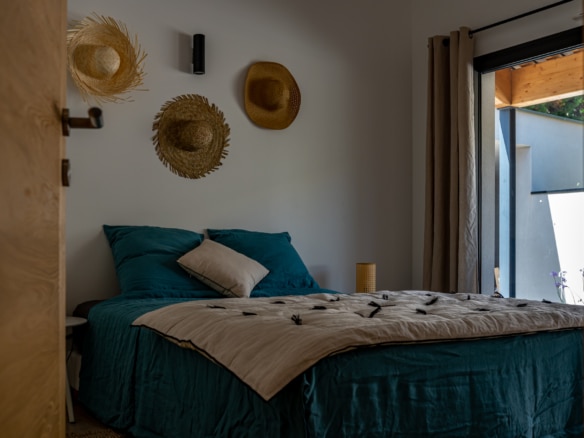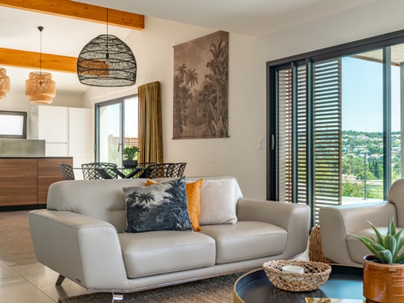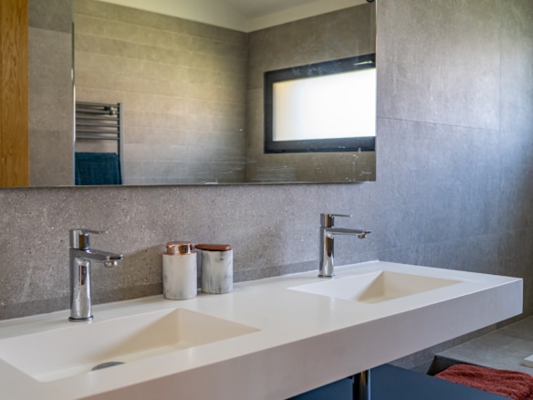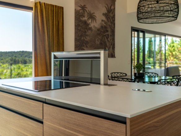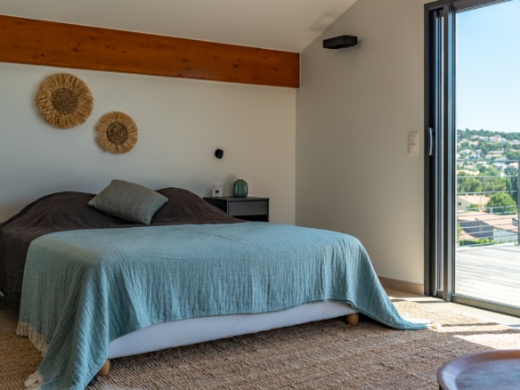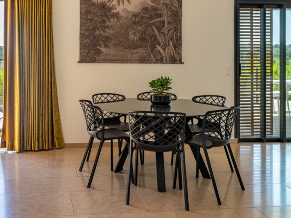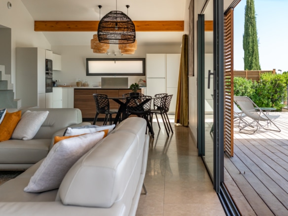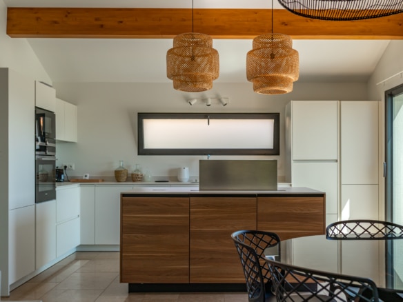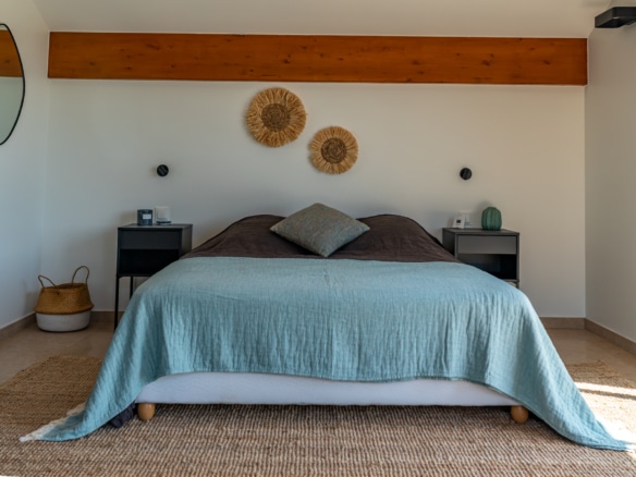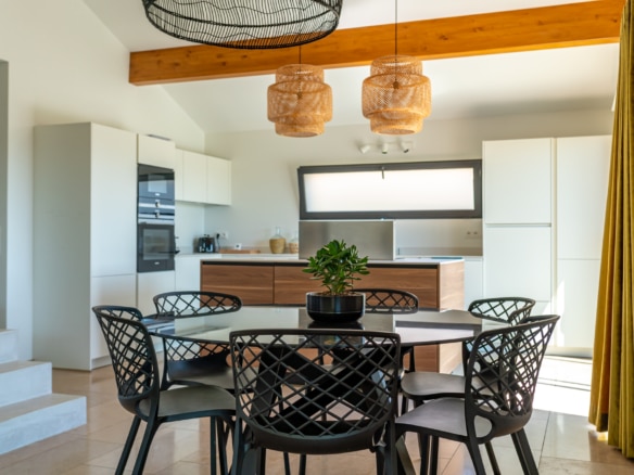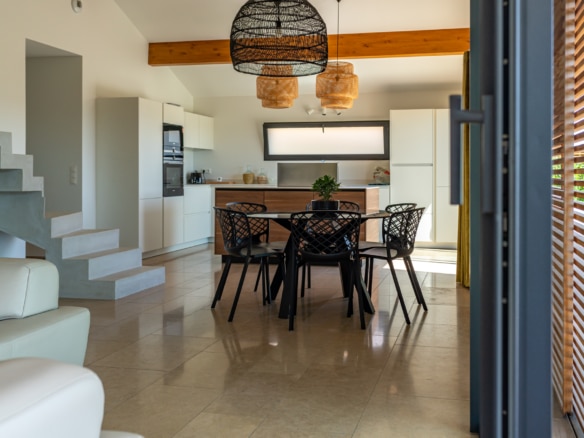 The 170 m2 Villa Vista has been made to exacting standards, using high-quality materials and exquisite finishes. An open floor plan concept welcomes the visitor, allowing an uninterrupted flow from the modern living room equipped with its own flat-screen tv and fashionable leather sofas to the dining area. Being fully equipped, the kitchen, with its spacious central island, is light and airy with nice contemporary lines to complement its modern style. This room lets in bountiful natural lighting with its floor to ceiling corner-windows so that whether you’re inside relaxing in the living room or outside enjoying the fresh air, you can always take in amazing 180-degree views. The villa has radiant floor cooling throughout.