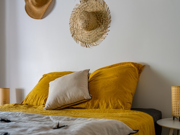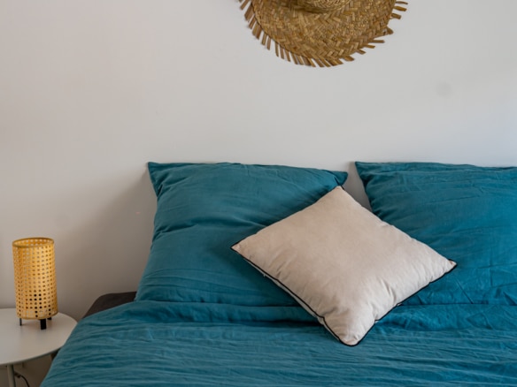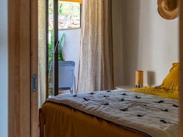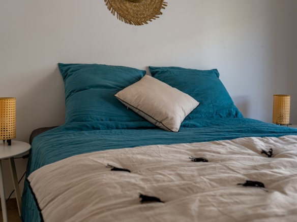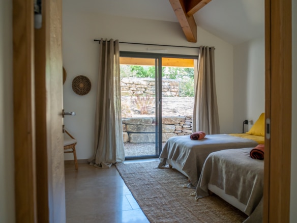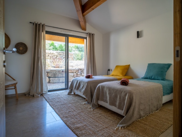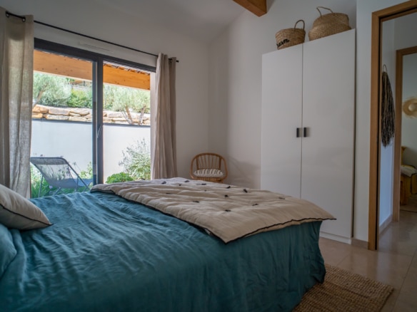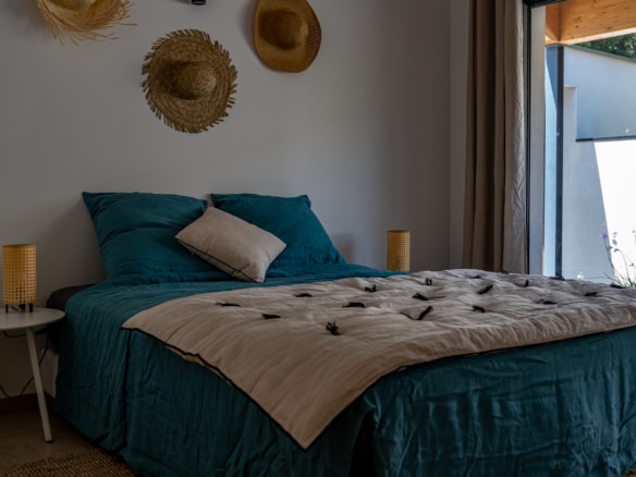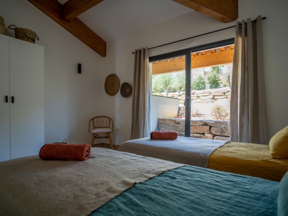 The ground floor also holds 3 bedrooms: 2 elegant double bedrooms tastefully decorated, with access to the garden, and one spacious room with 2 single beds. These rooms all share a full bathroom with both a bathtub and a shower. On the first floor, there is a large well-lit double bedroom with an extra single bed, equipped with air-conditioning and an en-suite shower room with marble tiling.