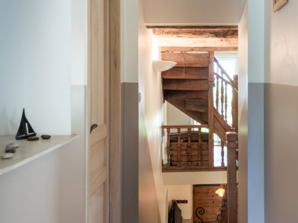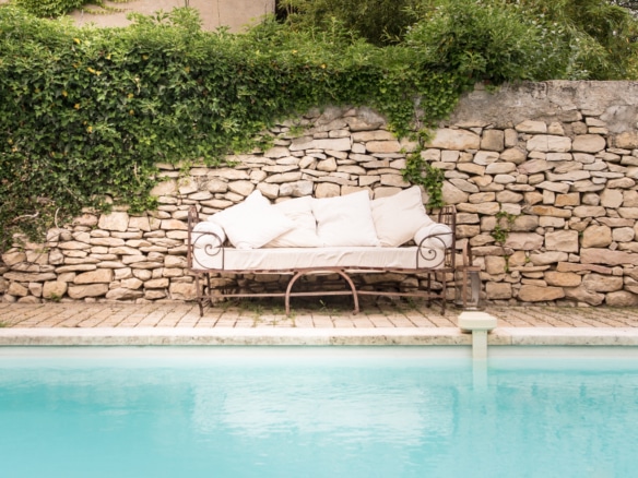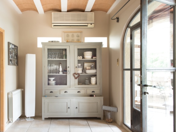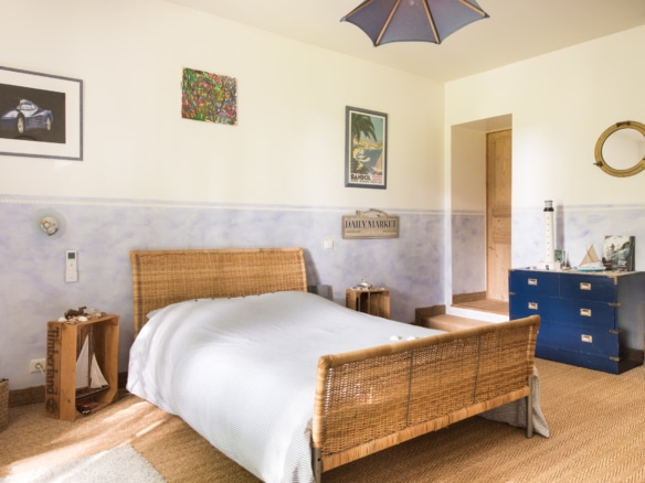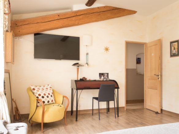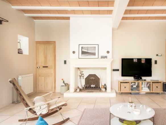 The house conveys a warm atmosphere drawn from a mixture of the house’s original features and modern furniture. Past the hallway, there is the large eat-in kitchen with a side-by-side fridge and freezer, which leads to a covered terrace equipped with another dining table. The large living room with its fireplace and flat screen TV is also equipped with large confortable sofas. Both the living room and the covered terrace open straight onto a pleasant terrace overlooking to swimming pool and the garden beyond.